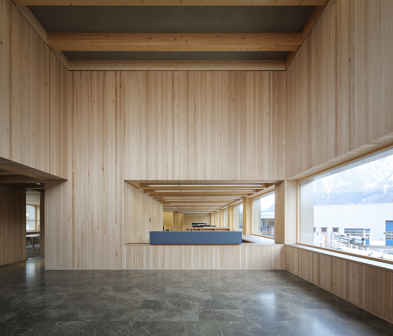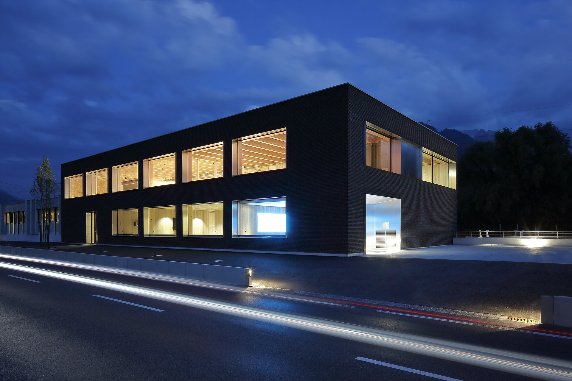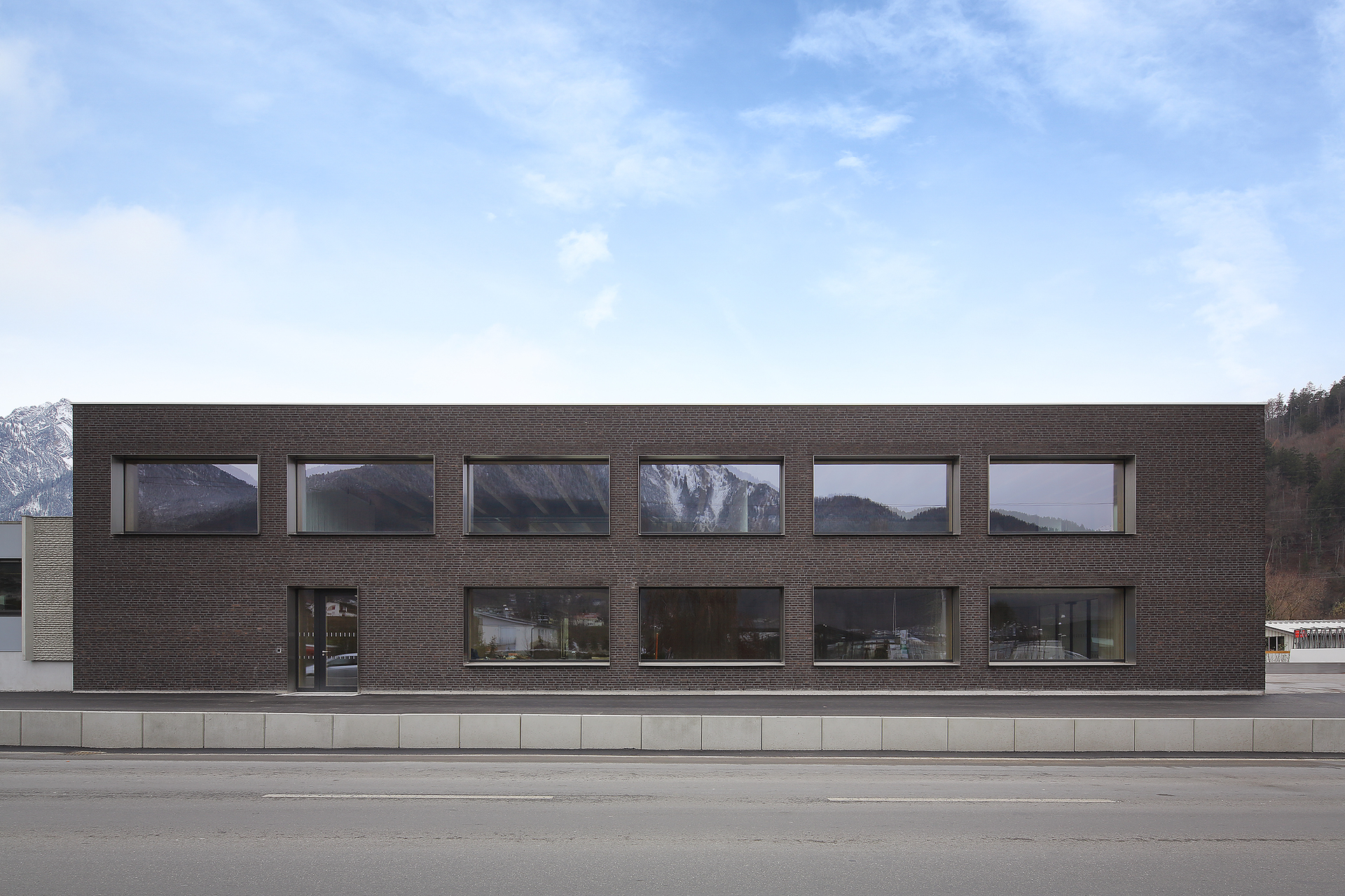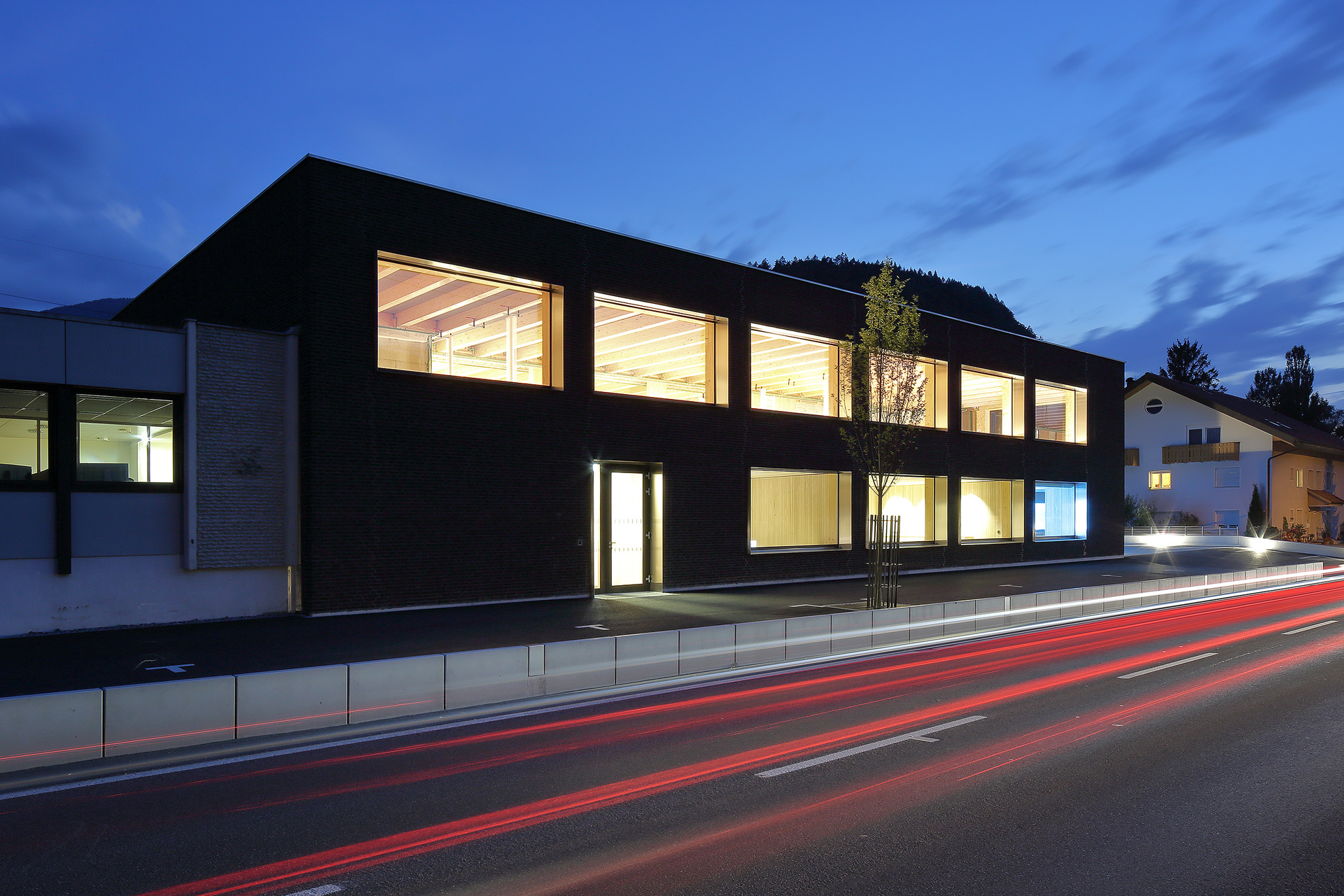 Über Stützenpaaren aus Leimbindern entlang der Fassaden und in der Gebäudemitte liegen drei Hauptträger mit eingespannten Sekundärträgern. Ein Deckenfeld ist ausgespart für den zweigeschoßigen Empfangsbereich. Sowohl für die sägerauen Wand- und Lüftungsverkleidungen als auch für die Möbel wurde Buchenholz verwendet. Die Fassade wurde auf Wunsch des Bauherrn als hinterlüftetes Sichtmauerwerk erstellt. Der niederländische Klinker bewirkt zusammen mit den von der Firma Wagner selbst gefertigten Chromstahl-Fensterlaibungen einen robusten Gesamteindruck. Die thermisch aktivierte Betondecke nutzt die offene Bauweise. In die Betonplatten eingelassene Rohre – ebenfalls von der Firma Wagner selbst erstellt und im Betonwerk eingelegt – sorgen dafür, dass die Masse des Betons als Wärmespeicher funktioniert. (Text: Tobias Hagleitner nach einem Text der Architekten)