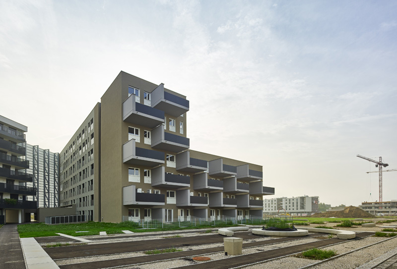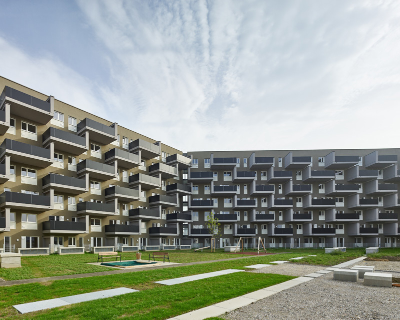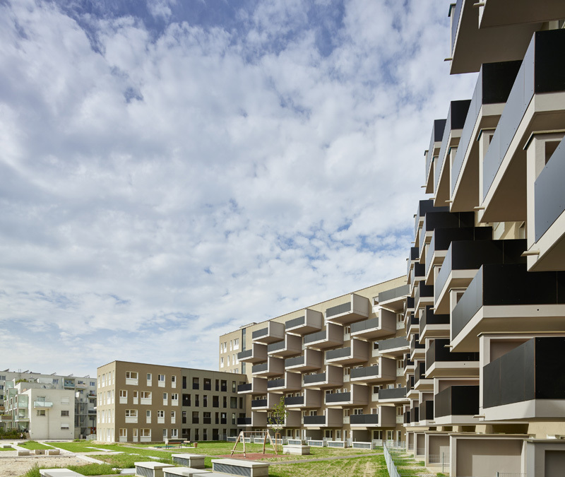 Den Wohnbereichen vorgelagerte Balkone als L-Profile zitieren die Metapher des hängenden Gartens. Eine visuelle Pflanzentreppe an den besonnten Fassaden erzeugt für die Bewohner luftige Gärten mit zweigeschossiger Höhe ebenso wie eine gewisse Intimität durch zweiseitige Wände.