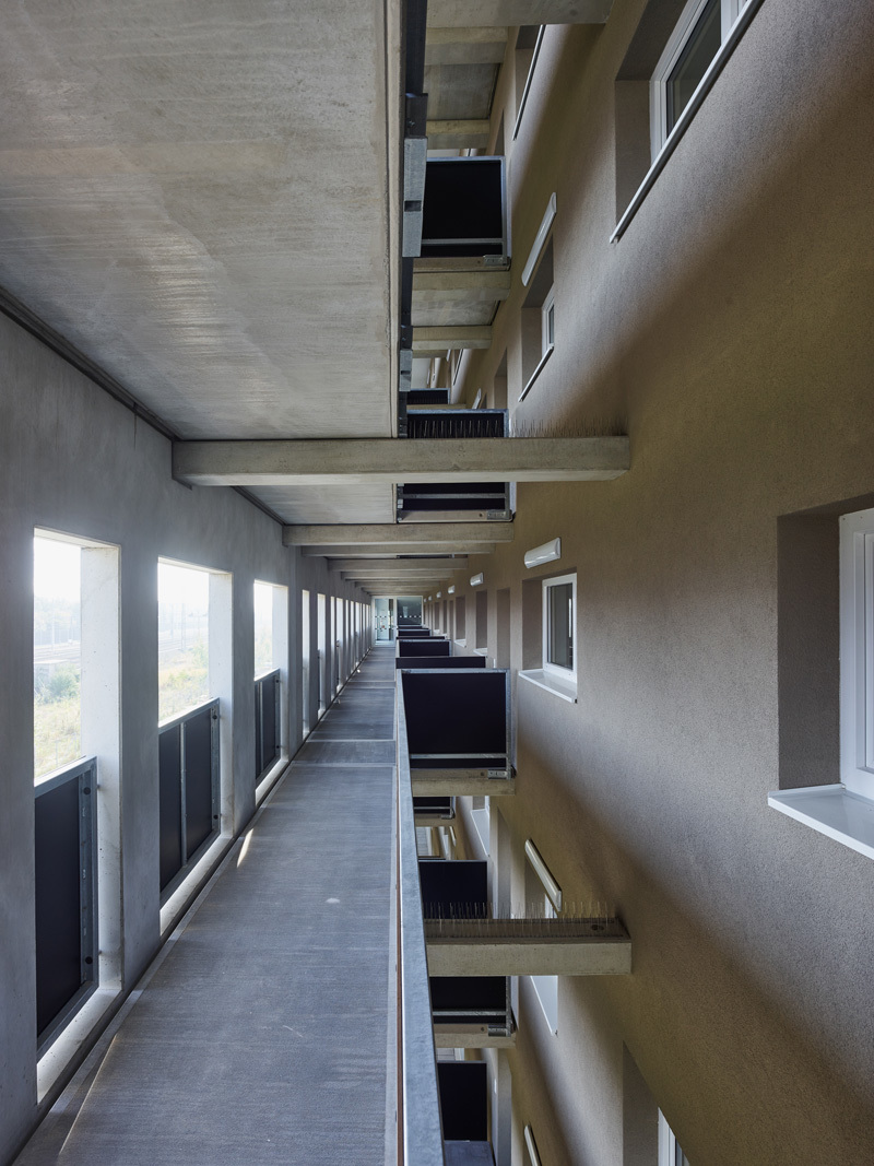 Über drei Treppenhäuser vertikal erschlossen führen Laubengängen zu den Wohneinheiten. Sie sind von der Fassade abgerückt, um Distanz zu den Fenstern aufzubauen und Licht von oben einfallen zu lassen. Vor den Zugängen entstehen halbprivate Brücken. Die Wohnungsgrundrisse erlauben durchgesteckte Wohnräume und sind flexibel unterschiedlichen Lebensphasen anpassbar. Kinderzimmer für Familien. Offene Loft für den Alleinstehenden. Büroraum mit Abtrennmöglichkeit und Bett für das Kind, das nach der Scheidung am Wochenende da ist. Zusammenlegung zweier Wohnungen für künftige Marktanpassung.