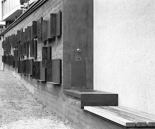 Gegliedert wird die insgesamt ca. 75 m lange Friedhofsmauer durch eine bis zur Stützmauer zurückreichende, mit einem Brunnen und einer Sitzmöglichkeit ausgestalteten Nische, in der auch das bestehende Kreuz und der Gedenkstein einen neuen Platz fanden. (Text: Claudia Wedekind)