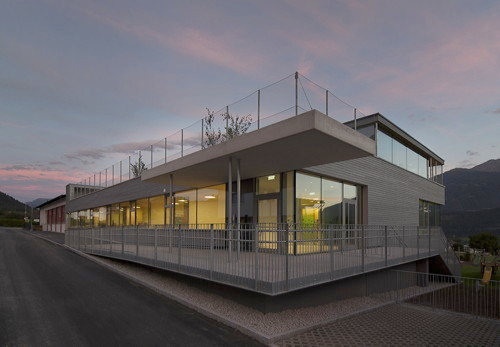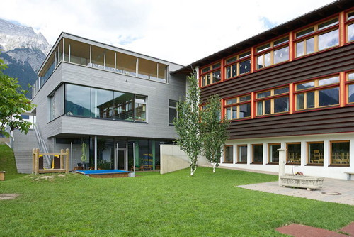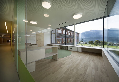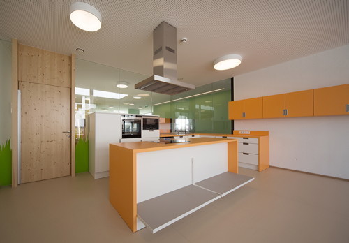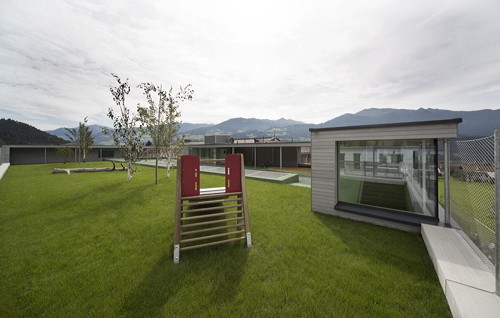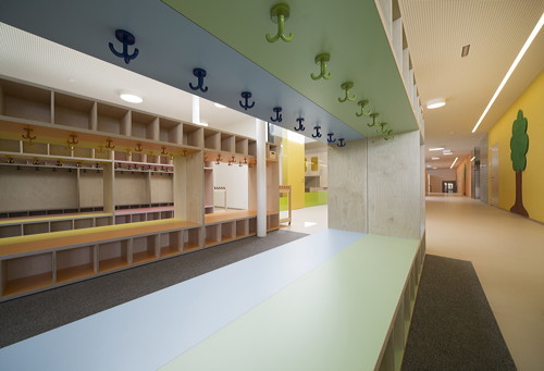 Vom Eingangsbereich aus kommt man auf die große Freifläche am Dachgarten, die sowohl über gedeckte Bereiche als auch über eine große Grünfläche verfügt. Der gegenläufige Treppenraum führt hinunter ins Untergeschoss, das aufgrund der Hanglage im Süden in den Garten mündet. Hier sind die zwei Bewegungsräume untergebracht, die – direkt an die Bereiche der Nachmittagsbetreuung der Volksschule angebunden – ideal von den größeren Kindern mitbenutzt werden können. Flexible Glastrennwände bringen das Licht bis in den hintersten Bereich und erlauben es gleichzeitig, beide Räume zu einer Einheit zusammenzulegen, die vom ganzen Haus als Veranstaltungsfläche genutzt werden kann. Bestand und Neubau wurden zudem über weitere Maßnahmen zu einer Einheit zusammgenfügt: Im Erdgeschoss gibt es eine direkte Verbindung zum Turnsaal, an der Schnittstelle zwischen dem neuen Kinderbetreuungszentrum und der Volksschule wurde ein Lift situiert, der für beide Einrichtungen Barrierefreiheit gewährleistet und von der Eingangsrampe aus führt eine Freitreppe hinunter in den Schulgarten. (Text: Claudia Wedekind)