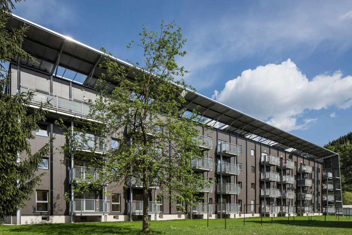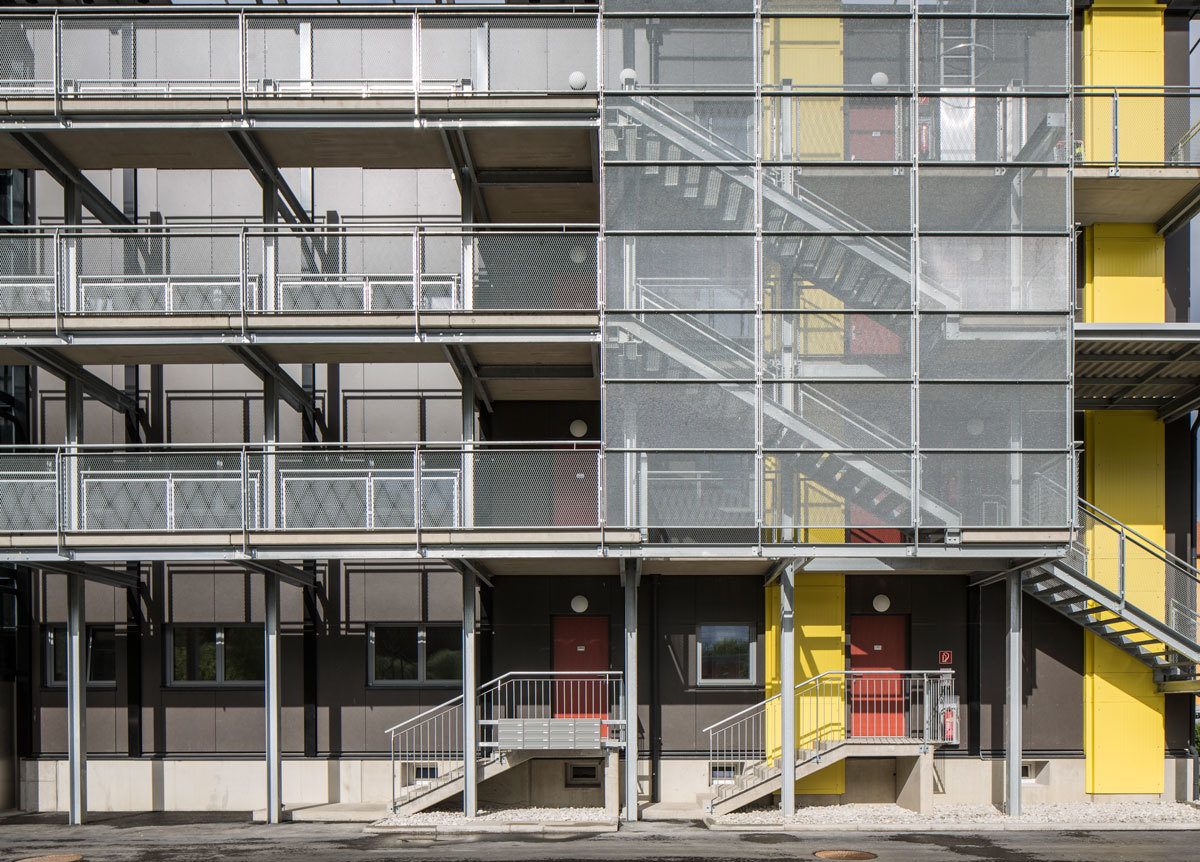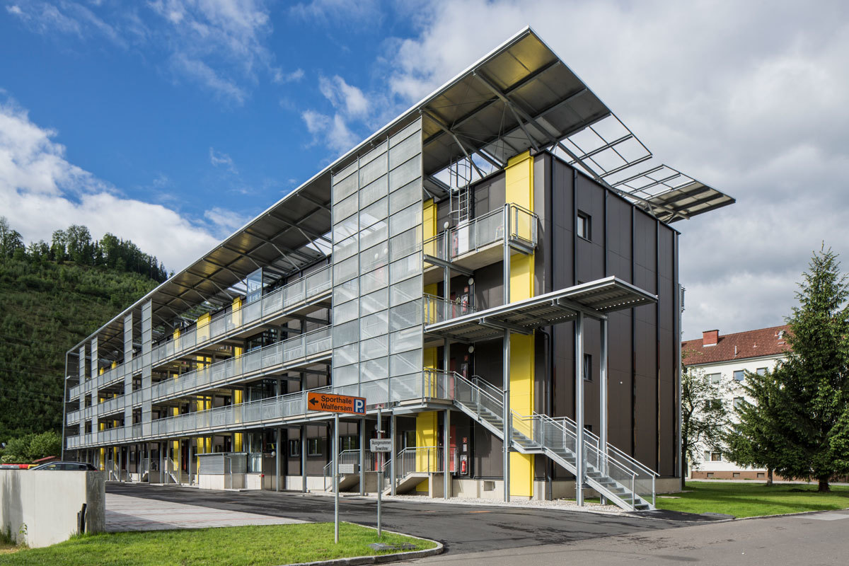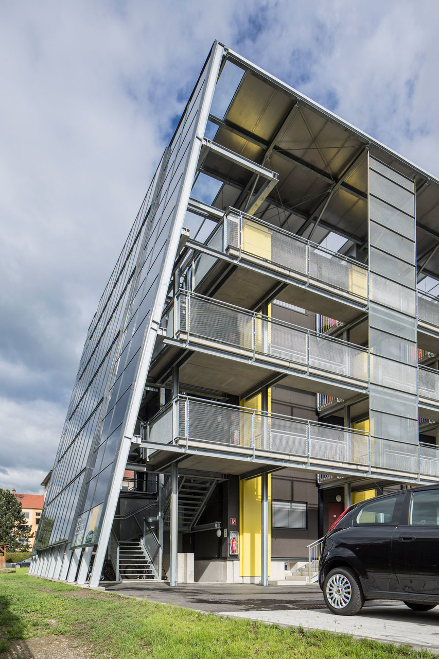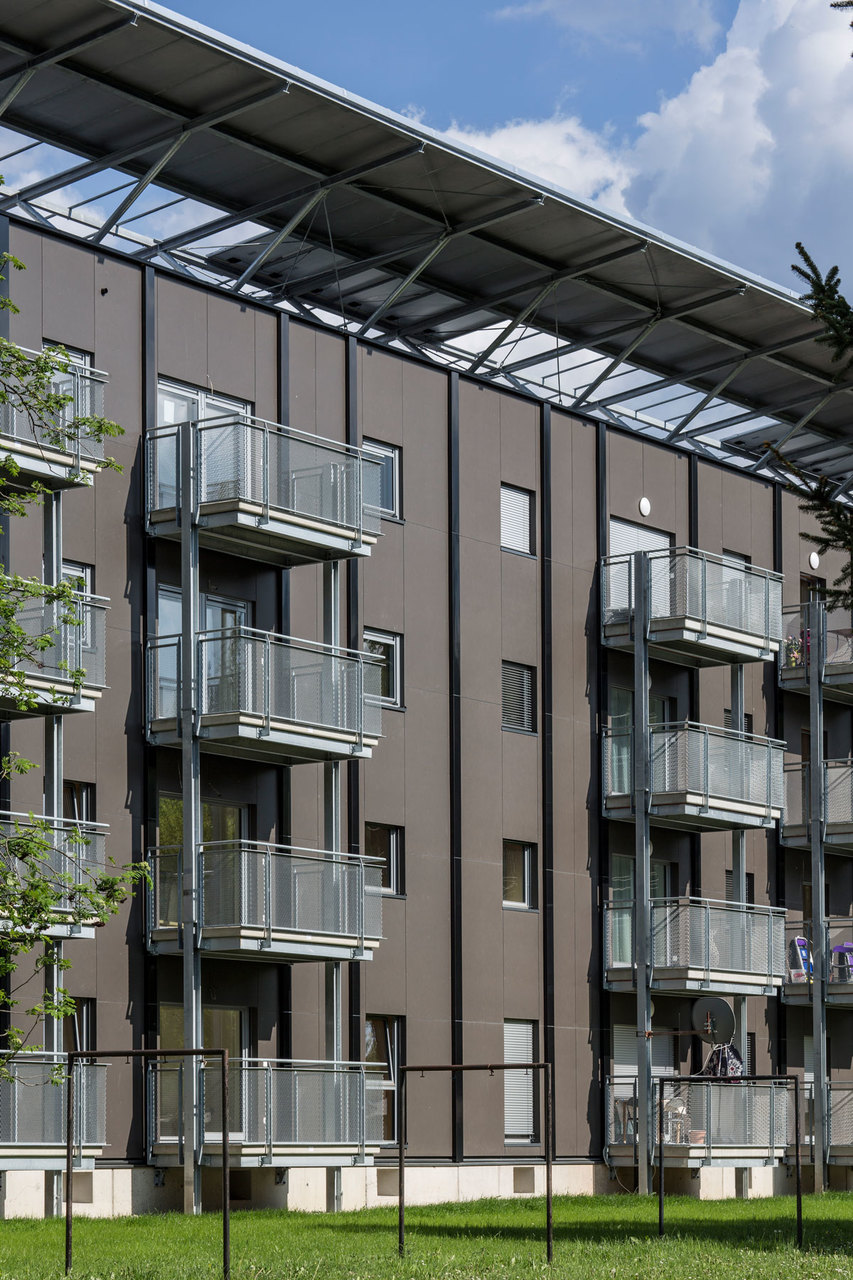 Die vorgesetzten Stahlkonstruktionen der Balkone und der Erschließungszone lockern das sonst sehr schwere und sperrig wirkende Erscheinungsbild auf, das Dach wirkt in seiner Ausführung beinahe schwebend. Versorgungsschächte und Photovoltaikelemente strukturieren durch ihre regelmäßige, vertikale Anordnung und der farblichen Differenzierung das Fassadenbild. Die technische Adaptierung des Gebäudes wird nicht wie oft üblich durch eine konventionelle Hülle versteckt, sie wird nach außen hin präsentiert und ist Teil der Architektur - Die Funktion verleiht dem Projekt erst sein Gesicht.