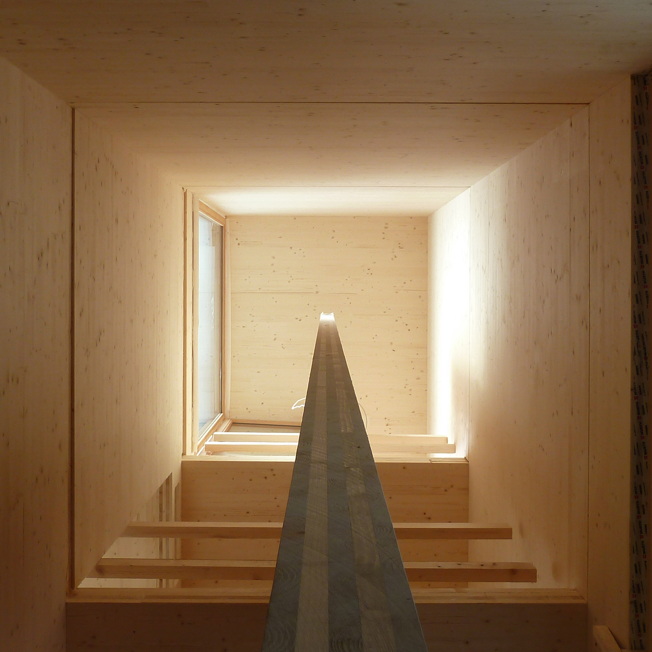 Die zwei Turmhäuser sind über vier Geschosse organisiert: UG - Wellness und Technik, EG - Schlafen, OG - Kochen und Wohnen, DG - Ausblick; mit einem kompakten Erschließungskern und einer Hebebühne als barrierefreie Minimallösung.