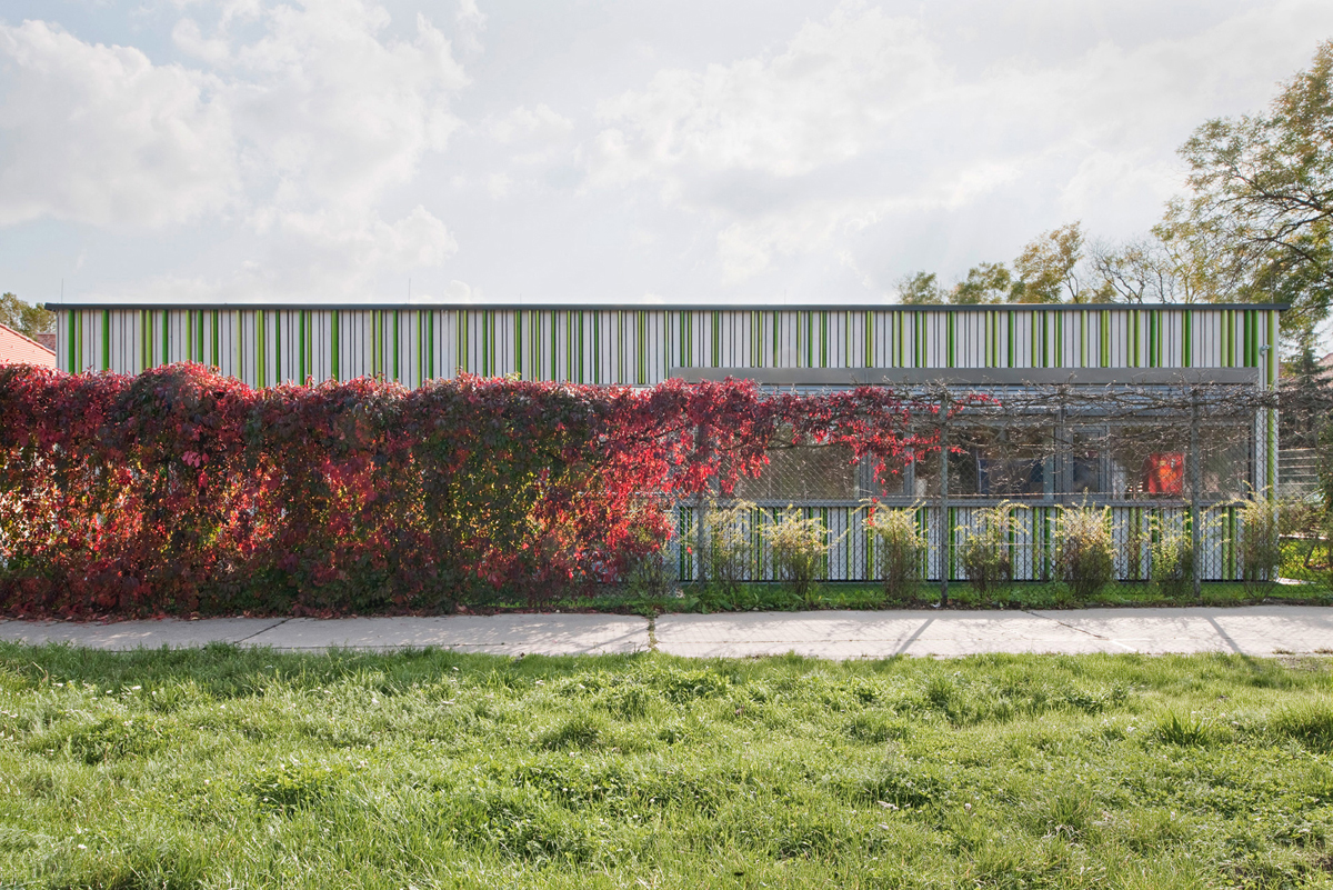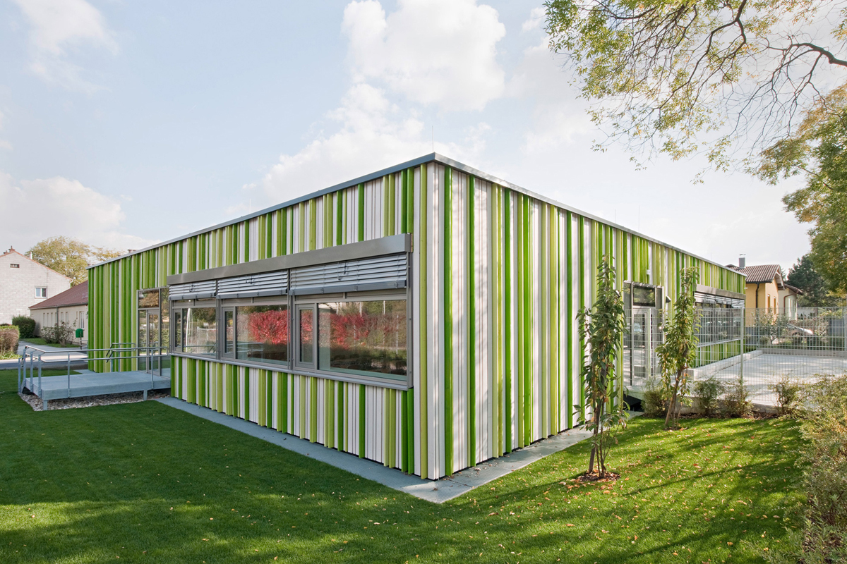 Dem Wunsch nach möglichst kurzer Bauzeit wurde mit einem modularen System sich wiederholender Raumelemente entsprochen: Klassen, zwischengeschaltete Garderoben, die als zusätzlicher Aufenthaltsraum genutzt werden können, und Sanitärzellen. Windmühlenartig gruppieren sie sich um den zentralen, natürlich belichteten Erschließungsbereich, der als Foyer dient. Hier sorgen die Verglasungen für Sichtbeziehungen und Lichtstimmungen, während in den Klassen der Gestaltungsschwerpunkt auf Vermittlung von Konzentration und Ruhe gelegt wurde. Die direkte Austrittsmöglichkeit von den Klassenräumen über die Garderobe ins Freie entspricht dem Ursprungsgedanken der „Freiluftschule“.