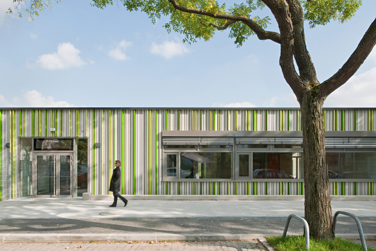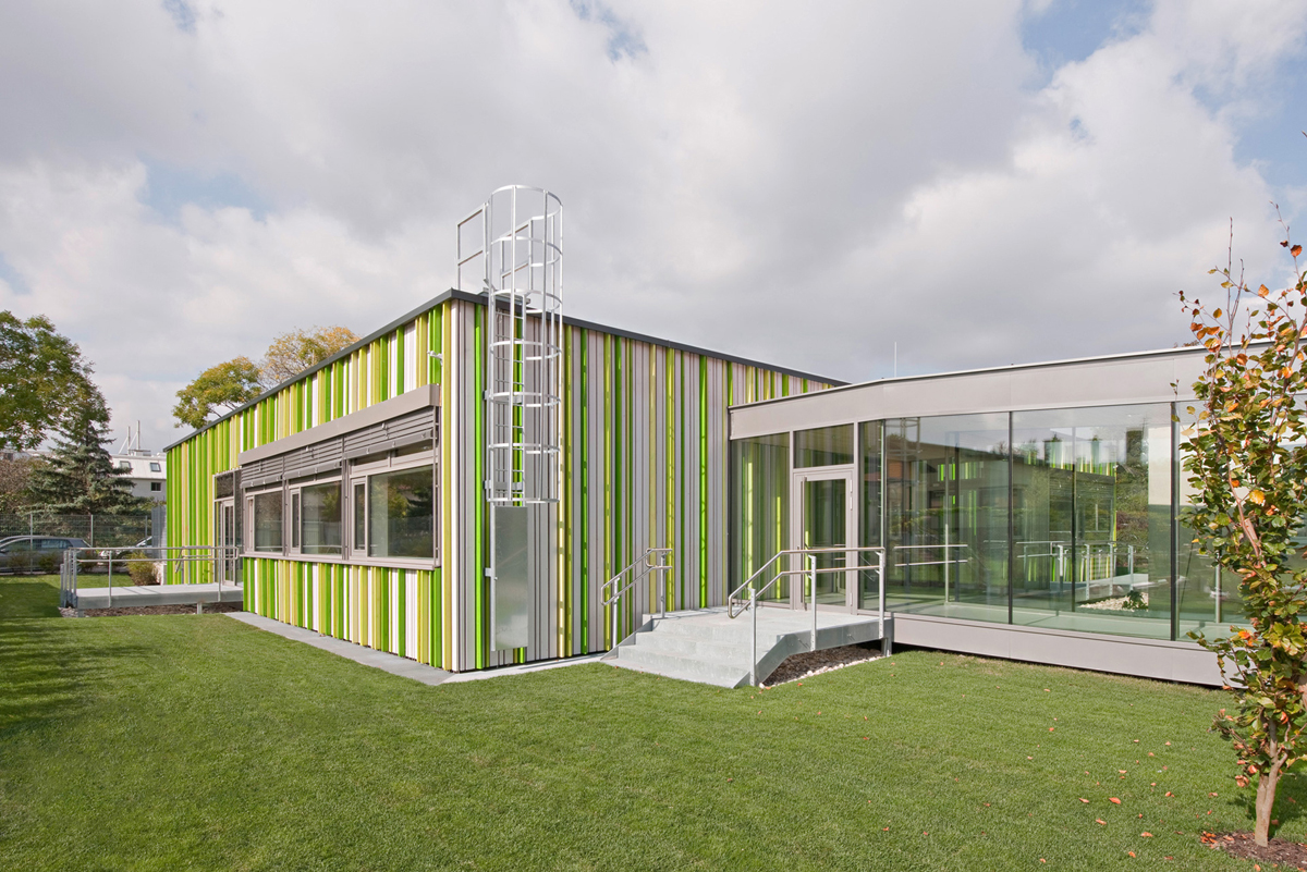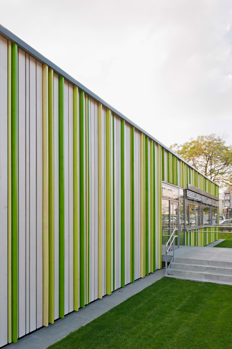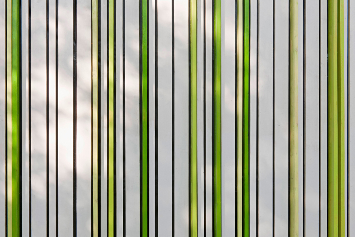 Die hinterlüftete Fassade ist als vertikale Holzlamellenkonstruktion in Lärche ausgeführt. Unterschiedlich breite und tiefe Latten in verschiedenen Grüntönen ergeben je nach Lichtstimmung und Position vielfältige Farbwahrnehmungen für den vorbeigehenden Betrachter.