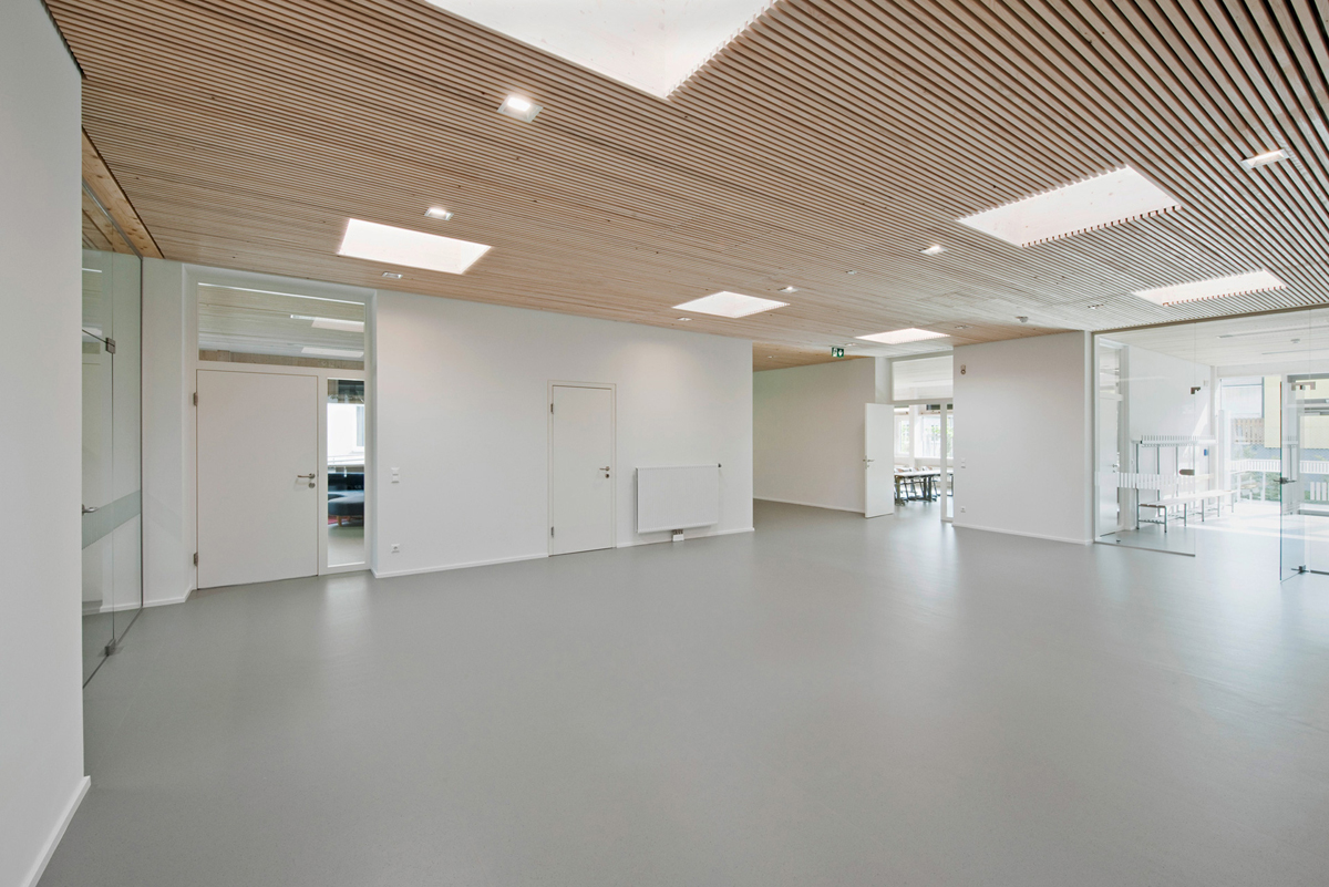 Das Foyer ist mit weißen Gipskartonplatten beplankt, in den Klassen sind die Wände als weiß lasierte Holzoberflächen sichtbar gelassen. Eine durchgehende Lamellendecke aus unbehandelter Weißtanne und der Kautschukbelag in den Aufenthaltssbereichen harmonisiert die unterschiedlichen Raumnutzungen und vermittelt freundliche Lern- und Raumatmosphäre.