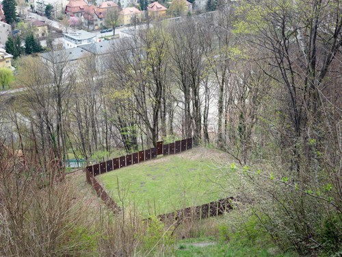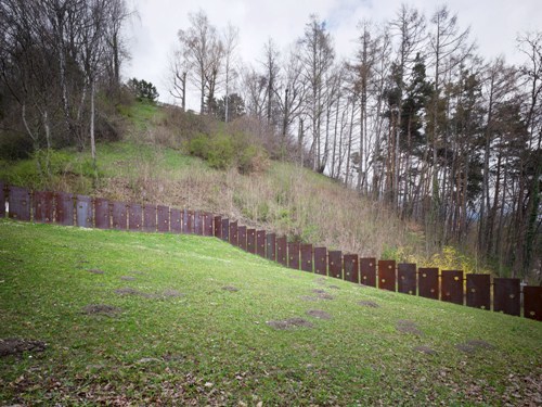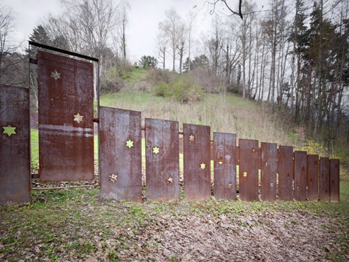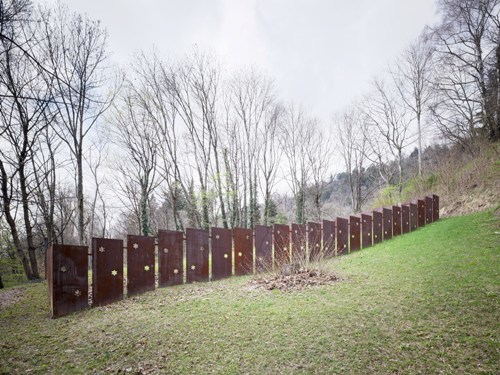 Mit der Einfriedung des ehemaligen jüdischen Friedhofs auf dem in unmittelbarer Nähe vom Alpenzoo liegenden Judenbühel wurde dieser in Vergessenheit geratene Ort jüdischer Geschichte Innsbrucks als Gedenkstätte sichtbar gemacht. Nur mehr der Name erinnerte daran, dass sich hier – weit außerhalb der Stadt und im Winter kaum zugänglich – seit dem Ende des 15. Jahrhunderts der Beerdigungsplatz der jüdischen Bevölkerung Innsbrucks befand. Nach mehreren Schändungen im 19. Jahrhundert wurde der Friedhof verlegt und an den Innsbrucker Westfriedhof angeschlossen. Die alten Friedhofsmauern wurden abgerissen, die Gräber zum Teil verlegt und der Boden eingeebnet – der Friedhof und seine genaue Lage gerieten in Vergessenheit.Nach archäologischen Grabungen, durch die die alten Umfassungsmauern bestimmt werden konnten, übernahmen Ada und Reinhard Rinderer in Zusammenarbeit mit dem Archäologen- und Historikerteam die architektonische Neugestaltung der Anlage. Ausgehend von diesem leeren Ort, an dem alles, was von der Vergangenheit geblieben war, unsichtbar unter der Erde liegt, schufen sie eine Einfriedung, die den Platz einfasst und den ursprünglichen Verwendungszweck der Waldlichtung sichtbar macht und zugleich den darunter liegenden Gräberfeldern und Resten der alten Friedhofsmauer Schutz bietet. In einem Sicherheitsabstand von 60 Zentimetern von der ehemaligen Mauer entfernt wurden an drei Seiten – die vierte Seite ist wegen Hangrutschungen nicht mehr vorhanden – schlichte, freistehende Stahlplatten gesetzt, die in ihrer Höhe den Geländeverlauf nachzeichnen. Je nach Blickrichtung bilden die eng aneinander gesetzten Platten eine geschlossene oder eine durchlässige Begrenzung mit variierendem Licht- und Schattenspiel. Jede der Cortenstahlplatten trägt zwei Ausfräsungen in Form des jüdischen Davidsterns, beim ursprünglichen Friedhofseingang zeichnet eine gleichartige, in einem Rahmen erhöht befestigte Stahltafel die Eingangstür nach. (Text: Claudia Wedekind)