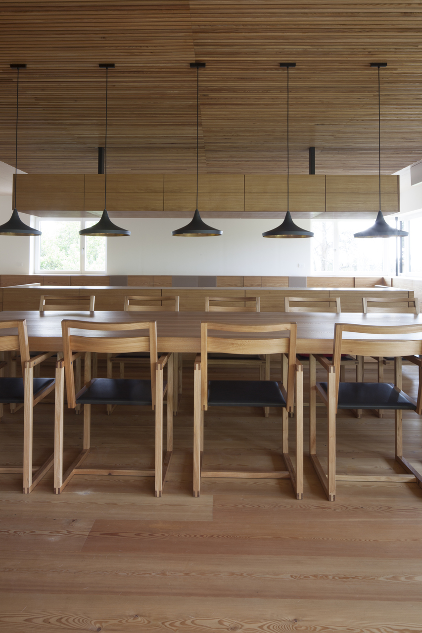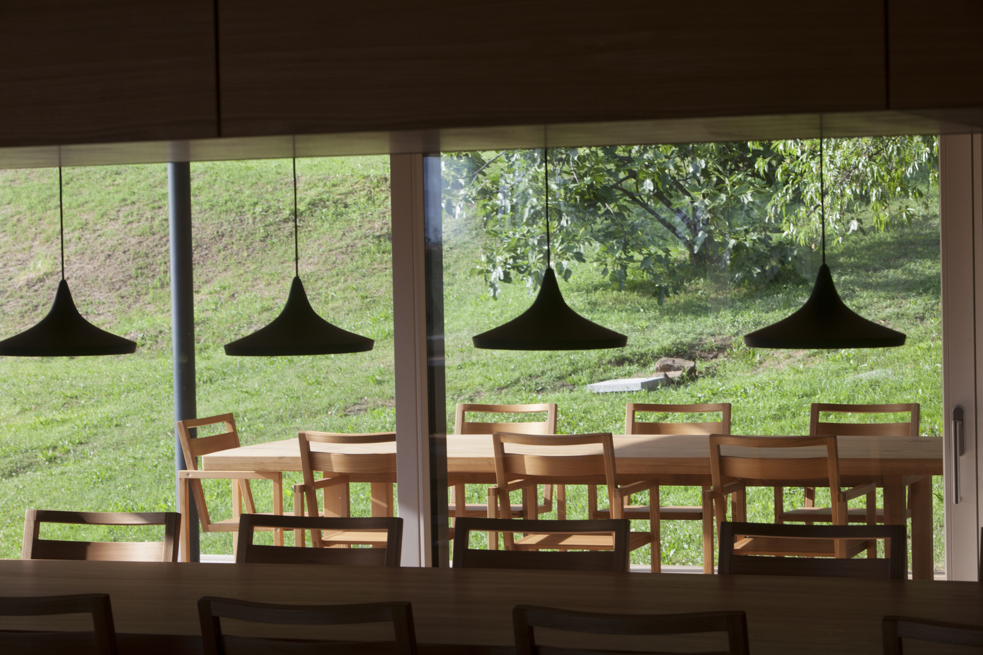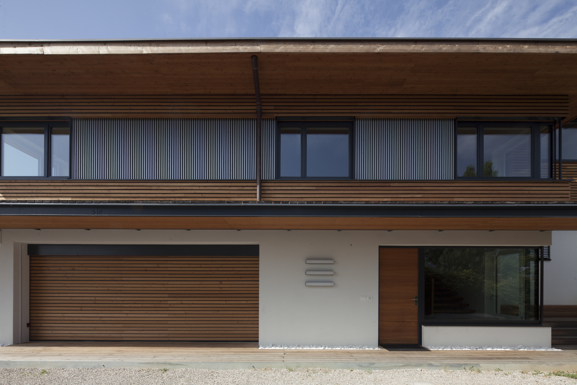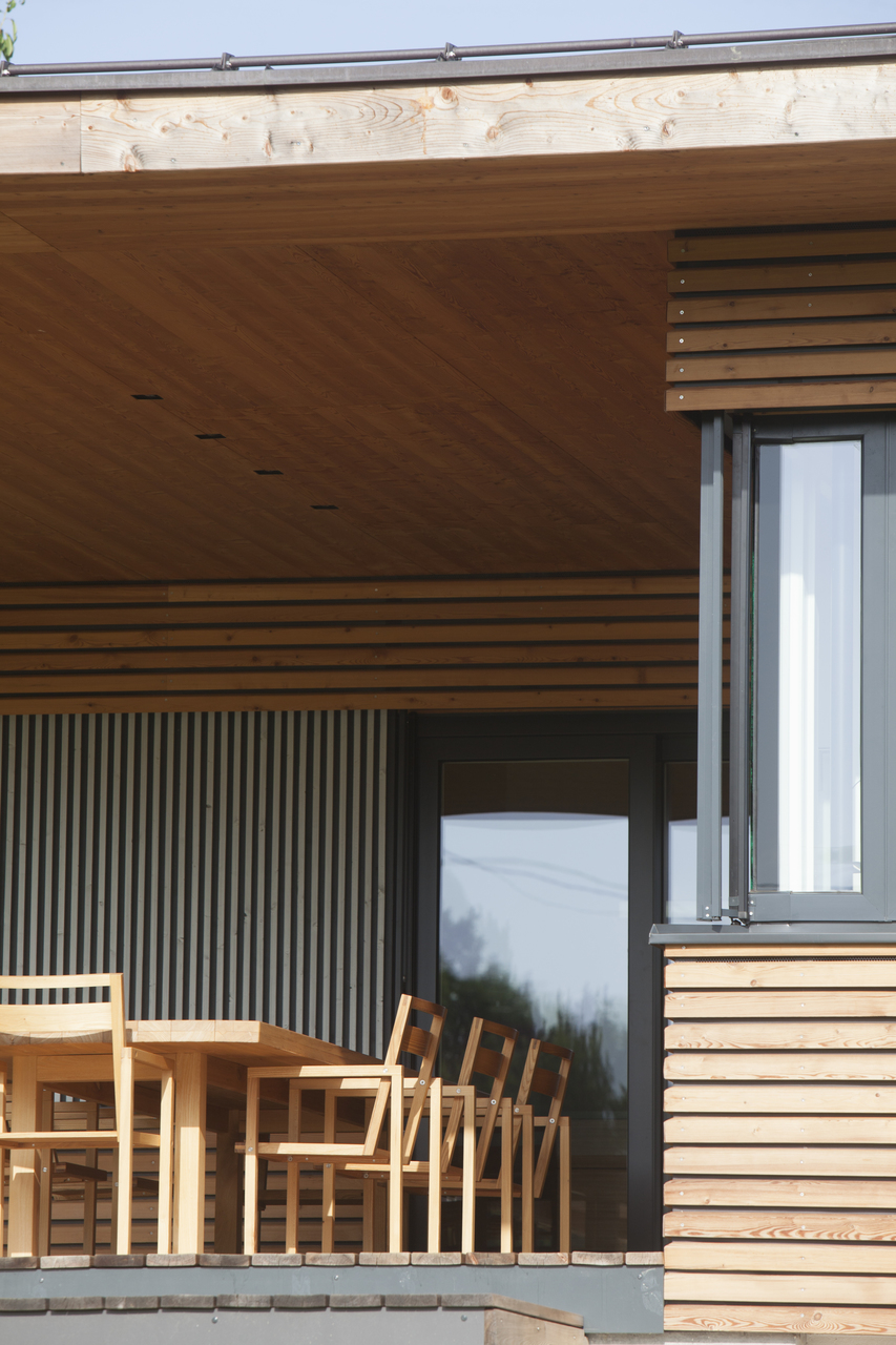 Das Haus wurde in einer Brettsperrholzkonstruktion errichtet, wobei die Innenwände verputzt und die Decken weiß lasierend geölt sind. Der Wohnraum ist mit Überzügen stützenfrei gehalten. Die Wärmedämmung besteht aus Holzweichfaserplatten, die hinterlüfteten Fassaden aus Lärchenlatten natur bzw. gestrichen. (Text: Architekt)