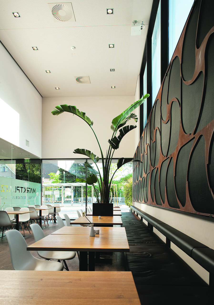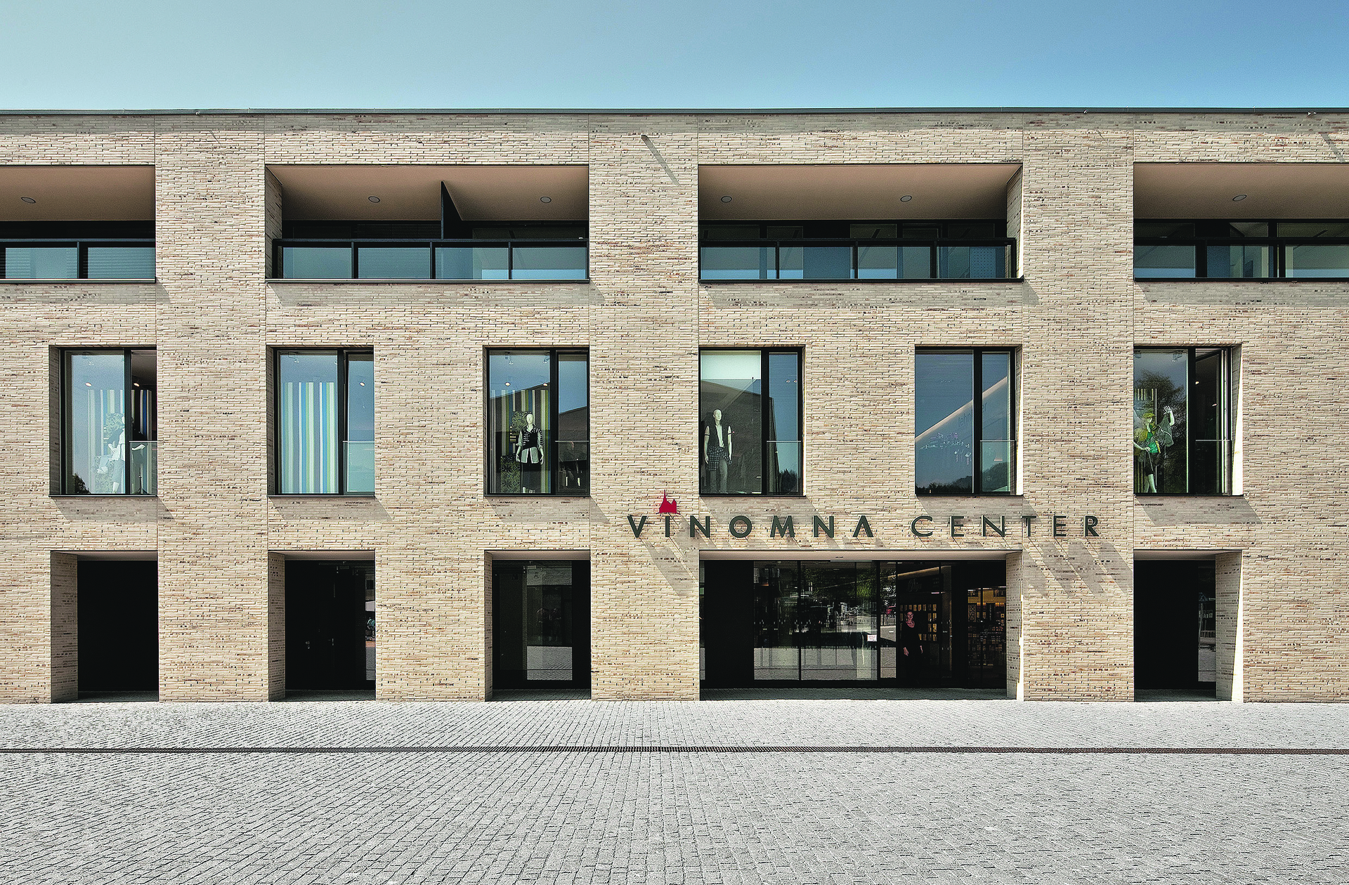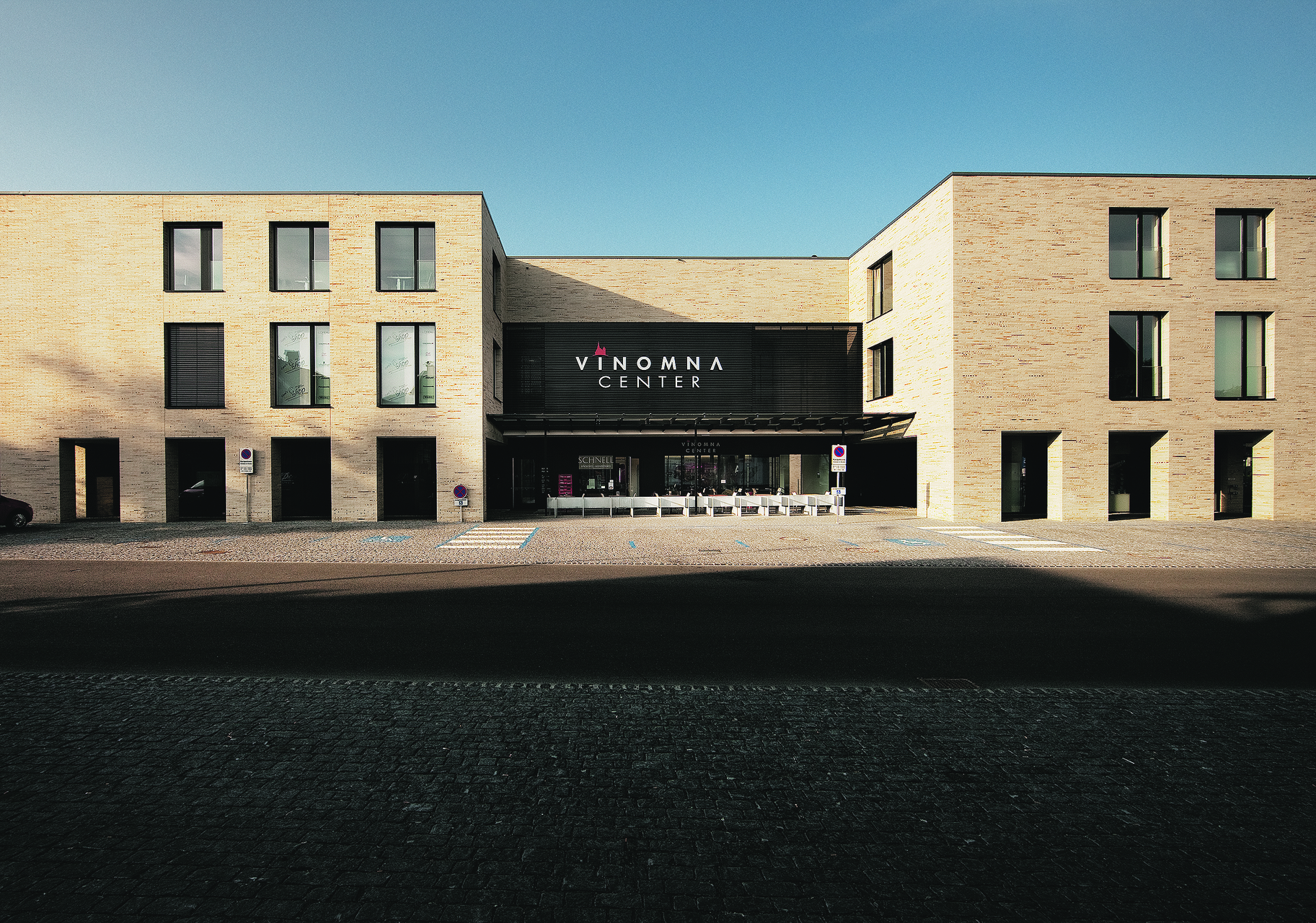 Der kleinere Bauteil des Vinomna Centers nimmt die Bauflucht des angrenzenden Bestandsgebäudes auf, wodurch sowohl ein Platz nach Norden zur Bahnhofstraße als auch südseitig Richtung Marktplatz entsteht. Das Satteldach und die Fassadengestaltung in Dickputz in der Farbe der Backsteinfugen des Vinomna Centers I betonen die Eigenständigkeit des Gebäudes. Das Restaurant im Erdgeschoss bedient sowohl den Marktplatz als auch den Platz an der Bahnhofstraße. Eine ebenerdige Verkaufsfläche erweitert das Shopangebot des Vinomna Centers. Im 1. Obergeschoss befinden sich Büros und Praxen, im Dachgeschoss drei Wohnungen. (Text: Julia Ess nach einem Text der Architekten)