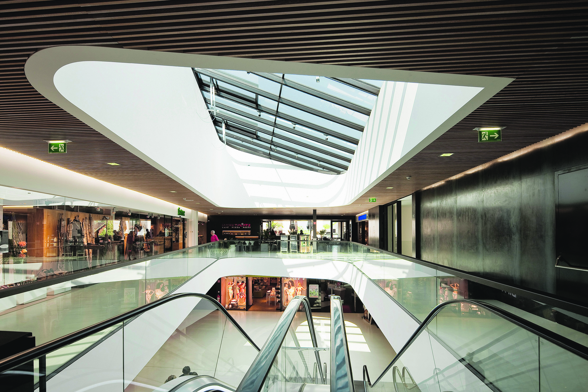 Der westlich gelegene, größere Bauteil ist parallel zur Bahnhofsstraße positioniert und als dreigeschossiger Flachbau mit einer beigen Backsteinfassade gestaltet. Tiefe Einschnitte im Erdgeschoss bilden nord- und ostseitig arkadenartige Umgänge und im zweiten Obergeschoss nach Osten und Süden orientierte Balkone aus. Die Geschäfte und Dienstleister im Erd- und Obergeschoss sind um einen großzügigen, zentralen Luftraum angeordnet. Ein großes Oberlicht über dem Zentrum der Mall ermöglicht eine taghelle, natürliche Belichtung. Zwei Fahrtreppen verbinden die beiden Verkaufsebenen. Als Erschließung zwischen den Untergeschossen und dem Einkaufsgeschoss dient ein Treppenhaus mit Panoramalift. Ein weiteres Stiegenhaus mit Lift verbindet die private Tiefgarage mit den acht Wohnungen im 2. Obergeschoss.