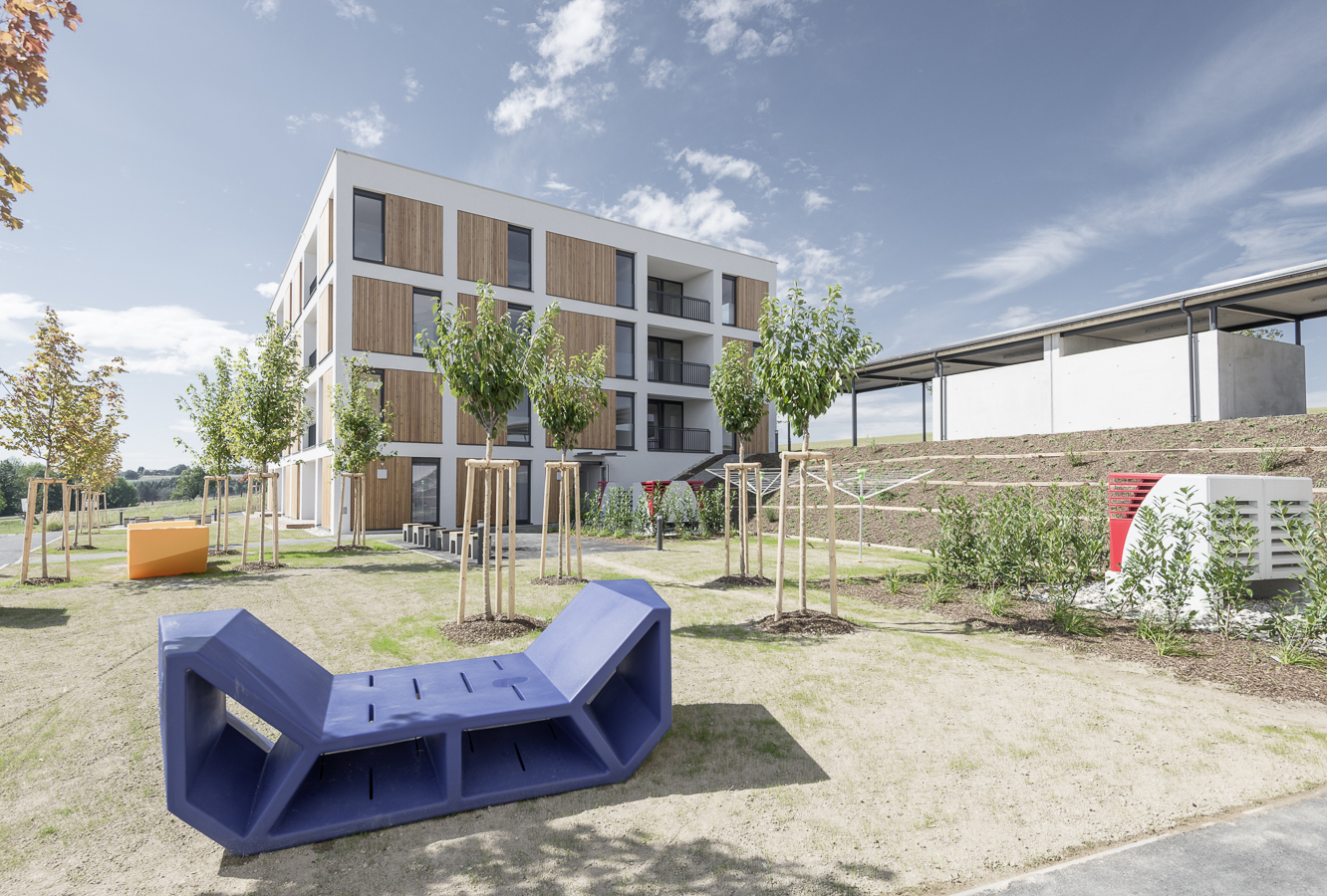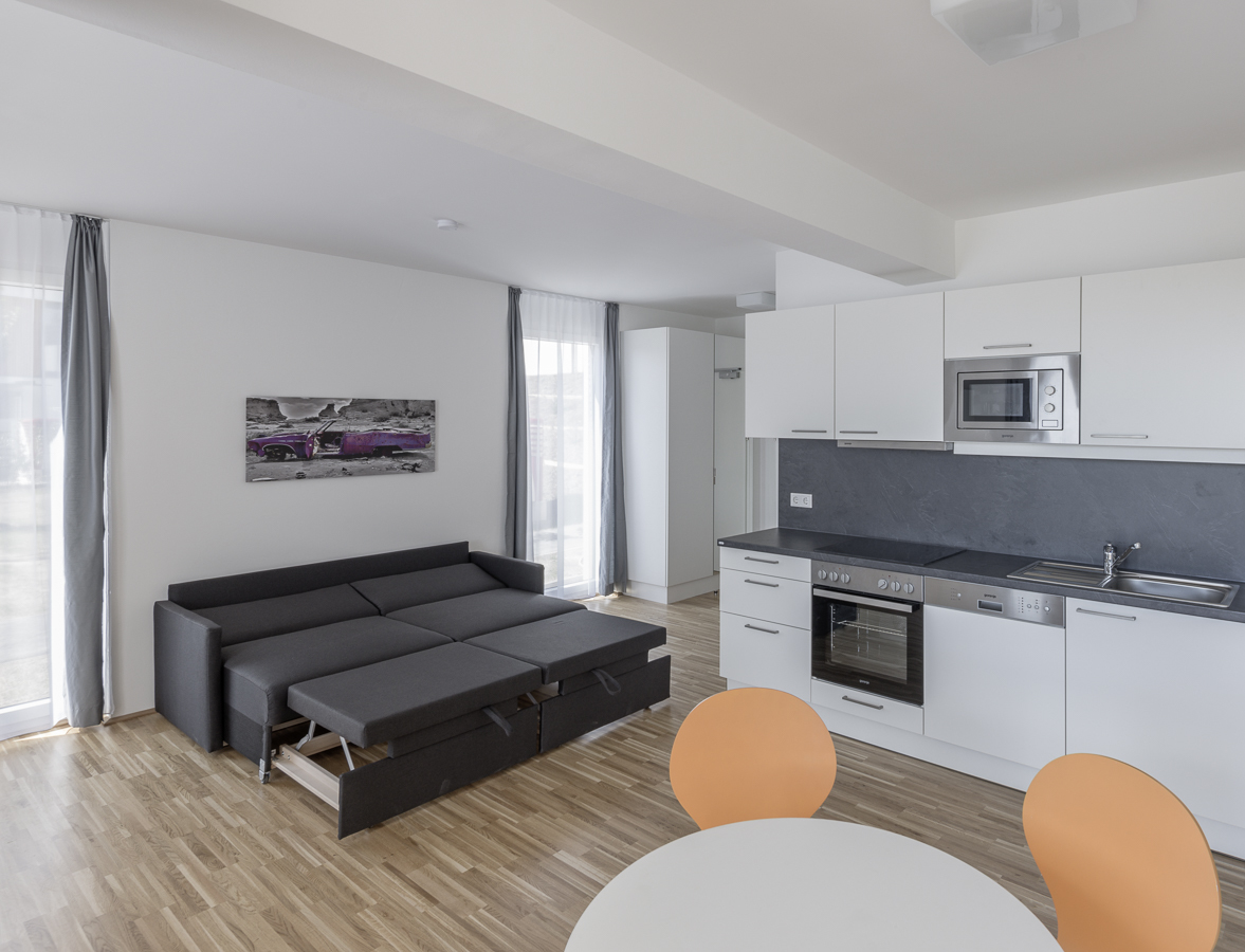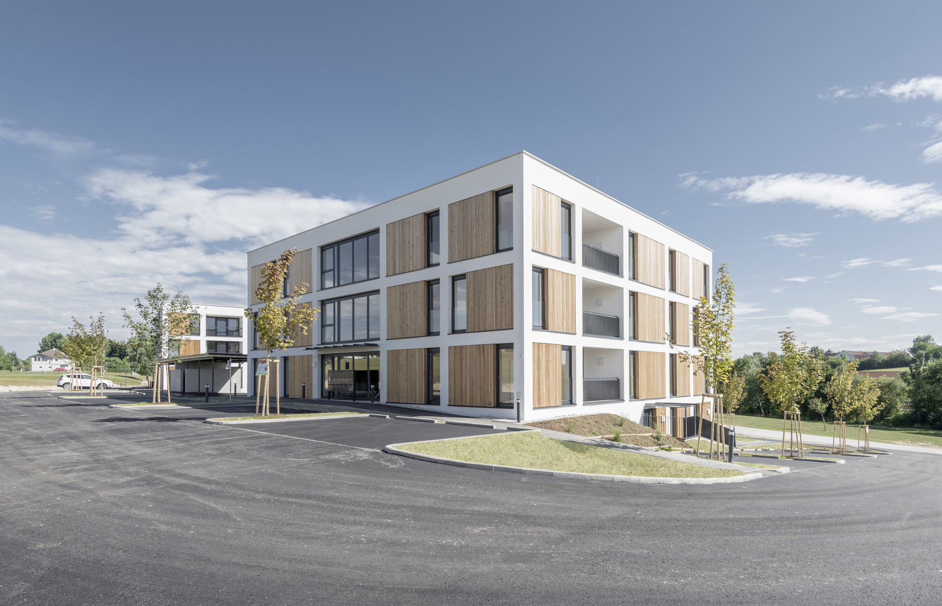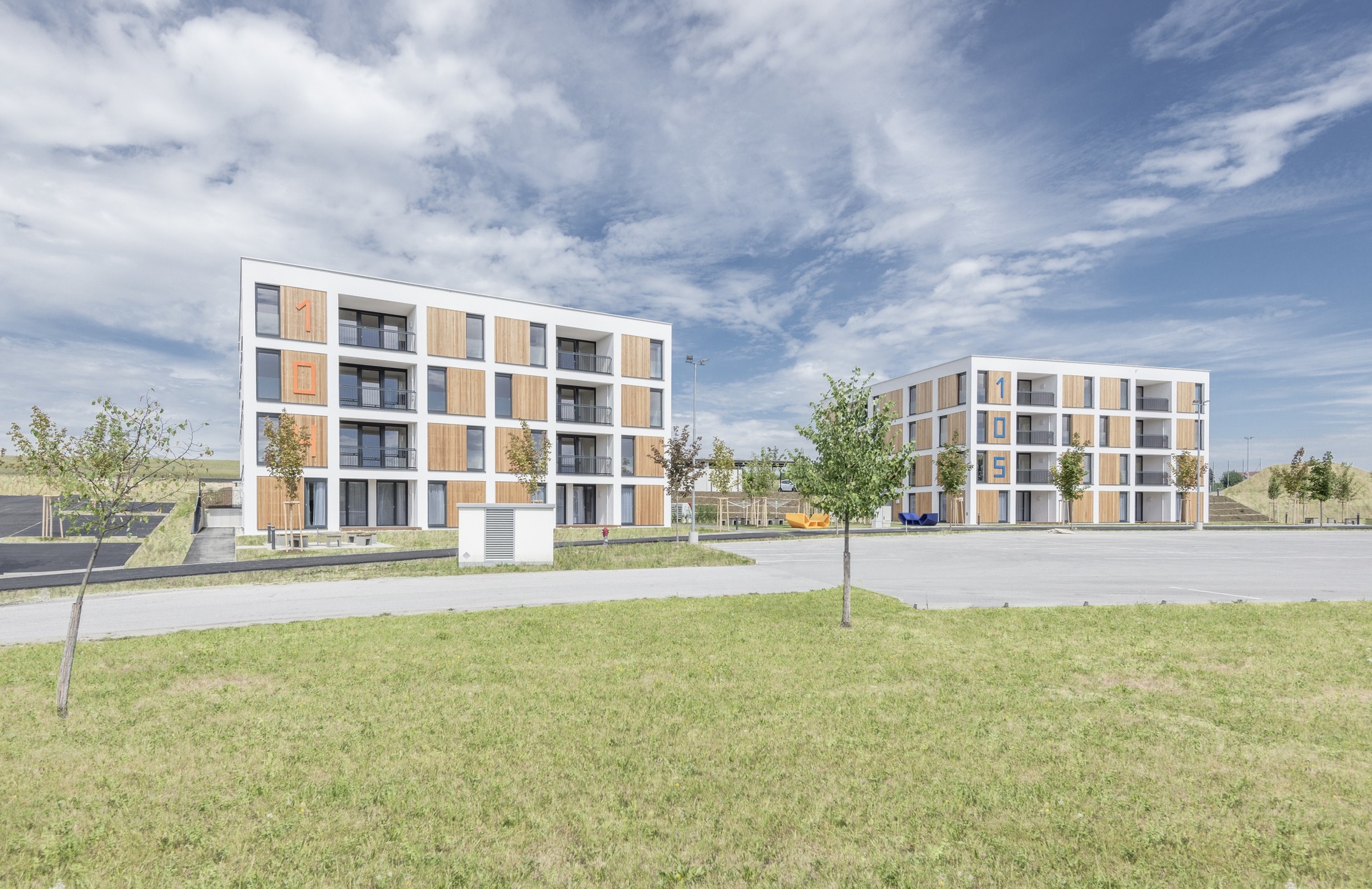 Die Lage ist einmalig: Die zwei Wohnhäuser direkt im Grünen am Rand von Hagenberg und 50 Meter vom Teich sowie der Sporthalle entfernt, bieten nordseitig Parkplätze und südseitig einen Garten zum Durchatmen. Der viergeschossige Neubau wurde im Süden in den Hang gebaut. Den Architekten gelang mit dem Massivbau durch die vorgehängte Holzfassade und den durchgehenden Vollwärmeschutzraster an der Fassade eine Balance mit der Landschaft. In den neuen Studentenwohnhäusern wird für die Studierenden mehr Komfort geboten als in bisherigen Studentenwohnheimen. Architekten