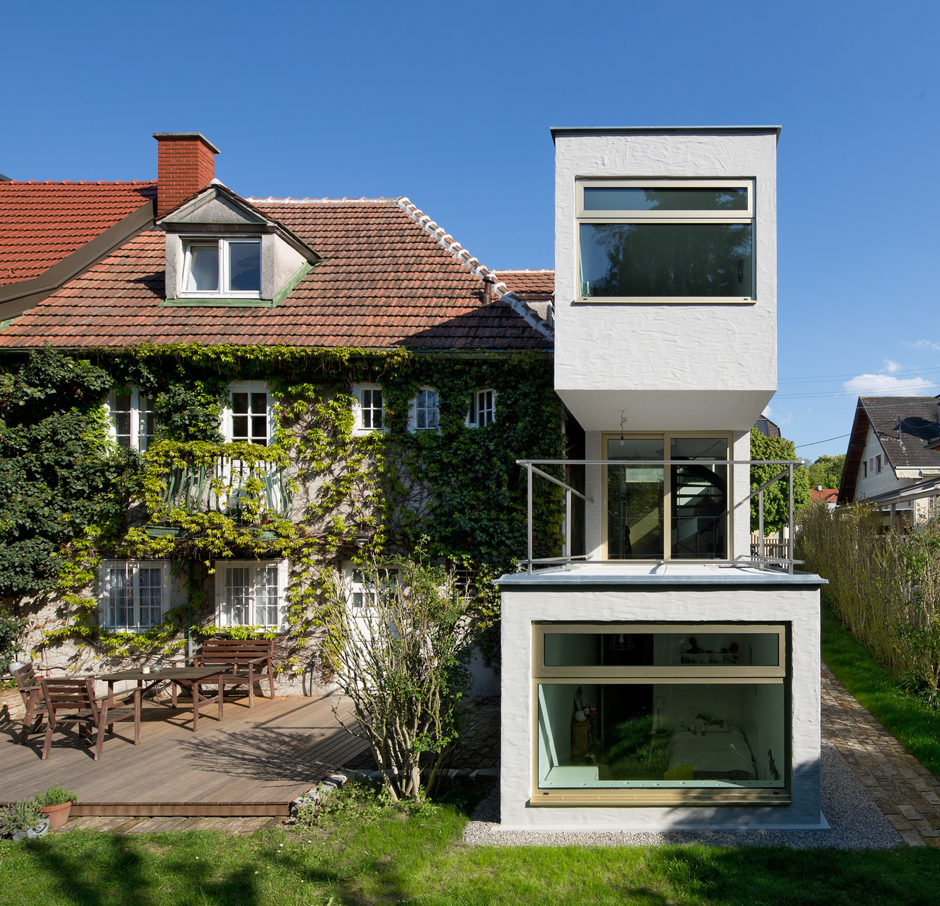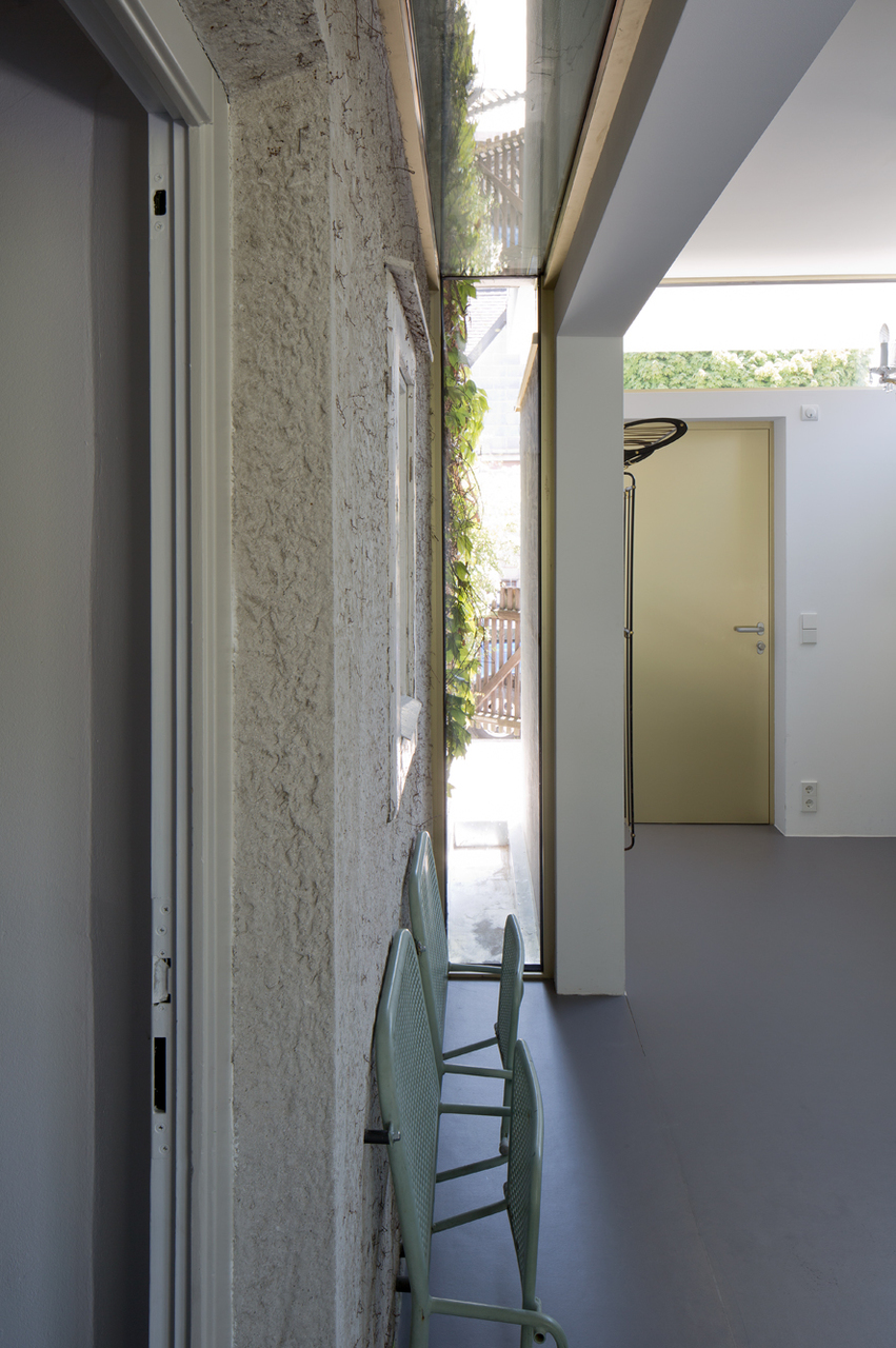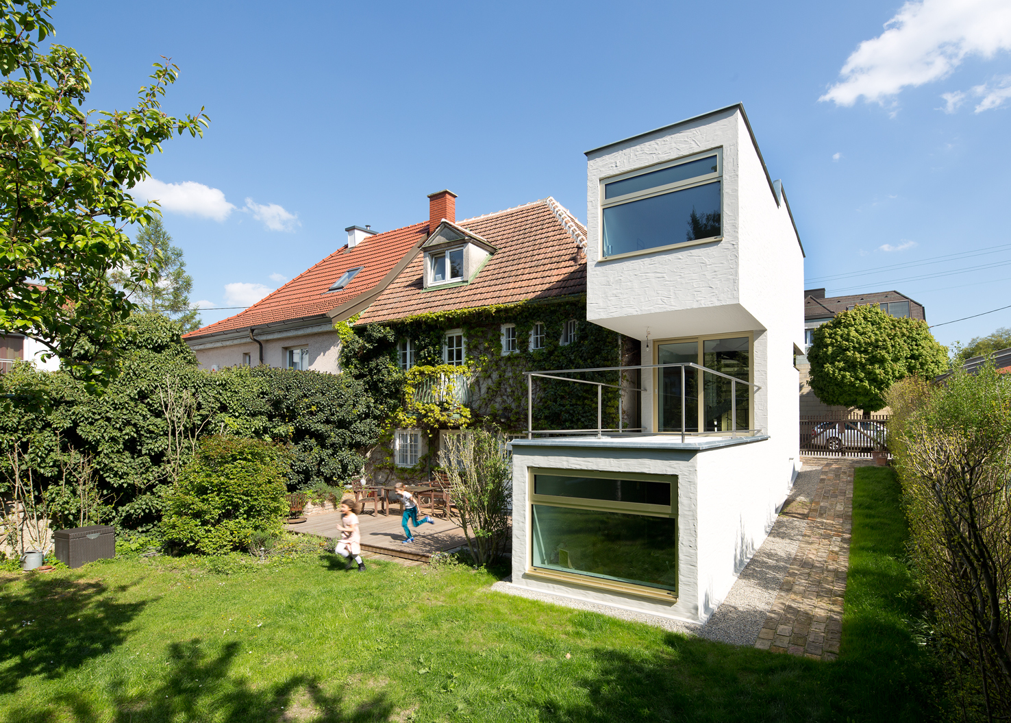 Die Raumanforderungen und das Bestandsobjekt aus dem Jahre 1926, welches an ein englisches Cottage Haus erinnert und in einem über Jahren gewachsenen Garten steht, ließen relativ schnell erkennen, in welche Richtung sich das Projekt entwickeln sollte. Die Prämissen waren vom Anfang an klar, der Garten sollte weitestmöglich unberührt bleiben, ebenso das mit wilden Wein bewachsene Bestandshaus. Die beengte Eingangssituation des Altbaus sollte verbessert werden und zwei Kinderzimmer mit einem zugehörigen Bad und ausreichend Spielraum wurden gewünscht.Mit dem Bau wurde im April begonnen und bereits im Juli desselben Jahres konnte die Familie den neuen Bauteil beziehen. Die schnelle Bauweise basierte auf einer Holzpfostenriegelbauweise, die auch den Vorteil möglichst geringer Wandstärken mit sich brachte. Der Baukörper wurde in die seitliche Abstandsfläche zum Nachbarhaus platziert, um möglichst wenig Fläche des Gartens zu beanspruchen. Daraus ergaben sich die Minimalmaße des Zubaus mit 2,60 Meter Breite. Der Neubau steht statisch autark und ist mit einer 40cm, in Glas ausgeführten Fuge, vom Bestand abgerückt.