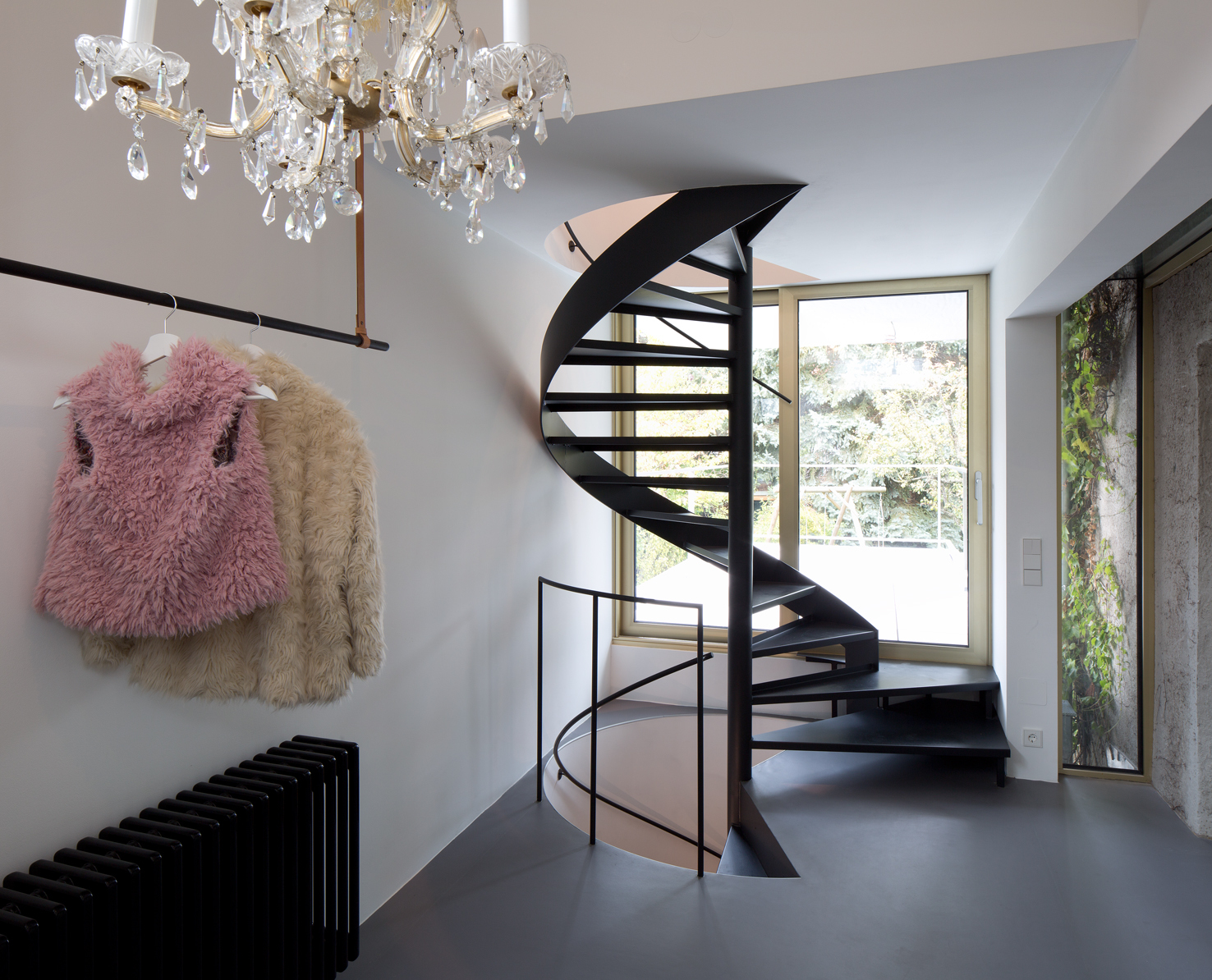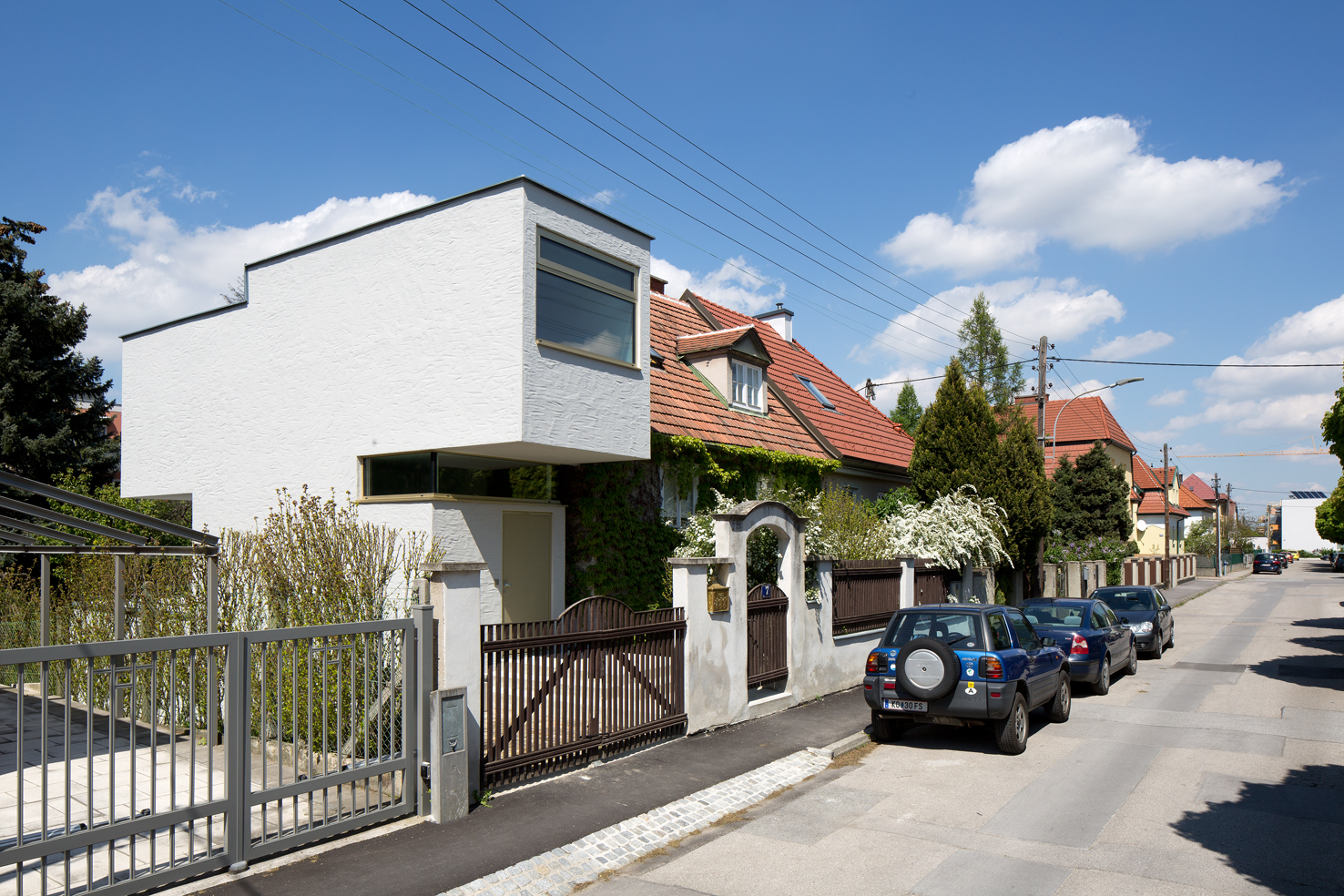Die äußere Form des Pfostenriegelbaus reagiert mit seinen Öffnungen gezielt auf die umliegende Nachbarschaft, Einblicke bleiben verwehrt und die Durchsicht zum Garten ist erst im Inneren spürbar. Der auskragende, straßenseitige Teil im Obergeschoß bildet das Vordach zu der nun großzügigen neuen Eingangssituation, der hofseitige Terrasseneinschnitt erlaubt der westseitigen Sonne weiterhin die bestehende Terrasse des Altbaus zu bescheinen. (Text: Lostinarchitecture / Beate Bartlmä]