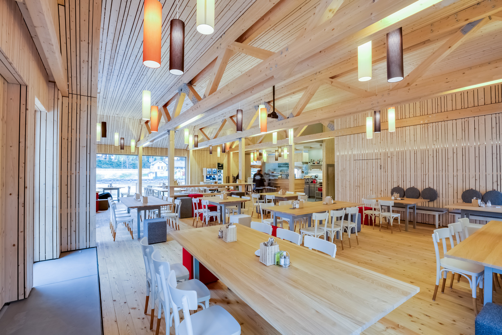 Ein Pelletsofen und ein Stückholzofen versorgen die Aufenthaltsbereiche mit Wärme. Die Wärmeerzeugung der Fußbodenheizung erfolgt durch eine Luft-Wasser-Wärmepumpe, die wiederum durch eine Photovoltaikanlage gespeist wird. Küchenabluft dient zur Wärmerückgewinnung.