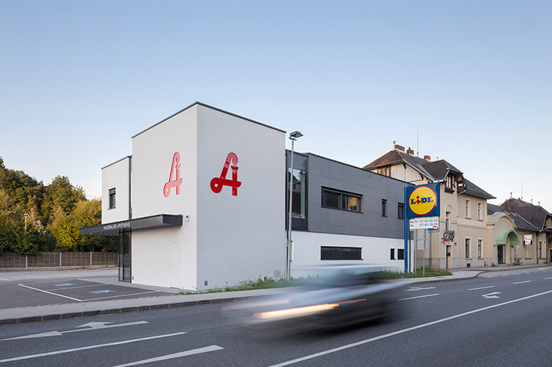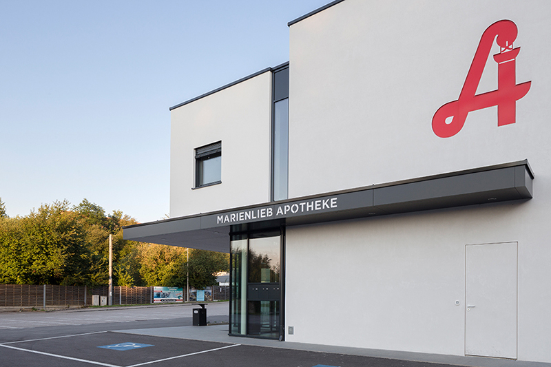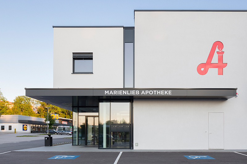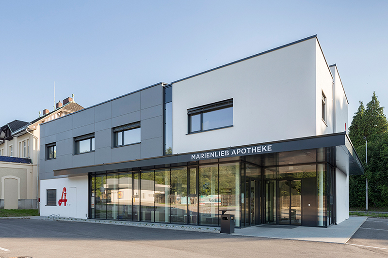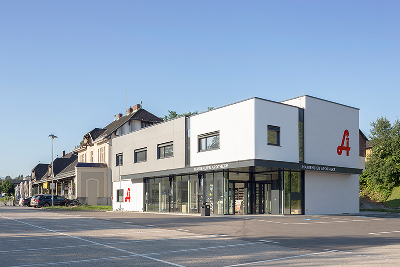 Gewachsen ist diese Baukörperstaffelung jedoch aus den inneren Raum- und Funktionsabläufen. So werden der Erschließungskörper, der offene und verglaste Verkaufsraum der Apotheke sowie die weiteren Räumlichkeiten (Nebenräume und die Ordinationsräume im Obergeschoß) als eigenständige Körper innerhalb eines Gesamtvolumens sichtbar.