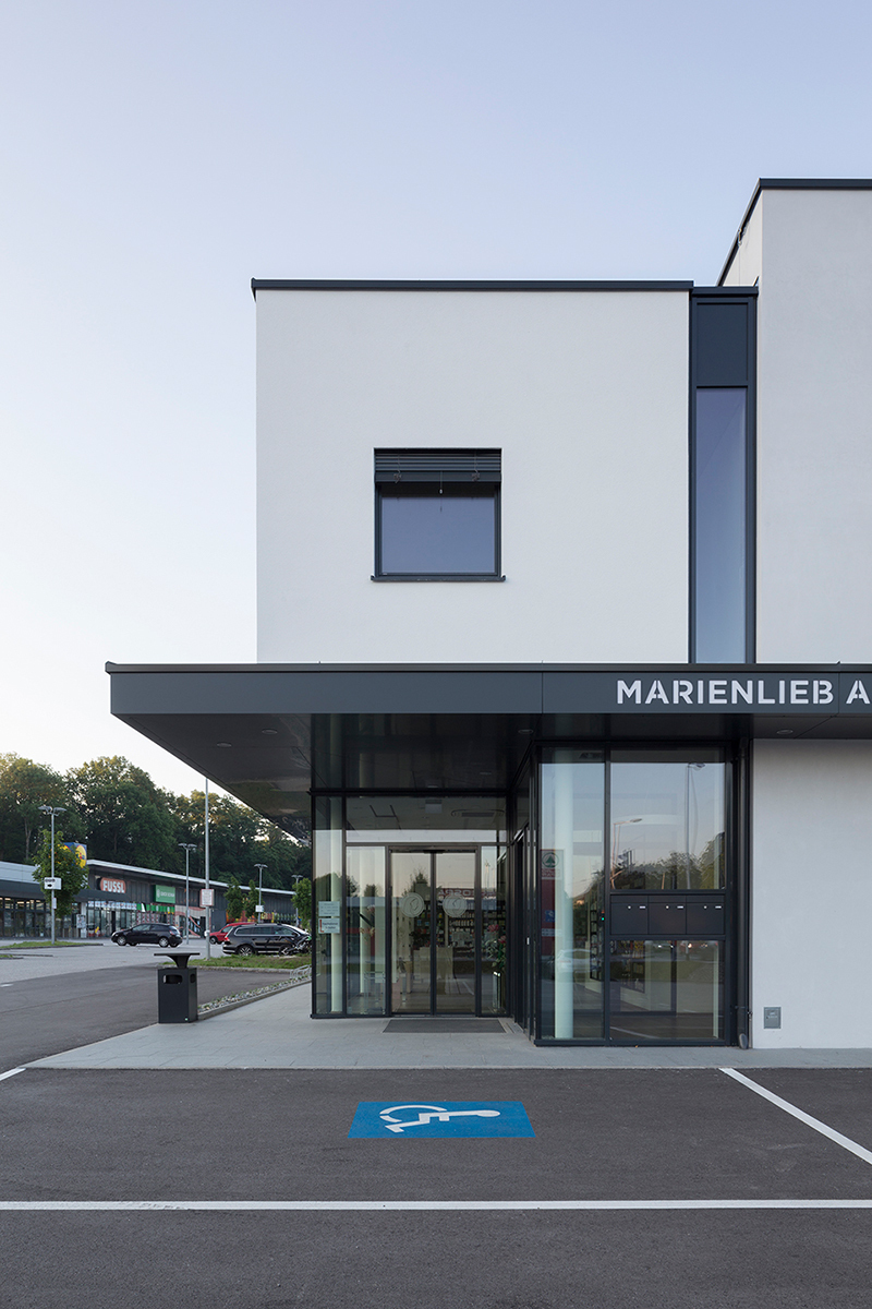 Die einzelnen Funktionsbereiche sind durch längliche Glasbänder voneinander getrennt und lassen Licht auch tief in das Gebäudeinnere dringen. Das zur Straße hin verschlossen wirkende Erdgeschoss öffnet sich auf der gegenüberliegenden Seite mit Hilfe einer breiten, lichtdurchfluteten Fensterfront die den gesamten Geschäftsbereich der Apotheke nach außen hin öffnet.