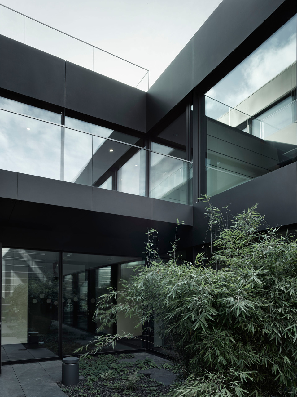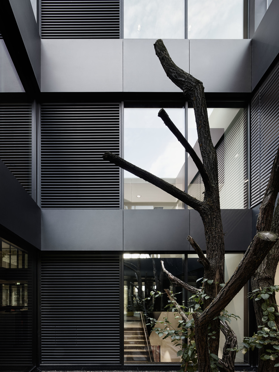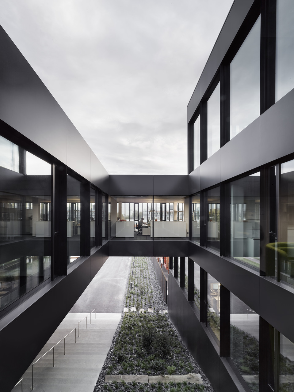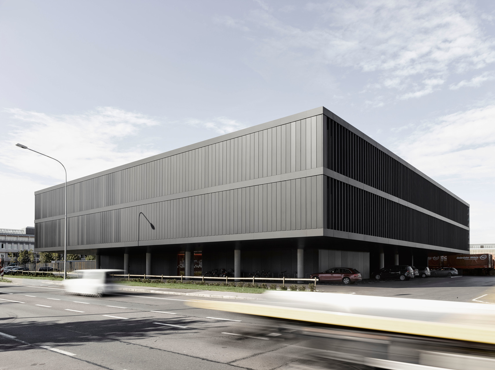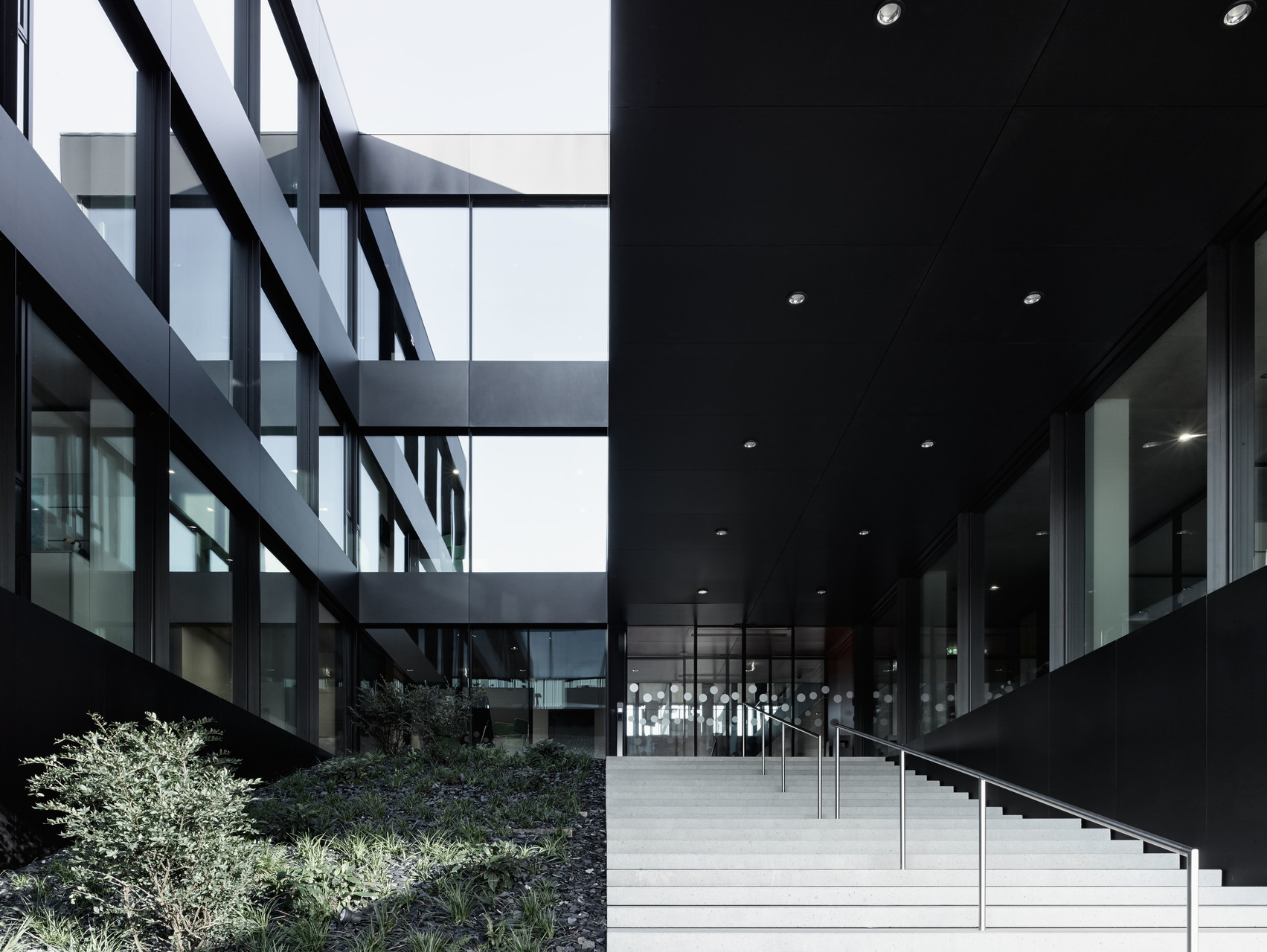 Flache hierarchische Strukturen und gute interne Kommunikation waren entscheidende Kriterien für die innere Organisation des Hauses. Die Büros der 130 Mitarbeiter(innen) sind durch Glaswände mit den Gängen verbunden. Die Aufenthaltsbereiche wurden in kräftigen Farben möbliert und bieten Raum für Begegnung und informellen Austausch. Drei teils begrünte Innenhöfe und das doppelgeschossige Foyer vermitteln Transparenz und Großzügigkeit. Die Fassade des Stahlbetonskelettbaus bildet ein Vorhang aus gelochten, schwarz eloxierten Alu-Lamellen. Sie bewegen sich mit dem Stand der Sonne und verwandeln damit das Erscheinungsbild im Tagesverlauf. Obenauf, in der Mitte des Baukörpers, ist der nach drei Seiten vollflächig verglaste Konferenzsaal des Firmensitzes platziert. (Text: Tobias Hagleitner)