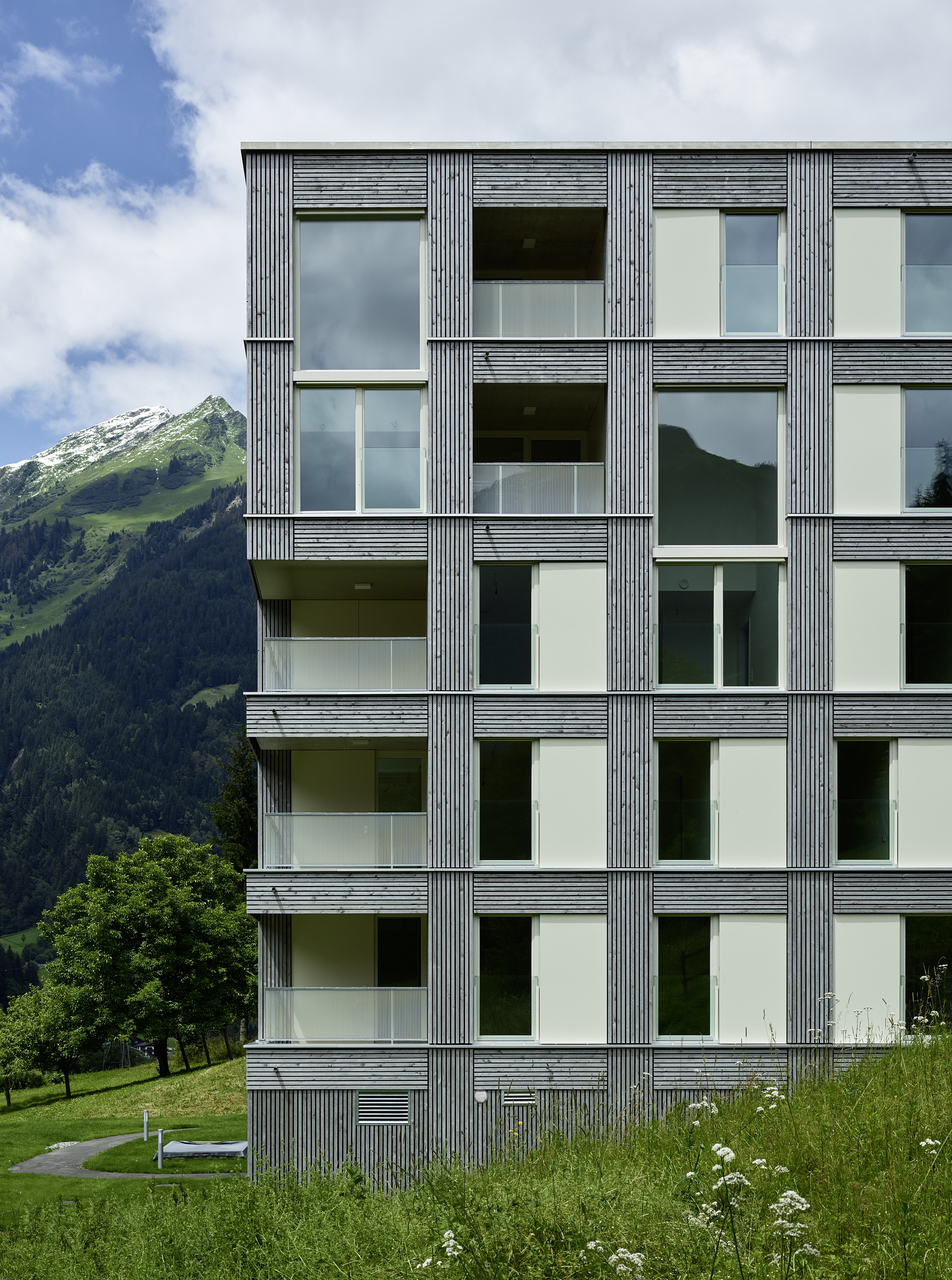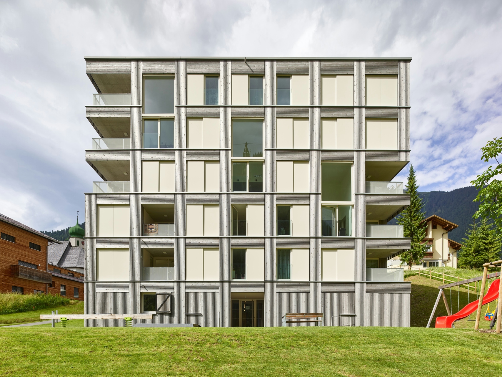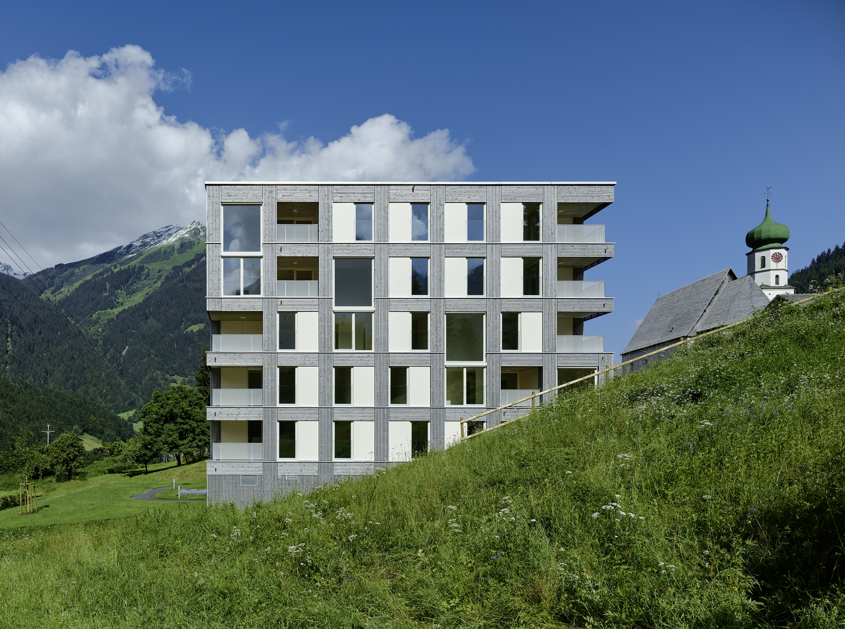 Die Lage im Gebirgstal bringt im Winter lange Schattenphasen mit sich. Die Architekten berücksichtigten das in der Grundrissgestaltung der 20 Wohnungen. Sie sind allesamt nach zwei Seiten orientiert, nach Ost oder West einerseits und ins Dorf oder ins Gebirge andererseits. Gelungen ist diese Typologie über Eck durch das innenliegende Stiegenhaus mit darum herum gruppierten Sanitärkernen. Für ausreichende Belichtung und Weite sorgen darüber hinaus die Loggien und zweigeschoßigen Lufträume. Sie verschaffen den Wohneinheiten Individualität und spannende Bezüge nach draußen. Durch die Einschnitte von doppelter Raumhöhe erhält die ansonsten strenge Quadrat-Geometrie in der Ansicht räumliche Tiefe und Vielschichtigkeit. Die Fassade aus vorverwitterten Weißtannenlatten stellt eine Verbindung zum Schindeldach der benachbarten Kirche her. (Text: Tobias Hagleitner)