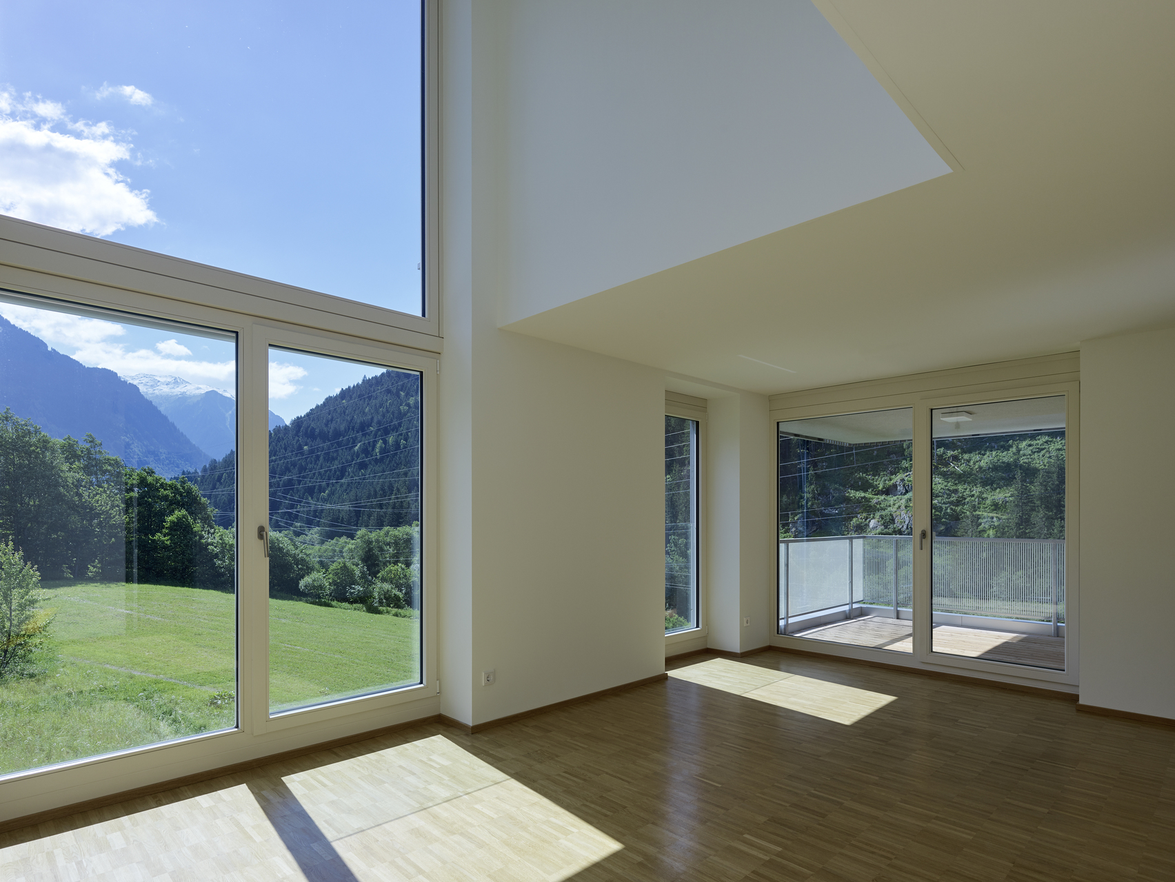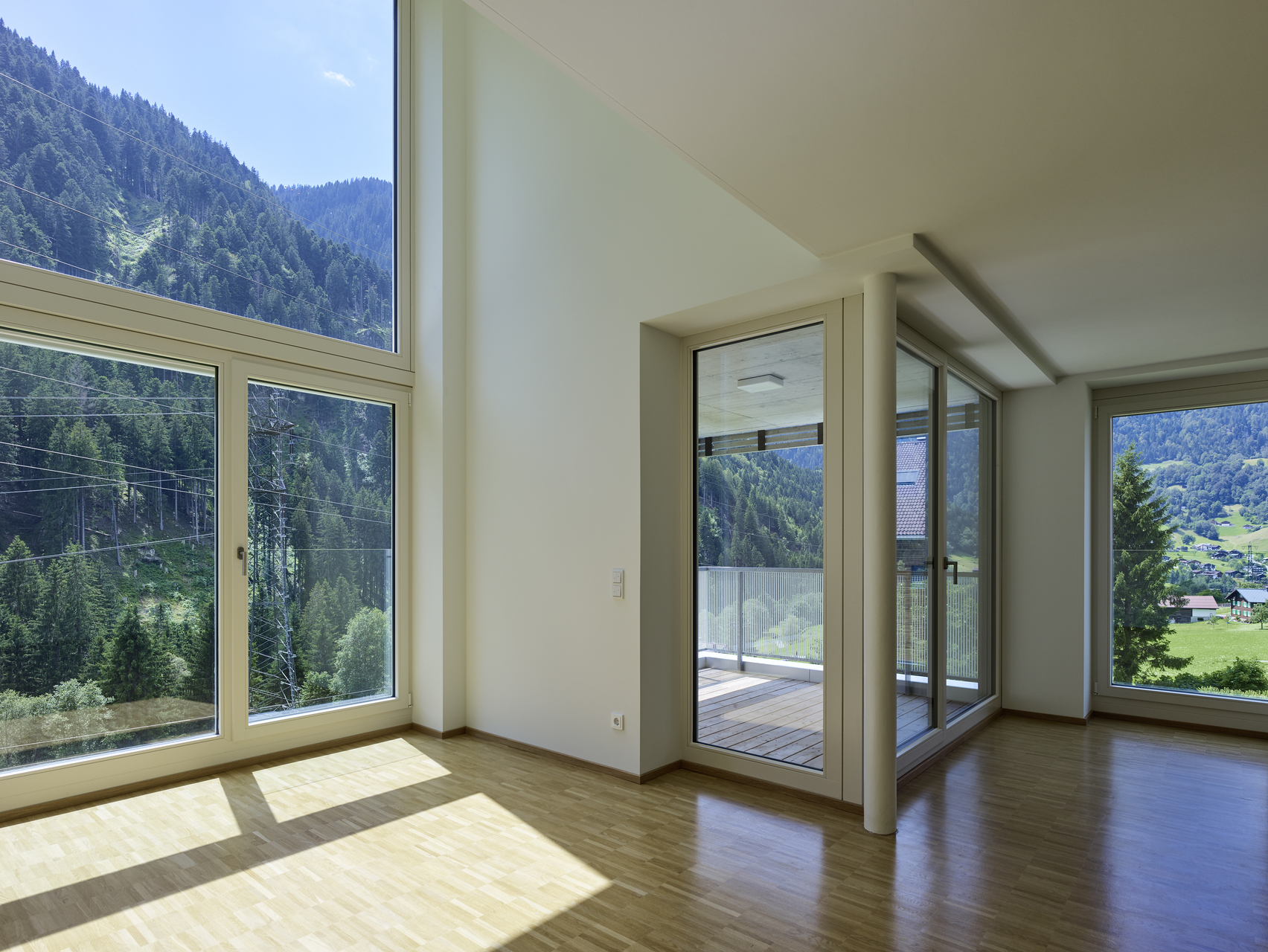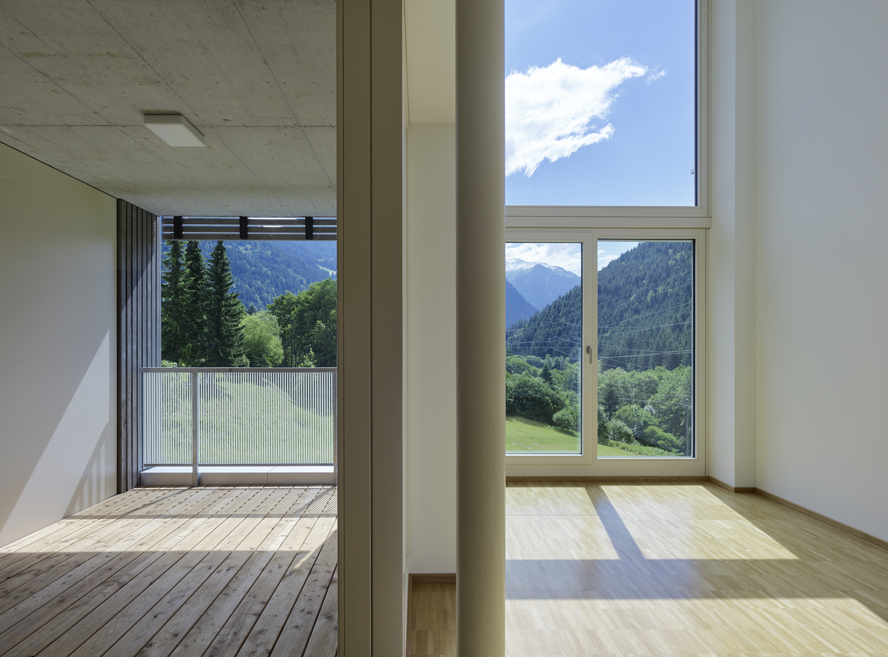 Die Lage im Gebirgstal bringt im Winter lange Schattenphasen mit sich. Die Architekten berücksichtigten das in der Grundrissgestaltung der 20 Wohnungen. Sie sind allesamt nach zwei Seiten orientiert, nach Ost oder West einerseits und ins Dorf oder ins Gebirge andererseits. Gelungen ist diese Typologie über Eck durch das innenliegende Stiegenhaus mit darum herum gruppierten Sanitärkernen. Für ausreichende Belichtung und Weite sorgen darüber hinaus die Loggien und zweigeschoßigen Lufträume. Sie verschaffen den Wohneinheiten Individualität und spannende Bezüge nach draußen. Durch die Einschnitte von doppelter Raumhöhe erhält die ansonsten strenge Quadrat-Geometrie in der Ansicht räumliche Tiefe und Vielschichtigkeit. Die Fassade aus vorverwitterten Weißtannenlatten stellt eine Verbindung zum Schindeldach der benachbarten Kirche her. (Text: Tobias Hagleitner)