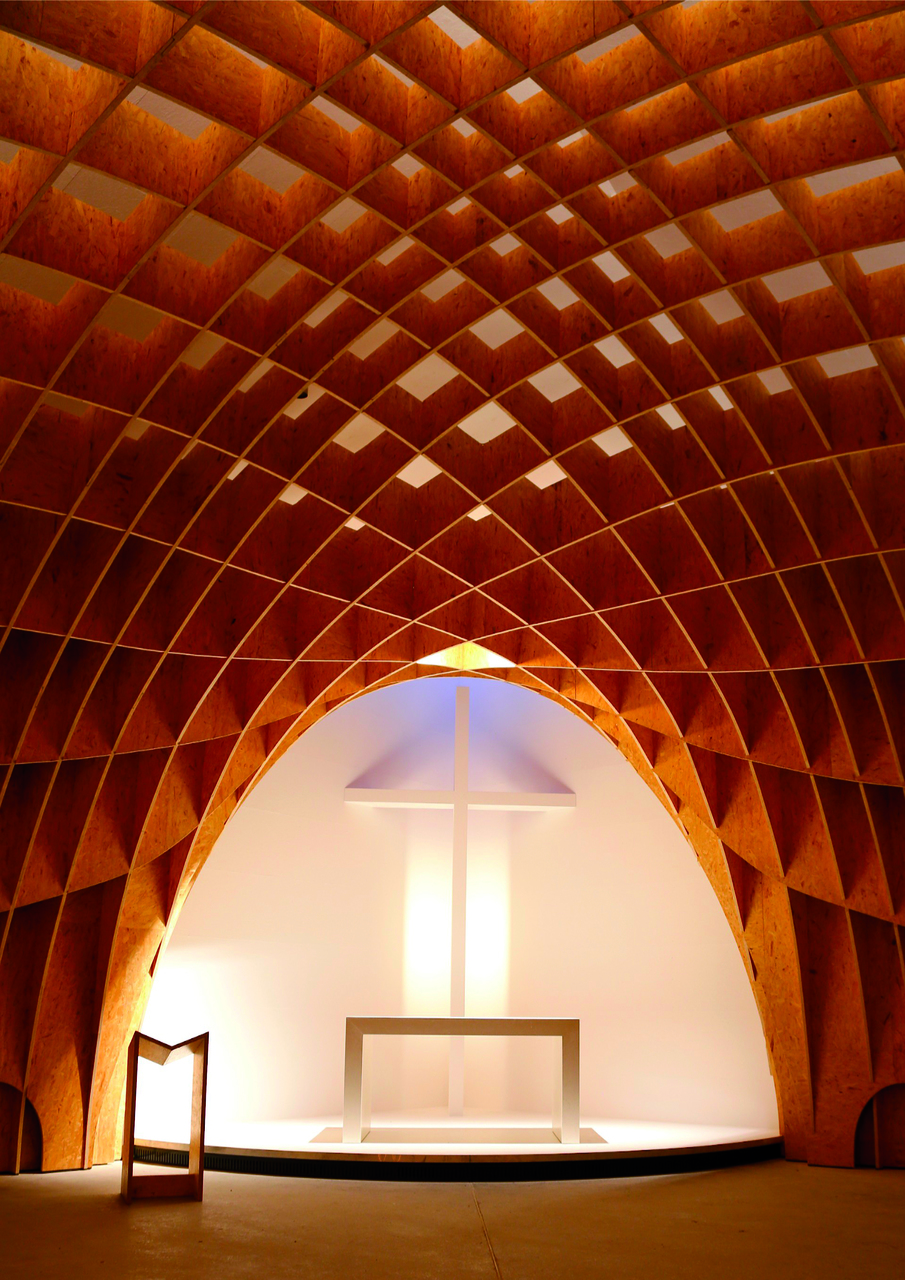 Den Innenraum erreicht man über einen Steg, der zu einem überdachten Eingang führt. Das Innere ist ein filigraner, hölzerner Kuppelraum, der sich zum Altarbereich hin öffnet und der in difuses Licht getaucht wird, das durch eines der beiden Oberlichter in der Turmspitze fällt.