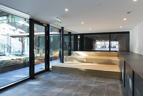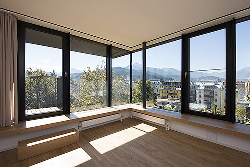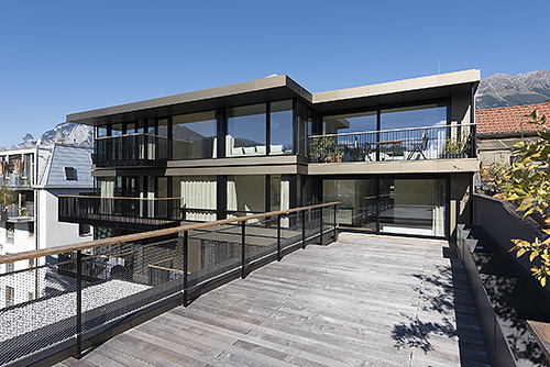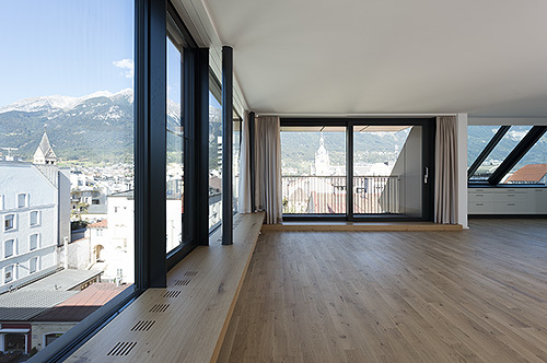 Erdgeschoss und Galeriezone werden als Geschäfts- und Büroflächen genutzt, darüber liegen Wohngeschosse mit insgesamt 17 Wohnungen unterschiedlicher Größe und Orientierung, die sich um den innen liegenden Stiegenhauskern herum gruppieren. In den unteren Geschossen sind gut organisierte Kleinwohnungen untergebracht, oben vier große Wohnungen mit offenen Grundrissen, die sowohl zur Nordkette als auch in den ruhigen Innenhof orientiert sind. Sämtliche Wohnungen erhielten entlang der Glasfassade durchlaufende, breite Eichenholzbänke, die als Sitz- und Liegeflächen vielseitig genutzt werden können.