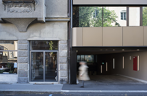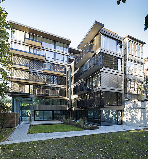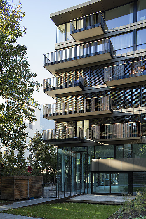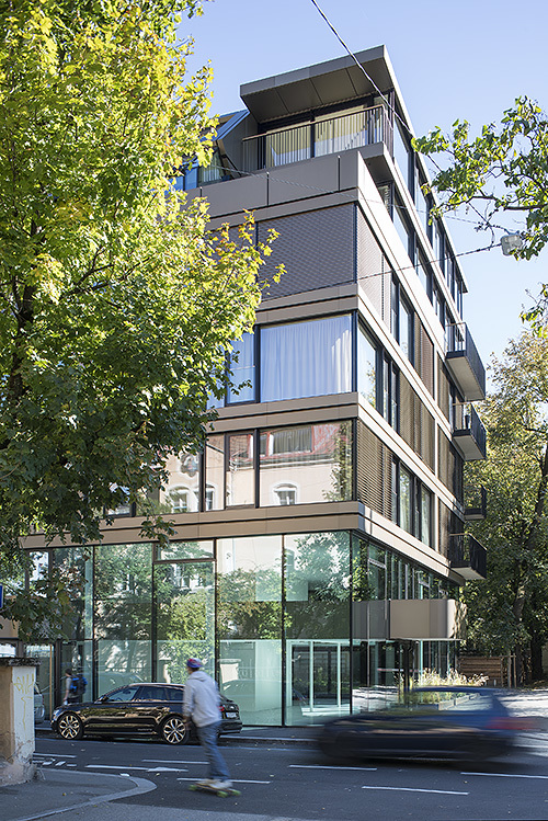 Der 2010 aus einem geladenen Architekturwettbewerb hervorgegangene Neubau von Ohnmacht Flamm Architekten fügt sich in Grundriss und Höhenentwicklung in die gründerzeitliche Umgebung ein. In Reaktion auf die dreiseitig freigestellte Situation inmitten eines innerstädtischen Grünraums wurde ein siebengeschossiger Baukörper mit zwei weitgehend transparent gehaltenen Sockelgeschossen, einer zwischen innen und außen mäandernden Galerie und zweigeschossigen Lufträumen an den Gebäudeecken realisiert.