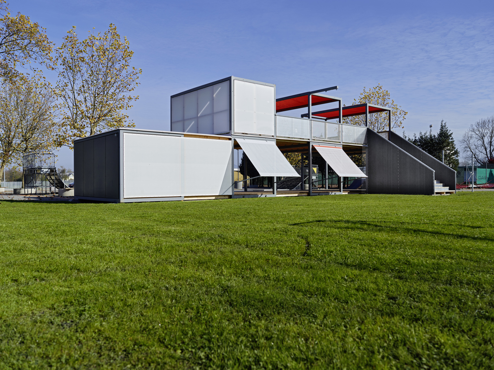Als tragfähige Grundstruktur für das kleine Pavillongebäude inmitten der ausgedehnten Freizeitanlage bot sich ein von der Architekturwerkstatt entwickeltes Stahlrahmen-Modul an. Es ist transportfähig, selbsttragend und stapelbar und mit allen nötigen Anschlusspunkten versehen, sodass es mit Böden, Decken oder Wänden beplankt, bespannt oder behangen werden kann. So bleibt die Architektur wandlungsfähig und unkompliziert. Für die Grundausstattung wurden Materialien verwendet, die günstig und einfach erhältlich waren. Auch Restposten lokaler Betriebe wurden verarbeitet.