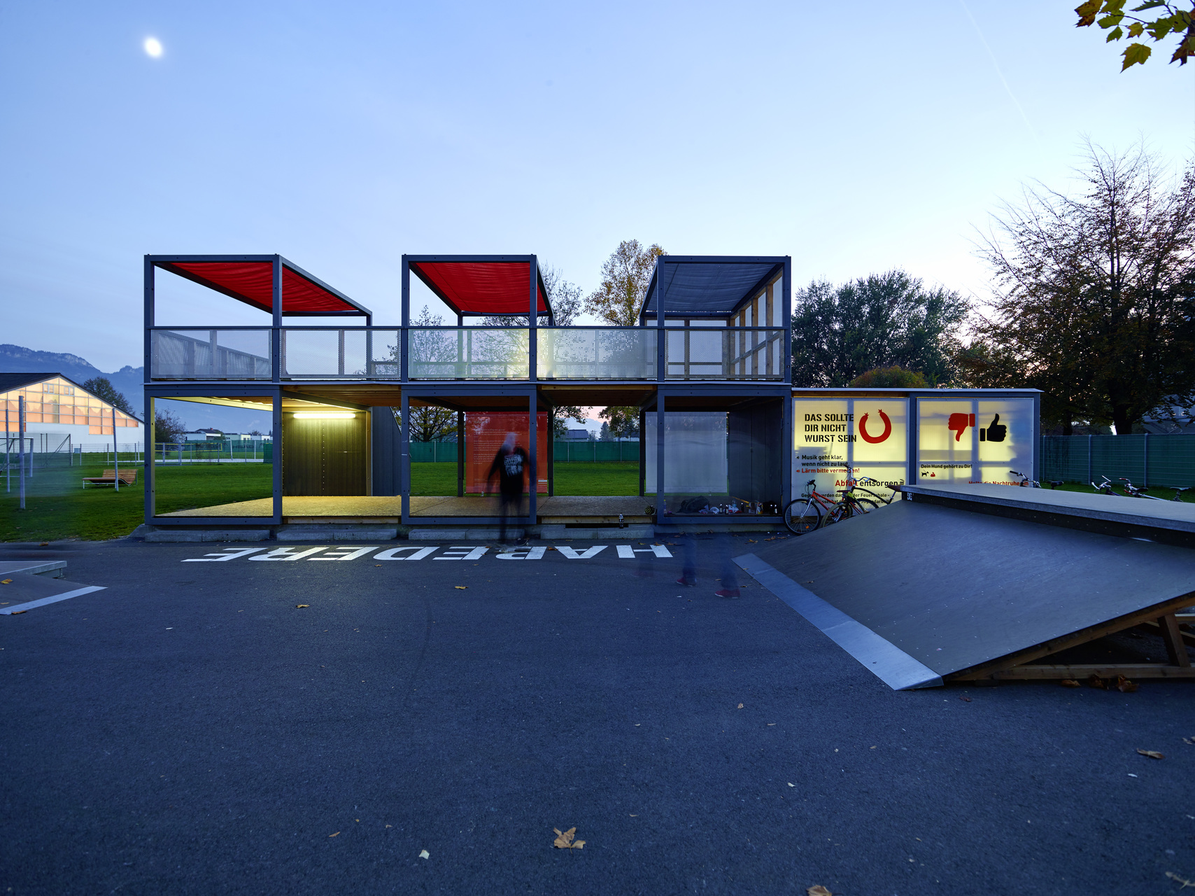 Es gibt einen verschließbaren Bereich, der zeitweise von der Jugendarbeit betreut wird. Daneben bietet die offene Veranda eine ebenerdige Ruhezone mitten im Geschehen. Eine Freitreppe, die zugleich Tribüne und Sonnenbank ist, erschließt die mit grünem Kunststoffrasen belegte Dachfläche. (Text: Tobias Hagleitner)