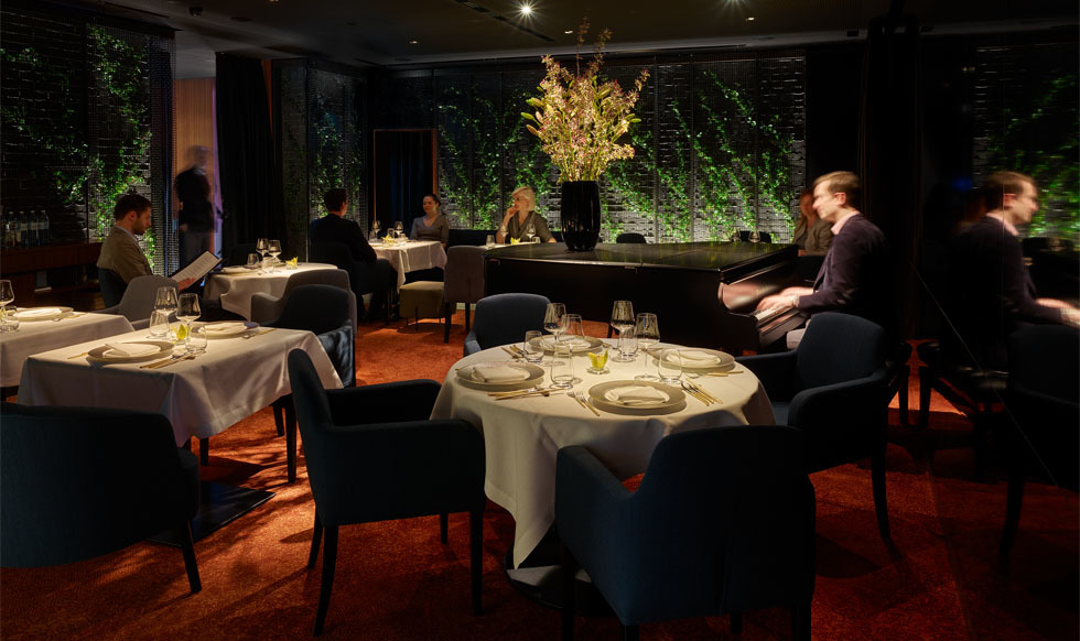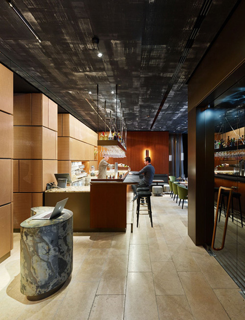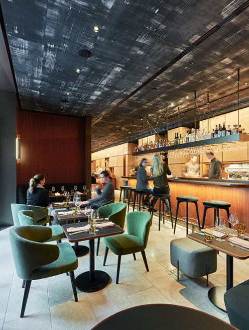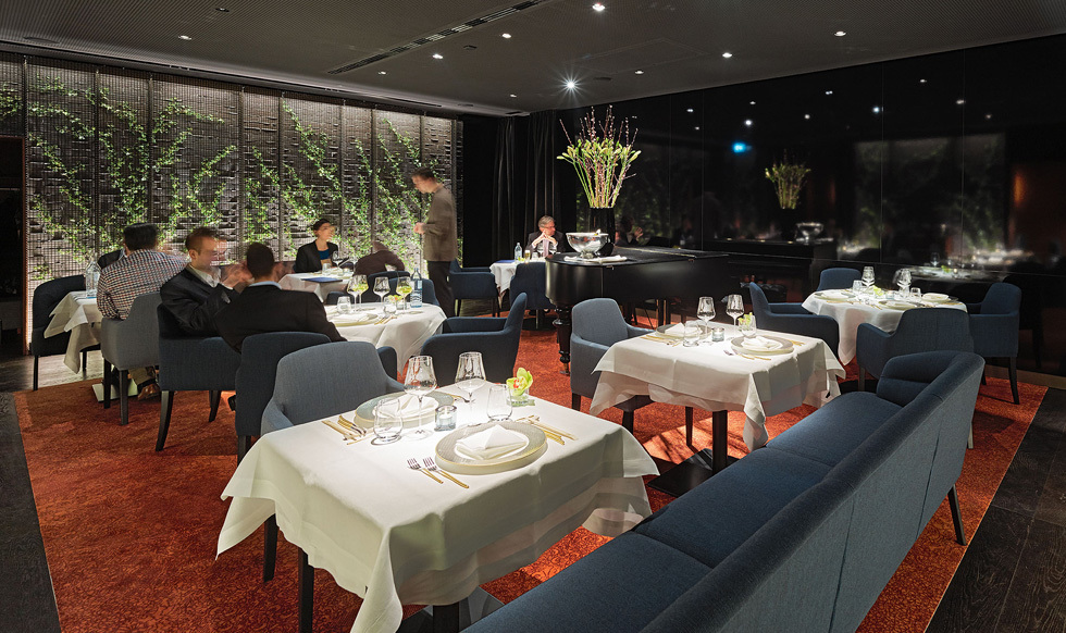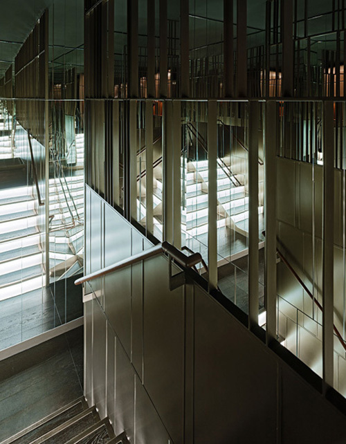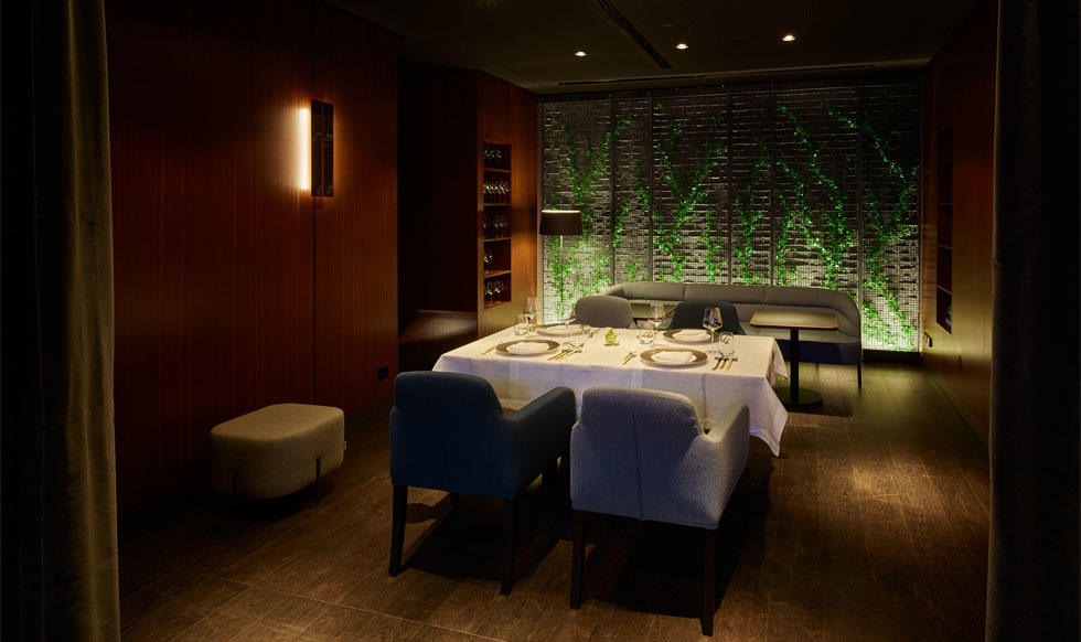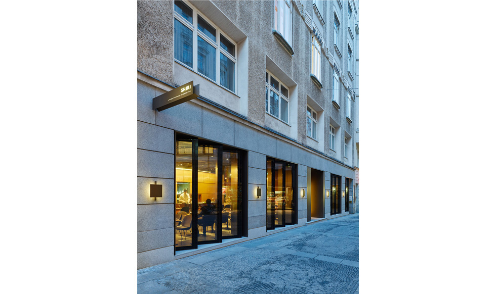 Die Inszenierung der Raumsequenzen mit dezent spiegelnden Lackwänden, handgestrichenen, begrünten Ziegelmauern mit effektvollen Schattenfugen hinter einem feingliedrigen Messingnetz betont die emotionale, sinnliche Verbindung von unterschiedlichen Welten, Innen und Außen, Tradition und Modernität. Das architektonische Prinzip der eleganten Zurückhaltung schafft sowohl eine einladende als auch unaufdringliche Raumsituation.