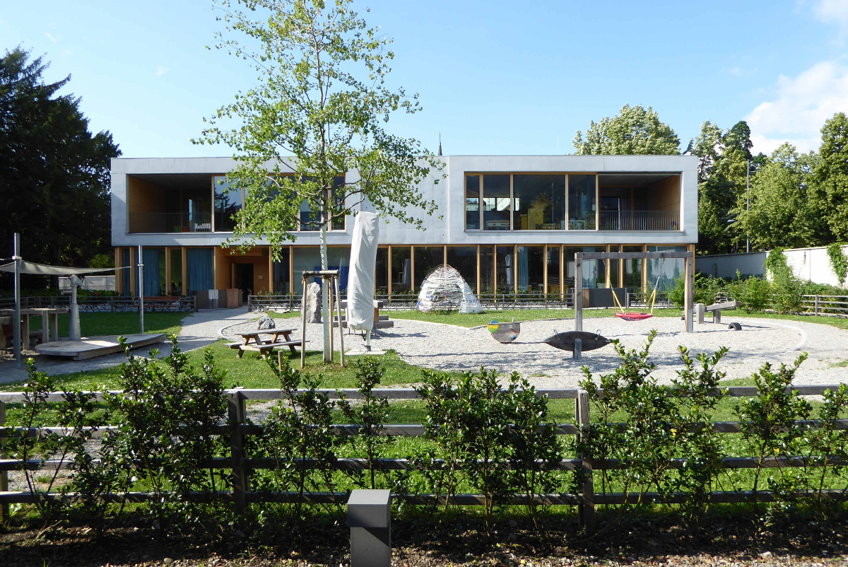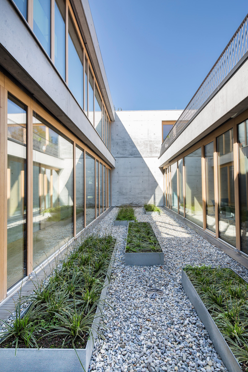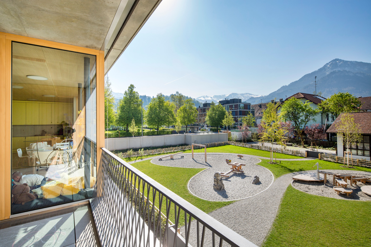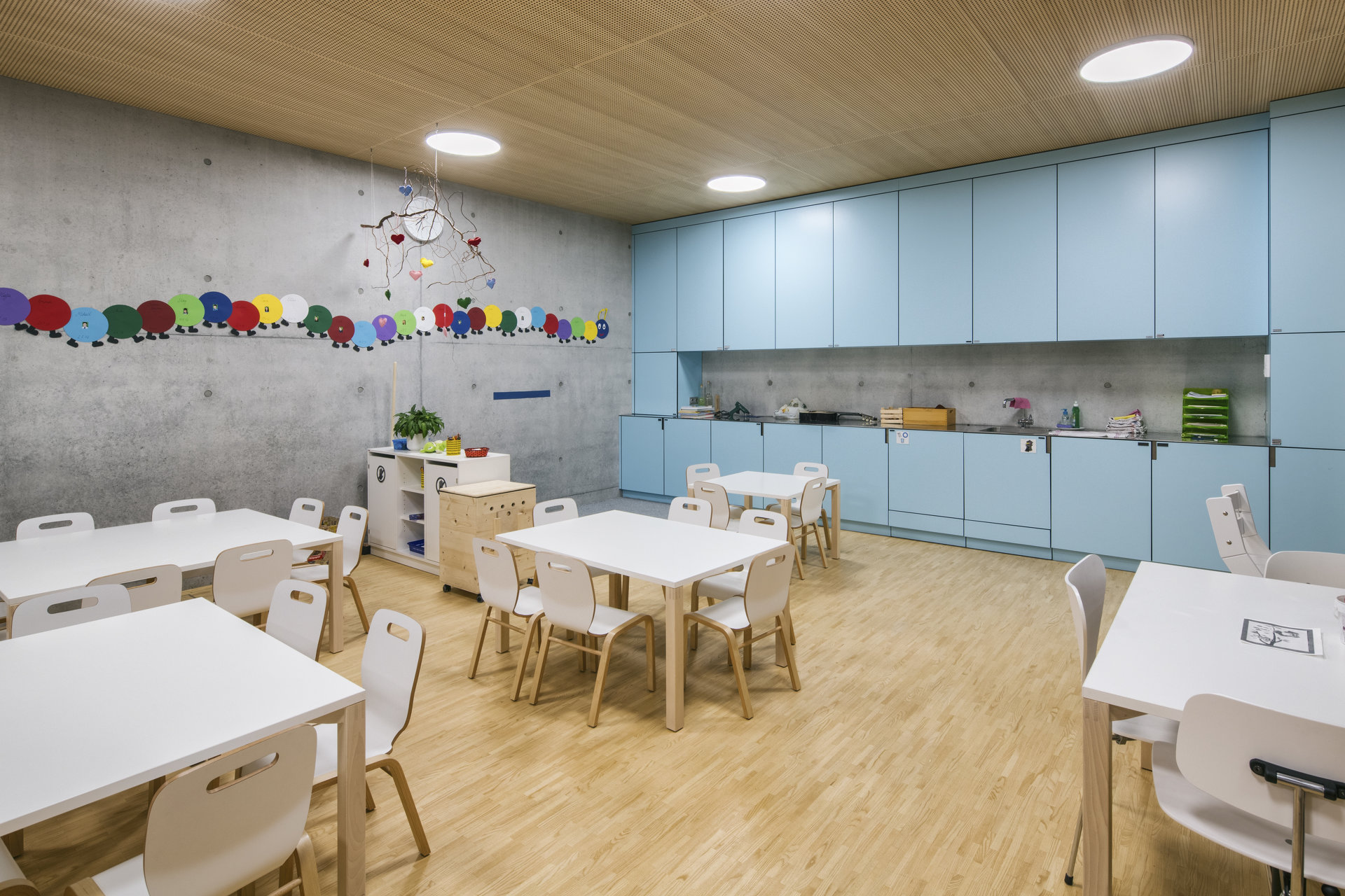 Die Gruppenräume heben sich vom öffentlichen Park ab und ziehen sich in die obere „Wohnebene“ zurück. Der begrünte Innenhof, der die Mitte der einzelnen Gruppenräume bildet, ist durch seine Südostorientierung den stärker frequentieren Außenbereichen abgewandt, schafft private Atmosphäre ohne sich zu verschließen. Er ist mit diversen Spieleinrichtungen als Erlebnisraum gestaltet, bietet vielfältige Ein- und Durchblicke und wirkt so als inneres Verbindungselement für die einzelnen Gruppen. Jeder Gruppen- und Ausweichraum ist mit den jeweils zugeordneten Garderoben- und Loggiabereichen als offene Einheit konzipiert. Die Büros und Sitzungszimmer des Gemeindeverbandes sind ebenerdig im nördlichen Teil des Grundstücks untergebracht. Über die offene Foyerzone werden sowohl die Arbeitsräume wie auch die Besprechungs- und Schulungsräume erschlossen.