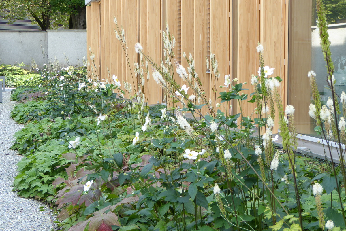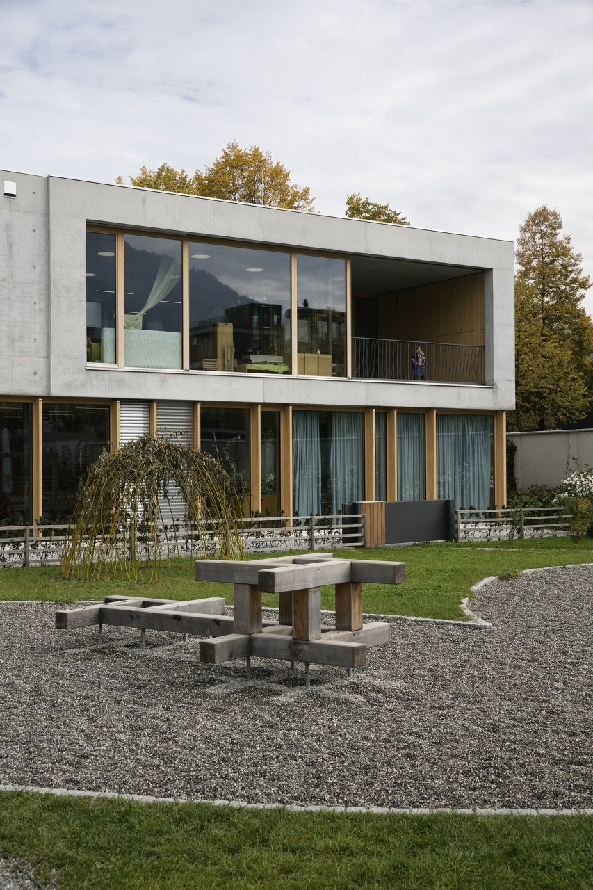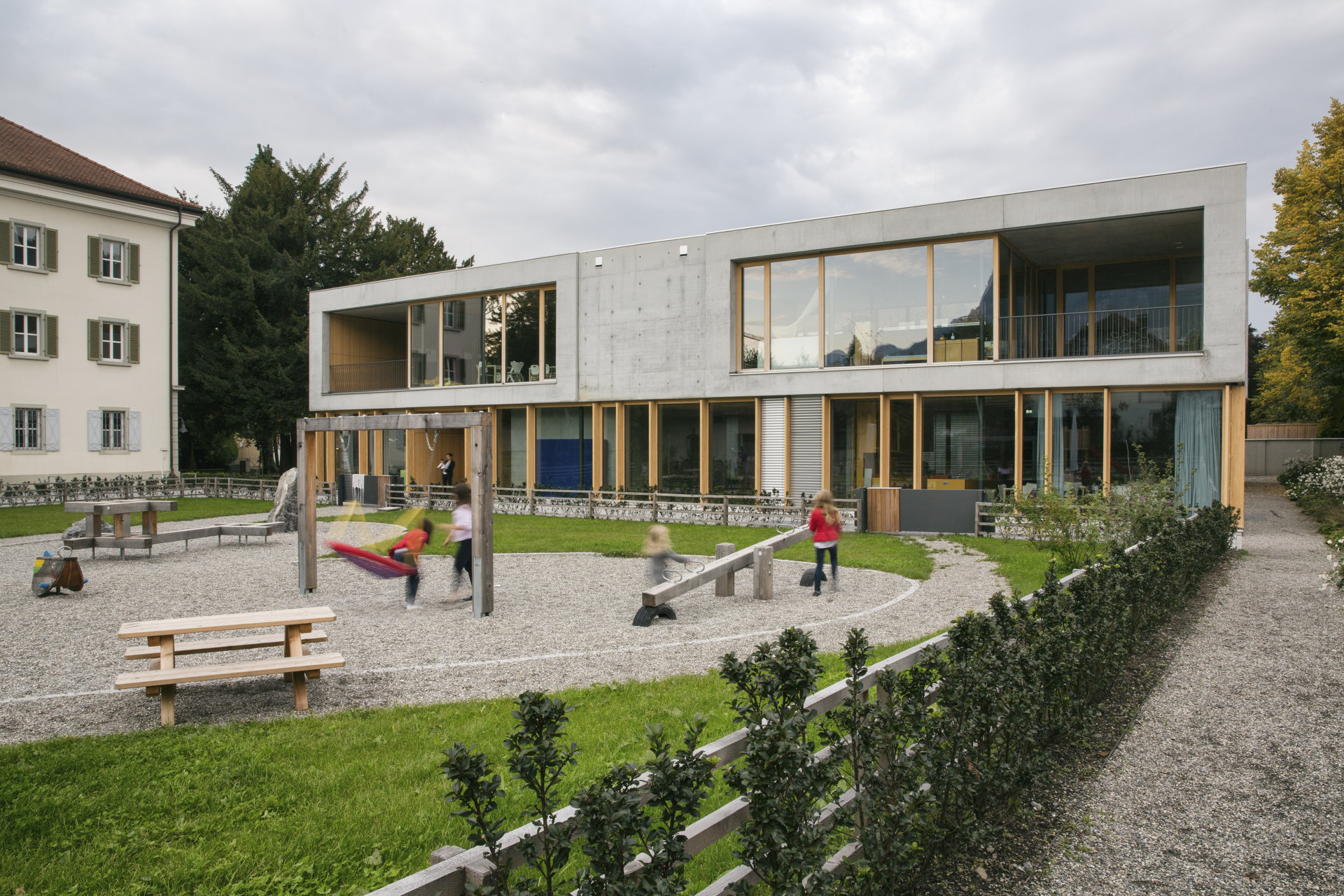 Die Gruppenräume heben sich vom öffentlichen Park ab und ziehen sich in die obere „Wohnebene“ zurück. Der begrünte Innenhof, der die Mitte der einzelnen Gruppenräume bildet, ist durch seine Südostorientierung den stärker frequentieren Außenbereichen abgewandt, schafft private Atmosphäre ohne sich zu verschließen. Er ist mit diversen Spieleinrichtungen als Erlebnisraum gestaltet, bietet vielfältige Ein- und Durchblicke und wirkt so als inneres Verbindungselement für die einzelnen Gruppen. Jeder Gruppen- und Ausweichraum ist mit den jeweils zugeordneten Garderoben- und Loggiabereichen als offene Einheit konzipiert. Die Büros und Sitzungszimmer des Gemeindeverbandes sind ebenerdig im nördlichen Teil des Grundstücks untergebracht. Über die offene Foyerzone werden sowohl die Arbeitsräume wie auch die Besprechungs- und Schulungsräume erschlossen.