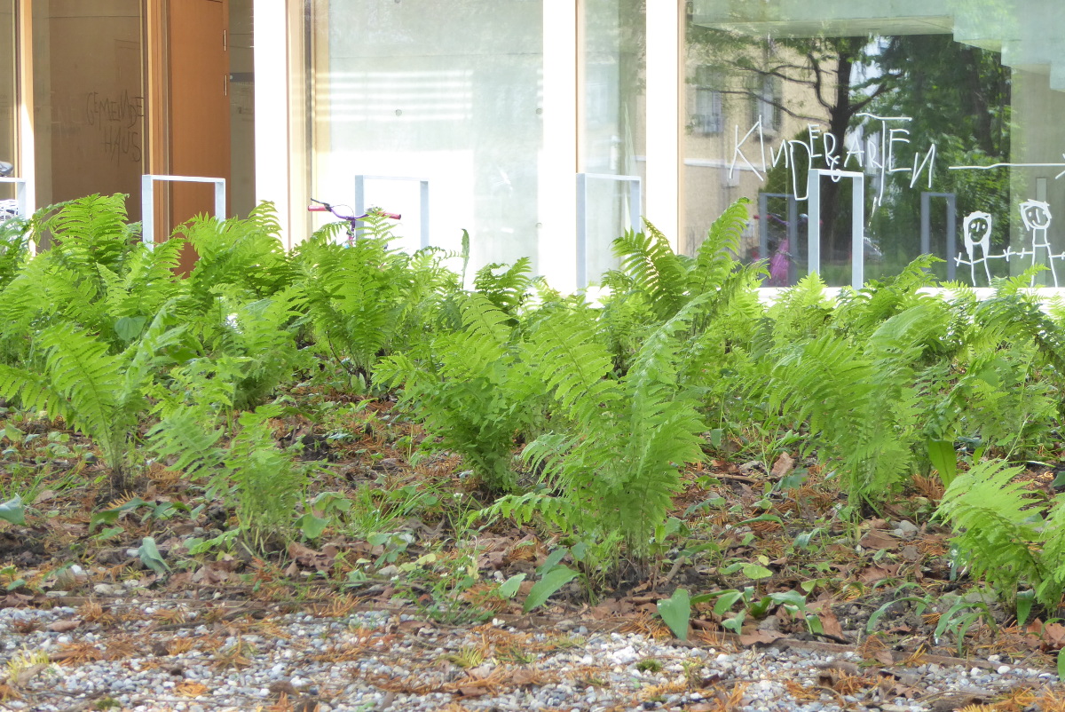 Die skulpturale Großform des neuen Kindergartens markiert die östliche Seite des Areals und definiert differenzierte Außenräume. Die Eingangsebene mit den allgemeinen Funktionen wie Essbereich und Bewegungsraum ist offen und einladend und kommuniziert mit dem belebten Park und den Außenspielflächen. Durch die ebenerdige Positionierung und Kompaktheit kann diese Ebene auch gut für externe Veranstaltungen genutzt werden. Die großzügige Öffnung Richtung Westen zeigt als einladende Geste den Eingang an.
