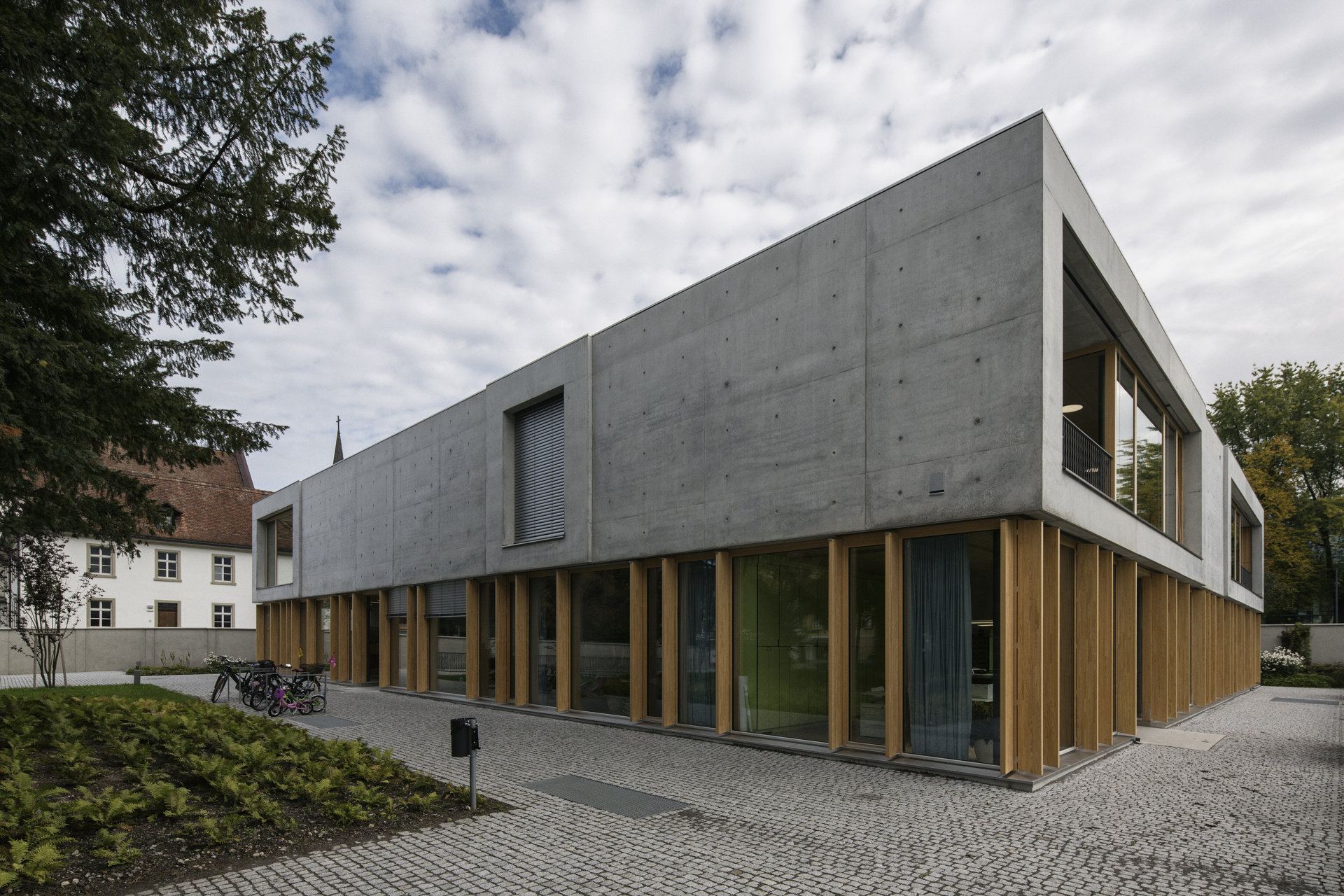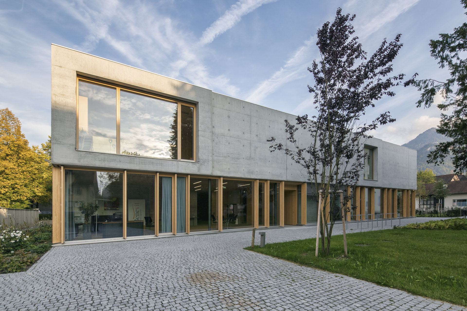 Die Erscheinung des Gebäudes wird vom Spiel aus hellen Beton- und großzügigen Glasflächen bestimmt. Innen gibt es gesägte Riemenböden und geschliffenen Beton für die stark beanspruchten Bereiche. Holzverkleidungen und perforierte Holzakustikelemente fügen sich im Wechsel zu einem harmonischen Wand- und Deckenbild. (Text: Tobias Hagleitner nach einem Text der Architekten)