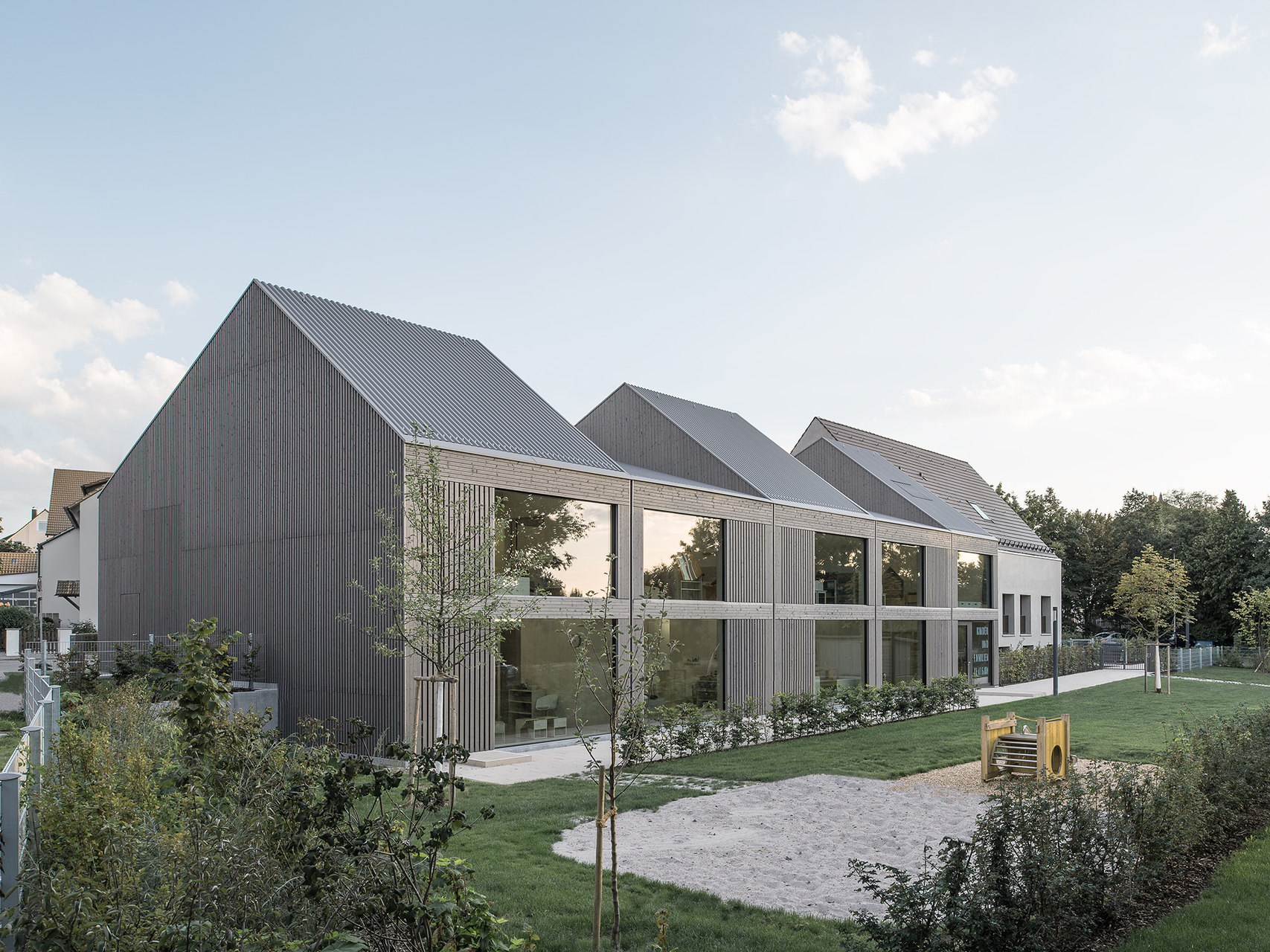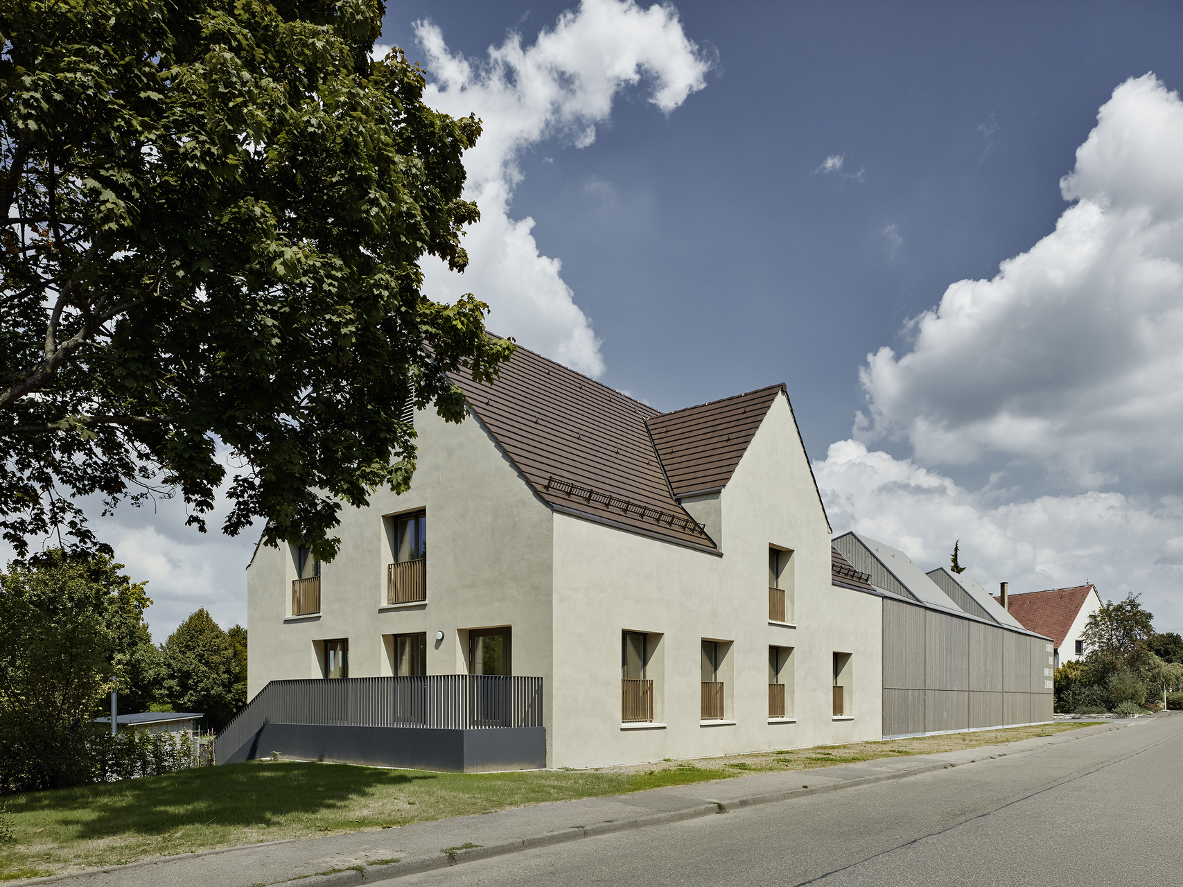 Der Neubau spricht eindeutig eine eigene und zeitgenössische Sprache, nimmt aber in Proportion und Materialität Motive aus der Umgebung auf. Als Holzbau steht er im deutlichem Kontrast zum steinernen Bestandsbau und spielt damit auf die wechselnden Oberflächen der angrenzenden Bauten aus Holz und Putz an. Trotz der klaren Abgrenzung in Material und Konstruktion entsteht durch Neu- und Altbau eine neues Ganzes, dass sich innerhalb des heterogenen Umfeldes selbstbewusst behauptet, dessen ländlichen Charakter dabei bewusst aufnimmt und neu interpretiert.
