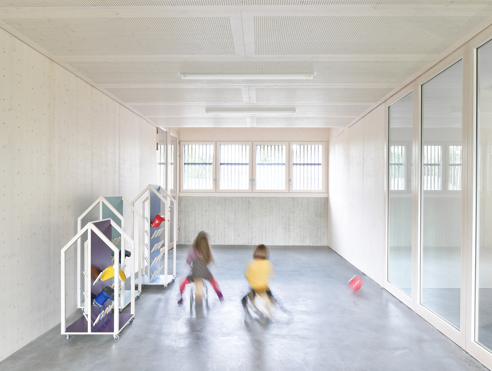 Im Inneren werden die vorhandenen Raumstrukturen im Bereich des Familienzentrums grösstenteils beibehalten und punktuell auf die Anforderungen der neuen Aufenthalts- und Verwaltungsräume angepasst.