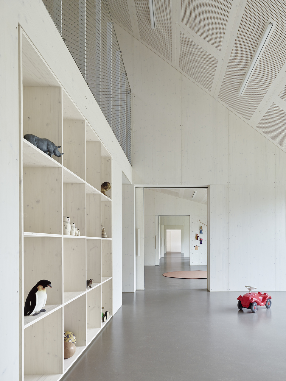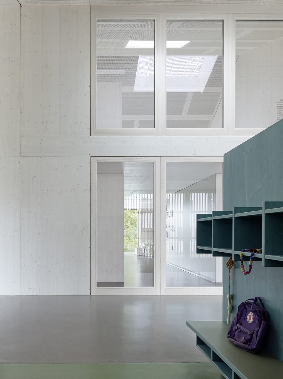 Die Differenzierung der beiden Gebäudeteile setzt sich auch im Inneren fort. Im Neubau werden sämtliche Oberflächen in hell lasierten Dreischichtplatten aus Fichte ausgeführt, so dass eine helle, freundliche und großzügige Atmosphäre geschaffen wird. Die Gestaltung der Räume ist vom Umgang mit Licht, großzügigen differenzierten Räumen, klaren Strukturen, Reduktion und Disziplin in Verbindung mit sensibler Detailgestaltung bestimmt. (Text: Architekt:innen)