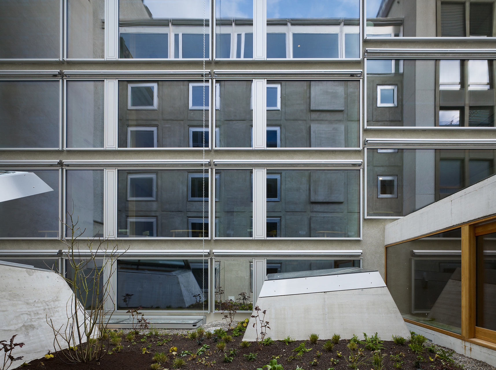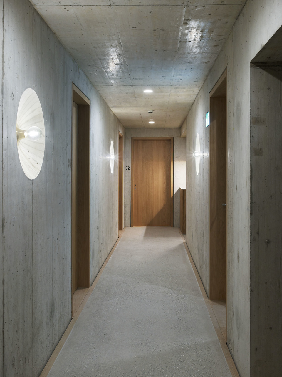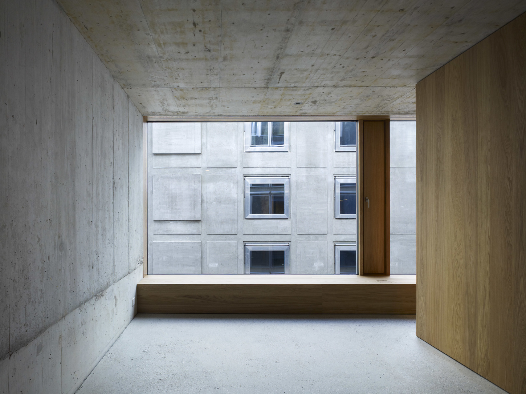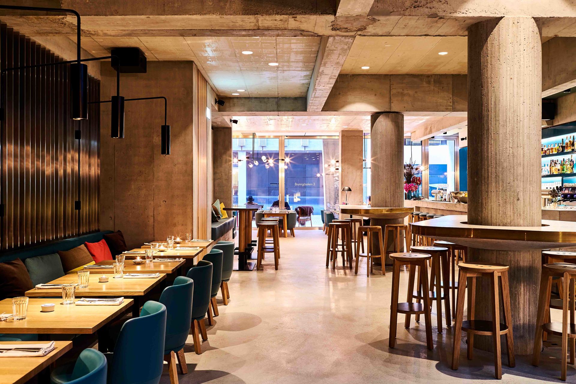 Die Fassade des Bestandsbaus wurde denkmalpflegerisch saniert und auf die ursprüngliche rohe Betonoberfläche zurückgeführt. Die Strassenfassade wird durch ein Betonrelief gegliedert und findet ihren oberen Abschluss in einem neuen Attikaaufbau. Zusammen mit den präzis ausformulierten Aluminiumfenstern entsteht ein spannungsvolles Verhältnis zwischen Alt und Neu. Im Erdgeschoss ermöglichen grossflächige Verglasungen, die sich im Sommer öffnen lassen, Einblicke in den hell und offen gestalteten Gastronomiebereich. Eine lang-gezogene Theke vermittelt als elegantes Objekt zwischen den Bereichen von Bar und Restaurant. Die Deckenstruktur, bestehend aus Unterzügen und neuen Tragelementen leitet den Besucher in die Tiefe des Raumes. Ein grosses Oberlicht bringt dort Tageslicht in den rückwärtigen und überhöhten Loungebereich. Über die asymmetrische Setzung des Erschliessungskerns wird der Raum zusätzlich zoniert. Die zu erhaltende Hofdurchfahrt auf dem Grundstück dient neu als Hauptzugang zum Hotel. Im Vorderhaus werden alle Zimmer durch einen Mittelgang erschlossen. Die Möbel sind frei entlang der Peripherie des Raumes angeordnet. Im Bestand werden die existierenden Fassadenöffnungen berücksichtigt. Die Zimmer in der Aufstockung des Vorderhauses bieten dazu mit grosszügigen Verglasungen eine für das Haus neuartige Erfahrung. Das Zimmerkonzept des Hinterhauses besteht aus der räumlichen Dramaturgie einer kreisförmigen Bewegung vom Eingang über die Fassade zum Bad. Im Zentrum der Räume steht das Bett. Durch grosse Fenster blickt man auf die Fassade des Bestandsbaus. (Text: Architekten)