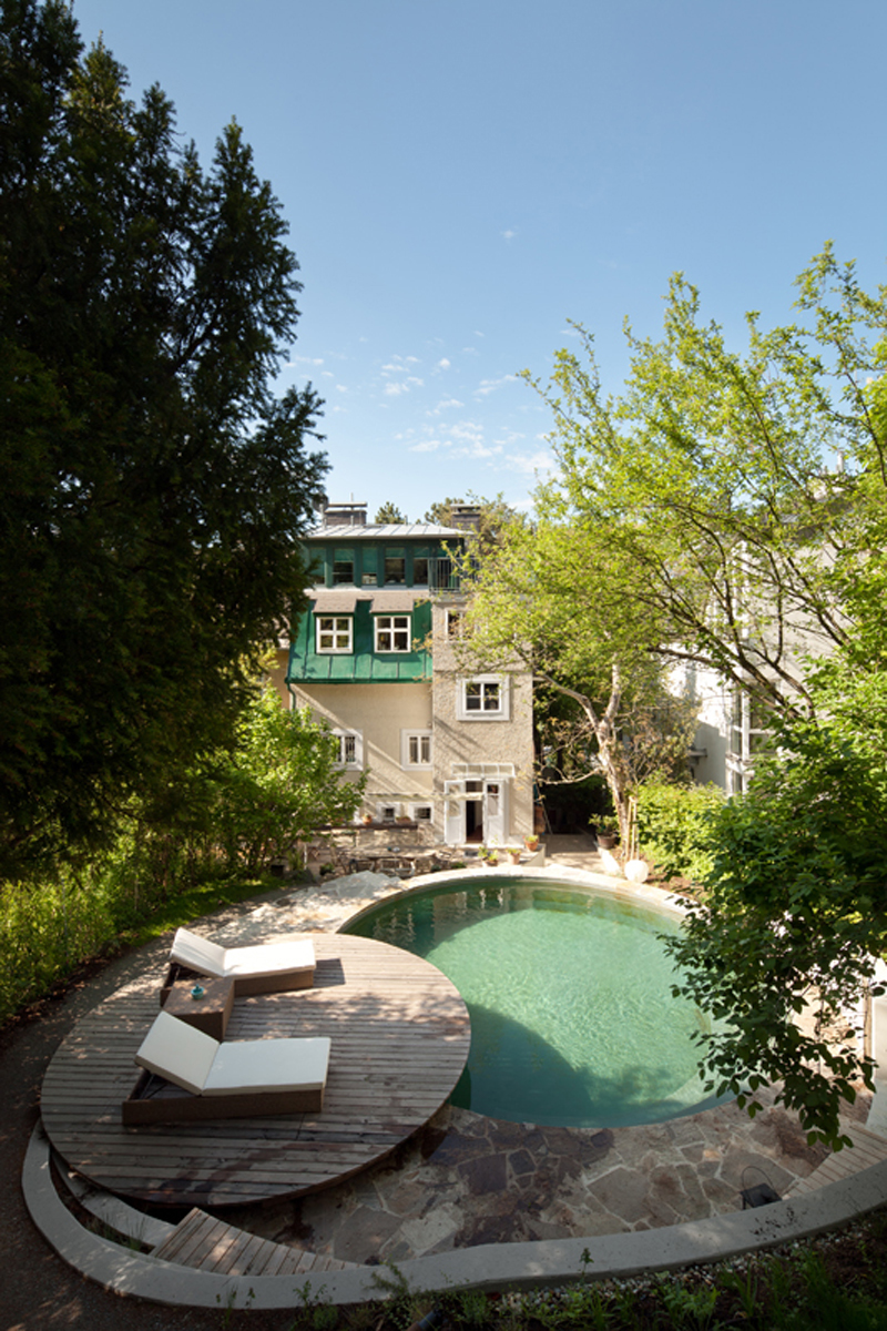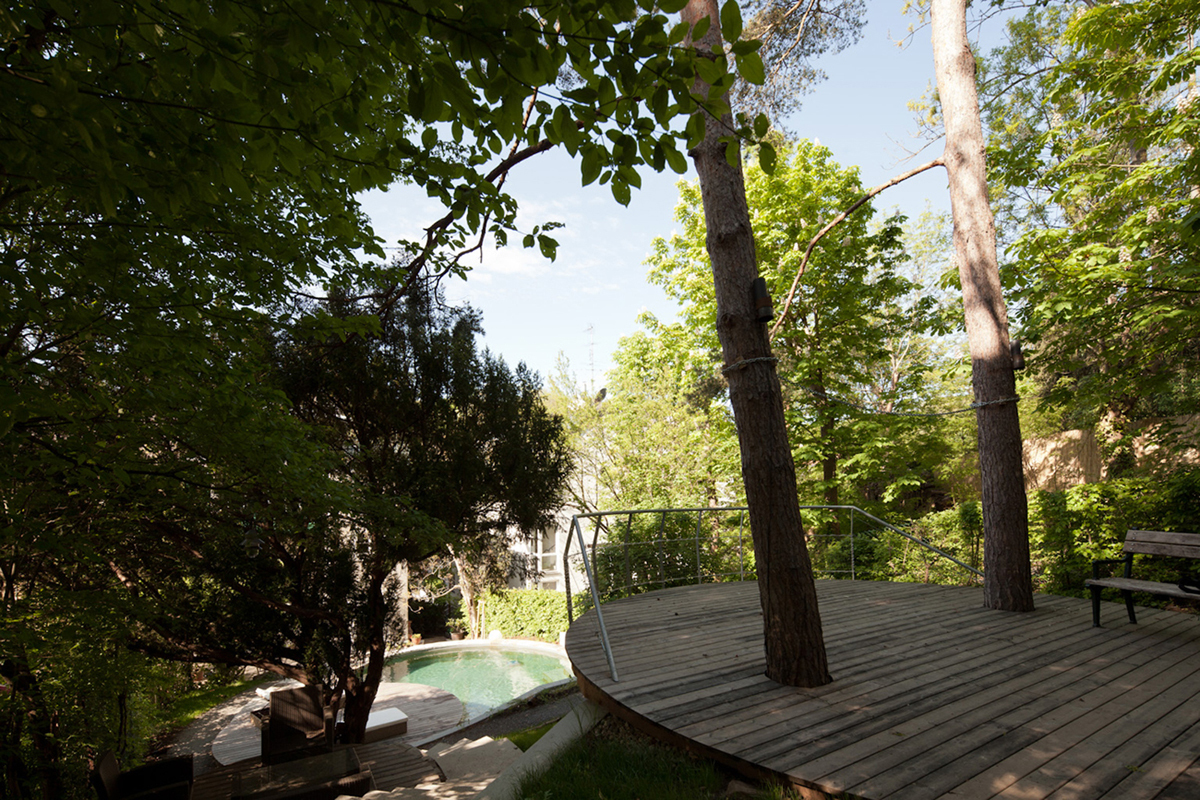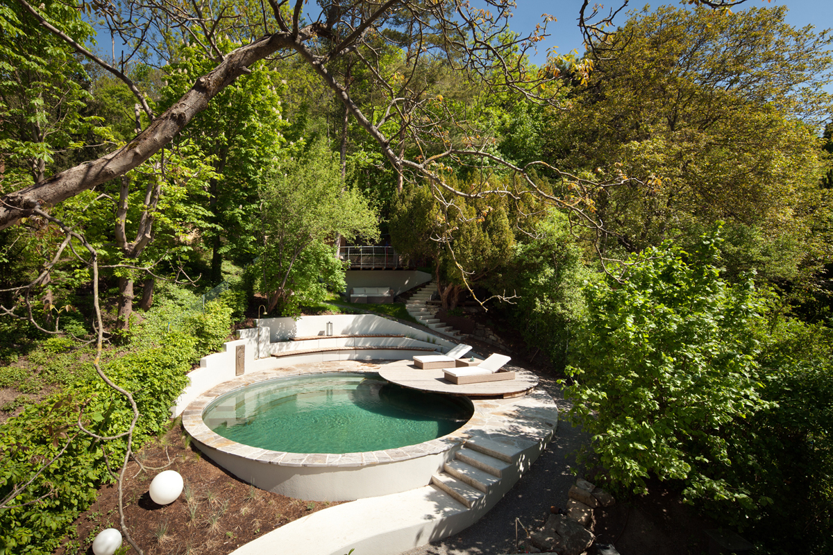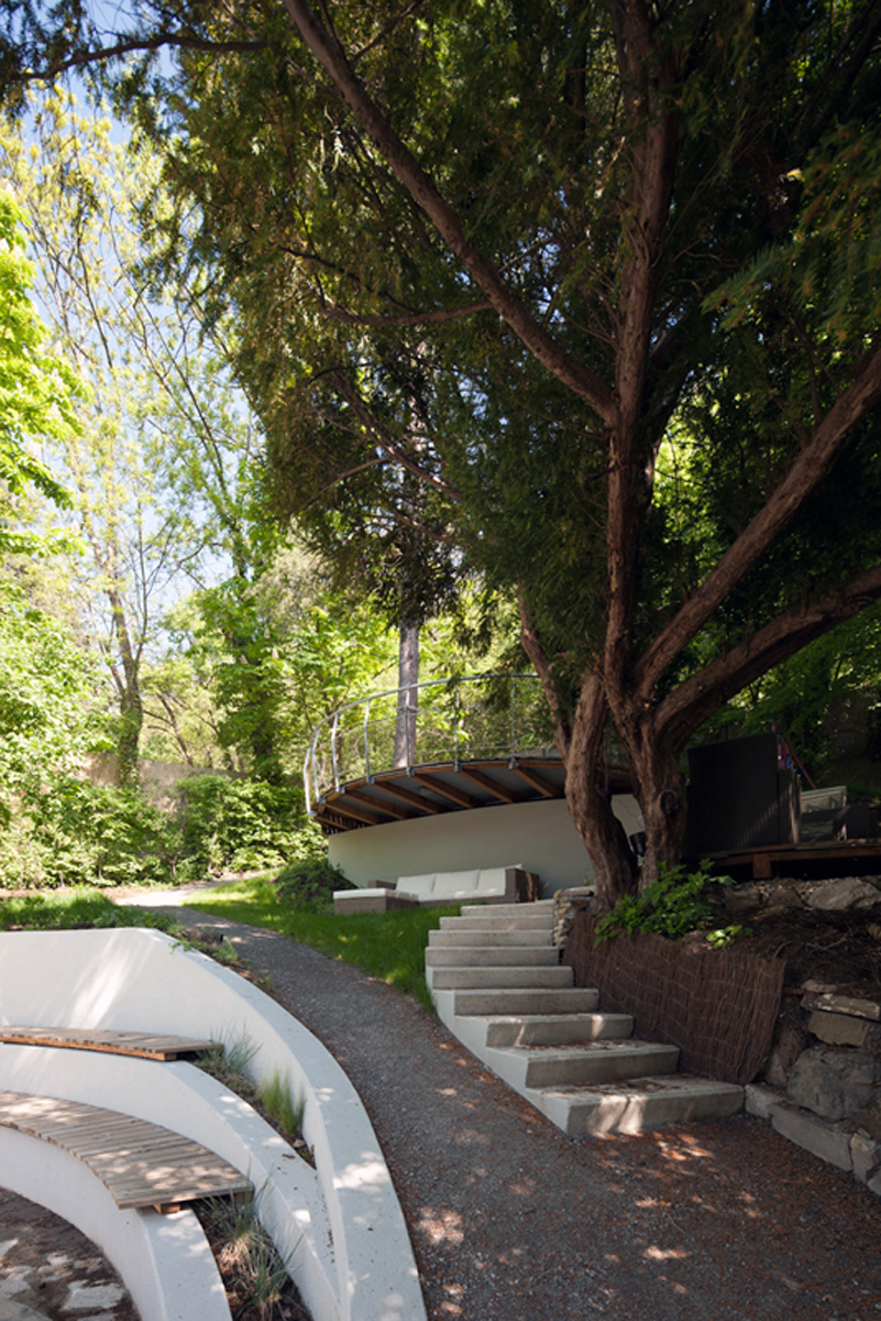 Um ein langgezogenes Hanggrundstück bequem zu erschließen, eignen sich Serpentinen am besten. Sie verlängern zwar den Weg, aber erleichtern wegen des geringeren Steigungsverhältnisses gleichzeitig den Aufstieg. In den Schlaufen bleiben kreisförmige Inseln als beruhigte Zonen übrig, die landschaftlich eine Sonderstellung einnehmen. Im Konzept werden sie freigeräumt und unter Berücksichtigung der Höhenunterschiede mit den besonderen Funktionen belegt – entweder, wo nötig, durch eingraben oder, wo möglich, durch darüberlegen. Die Bereiche, die neben den Serpentinen=Erschließung und den Kreisflächen=Aktivitätsflächen übrig bleiben, werden gärtnerisch neu ausgestaltet.