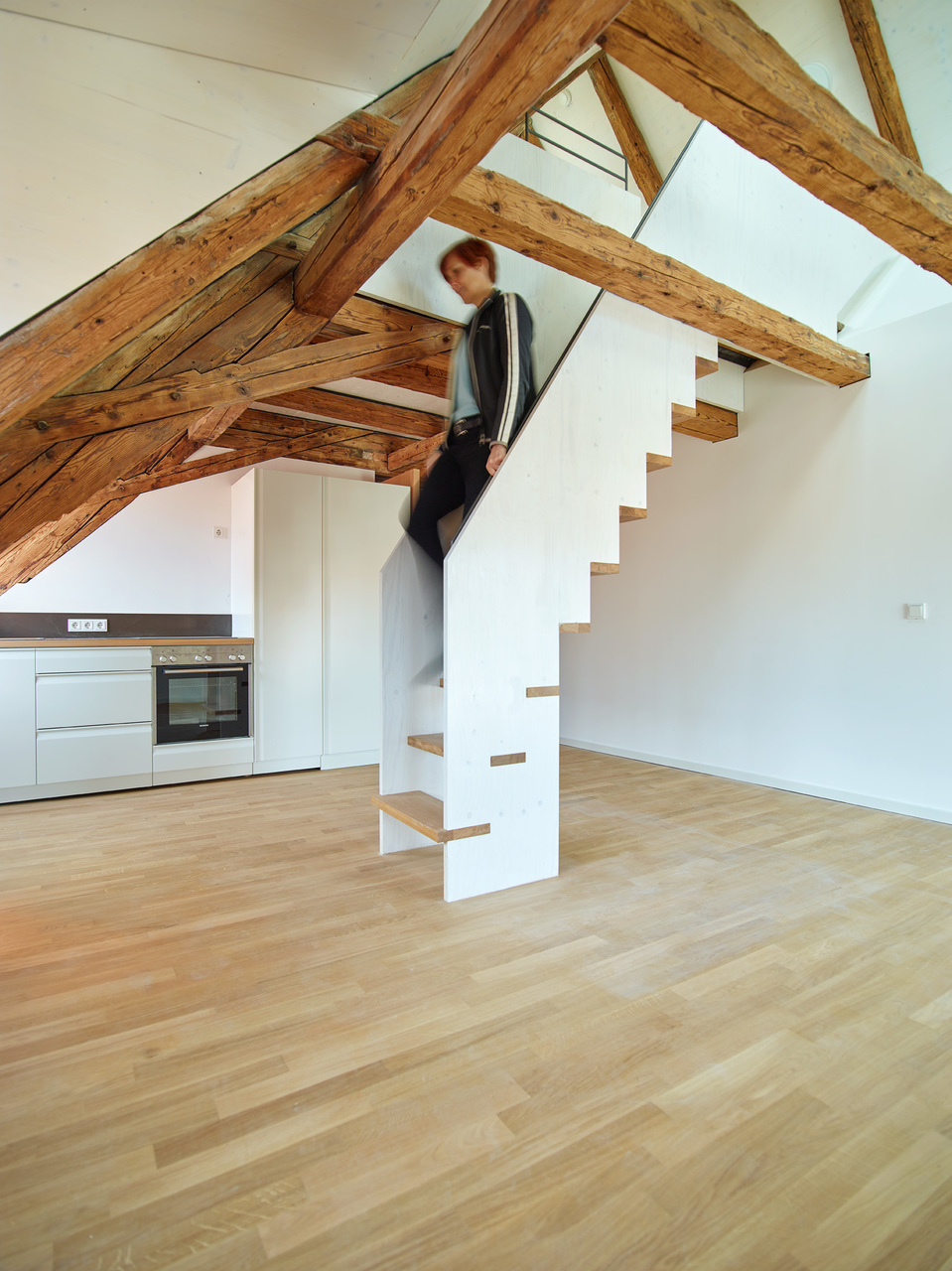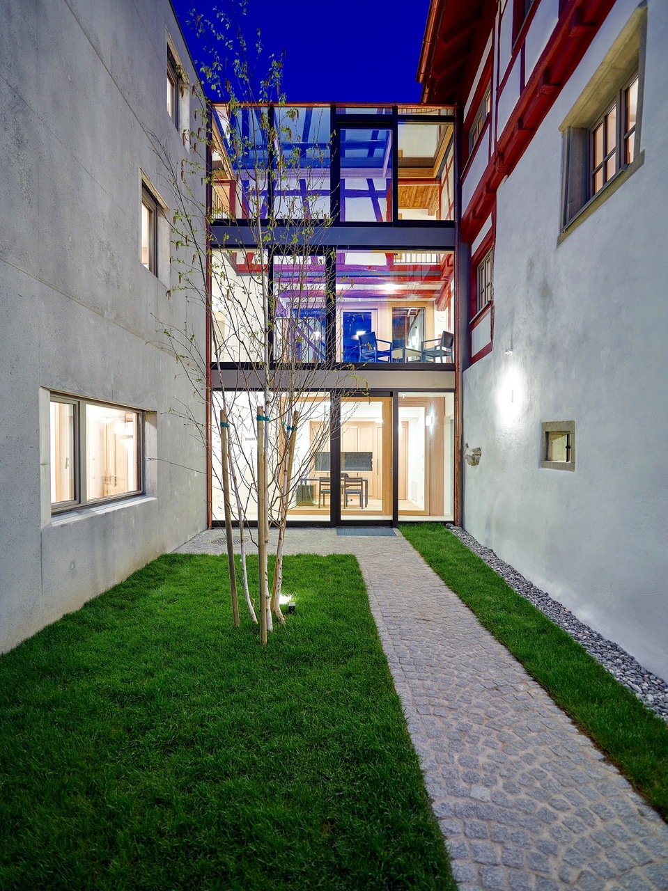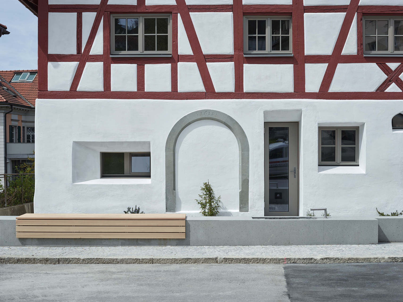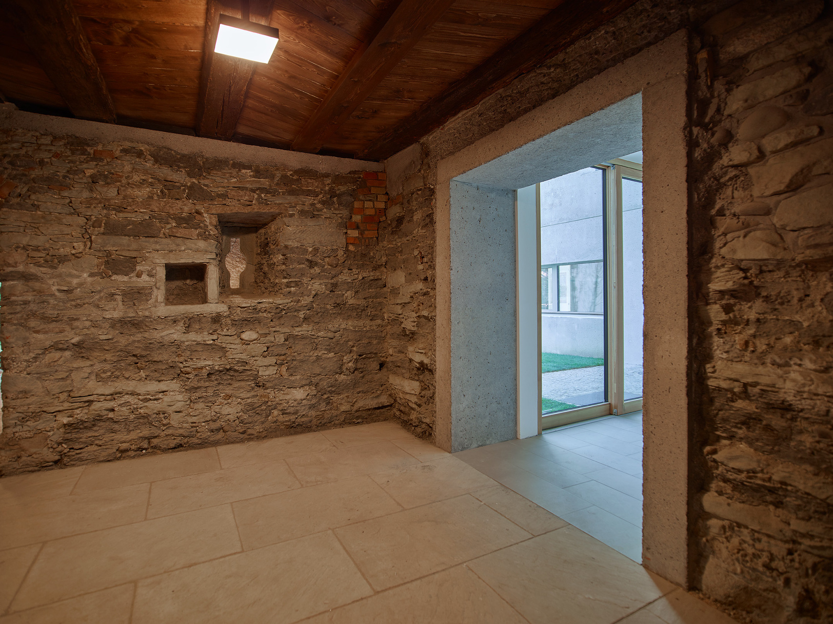 Das gesamte Gebäude wurde barrierefrei eingerichtet. Um das über viele Jahrhunderte gewachsene Raumgefüge im Altbau ideal zu nutzen, planten Wimmer Armellini auch die Innenausstattung bis ins Detail. Die Apartments bestehen aus Vorraum, Bad, Wohnbereich mit Kleinküche sowie Schlafzimmer und verfügen über je ein Kellerabteil. Der Gemeinschafts- und Mehrzweckraum ist für soziale, therapeutische und kulturelle Zusammenkünfte, intern wie extern, vorgesehen. Das gläserne Foyer als verbindendes Element zwischen den Haushälften, der Garten und der Waschraum werden ebenfalls gemeinsam genutzt. Am Vorplatz schaffen Sitzbank und Brunnen einen Ort der Begegnung. (Text: Tobias Hagleitner nach einem Text der Architekten)