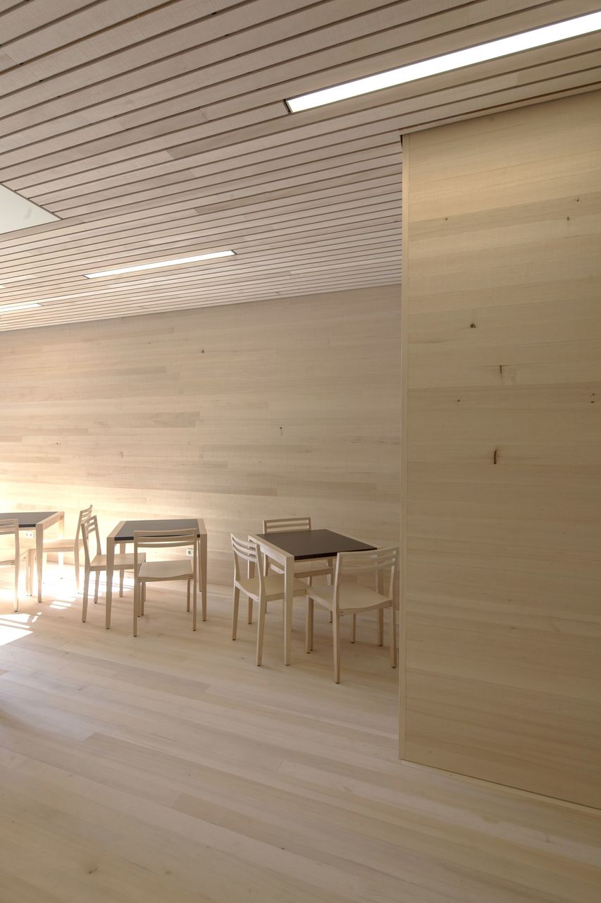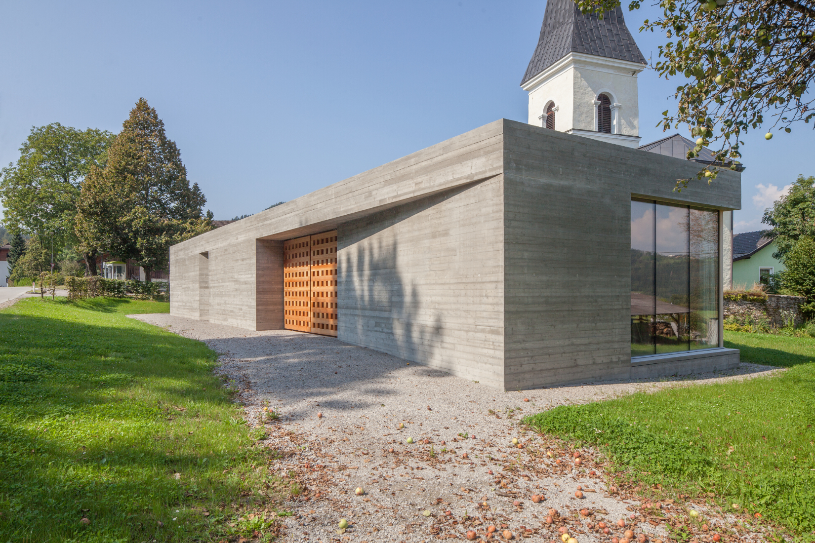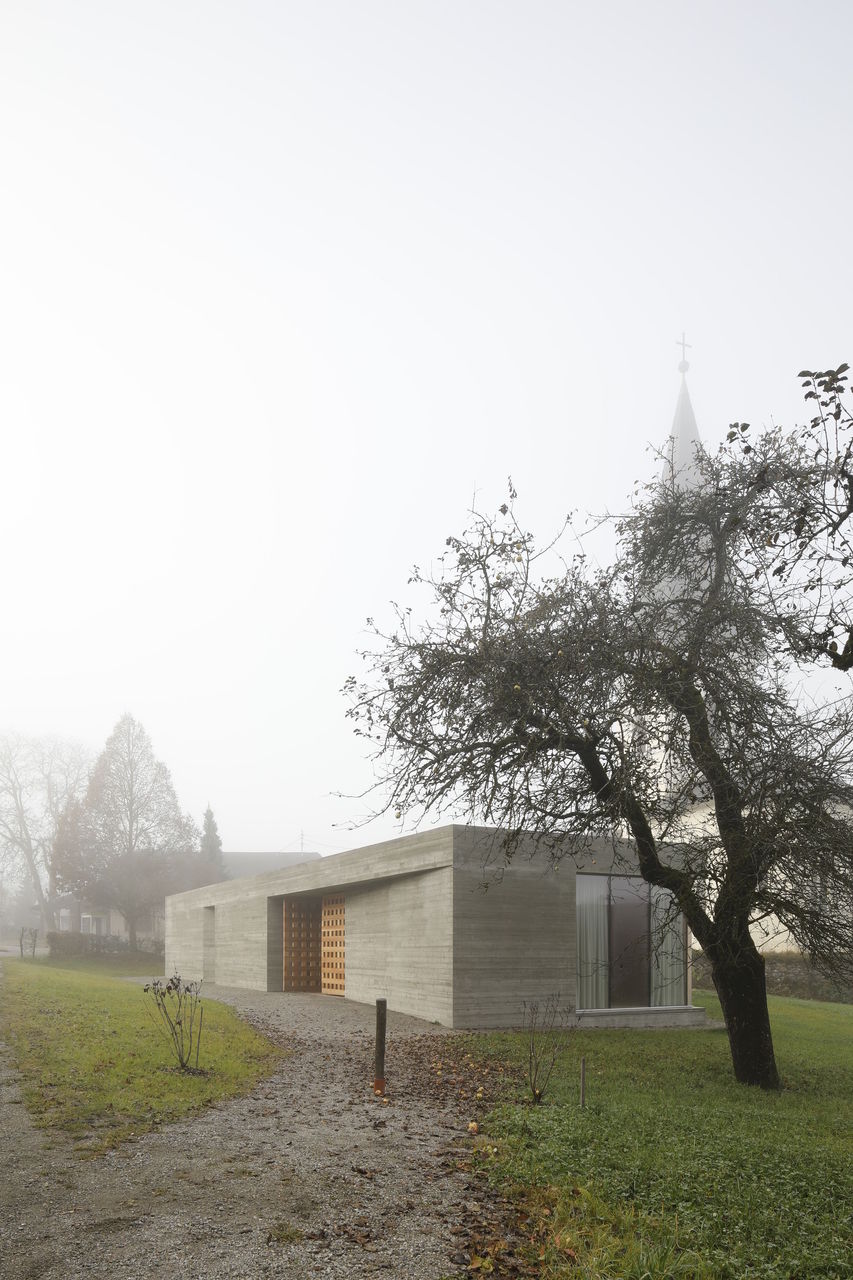 Die Architekten für dieses Projekt wurden in einem Wettbewerb ermittelt, mit einem Projekt, das sich auffällig durch seine Gestaltung ganz unauffällig neben die Kirche setzt und ihre Ansicht, wenn man auf den Ort zufährt, nicht verstellt.