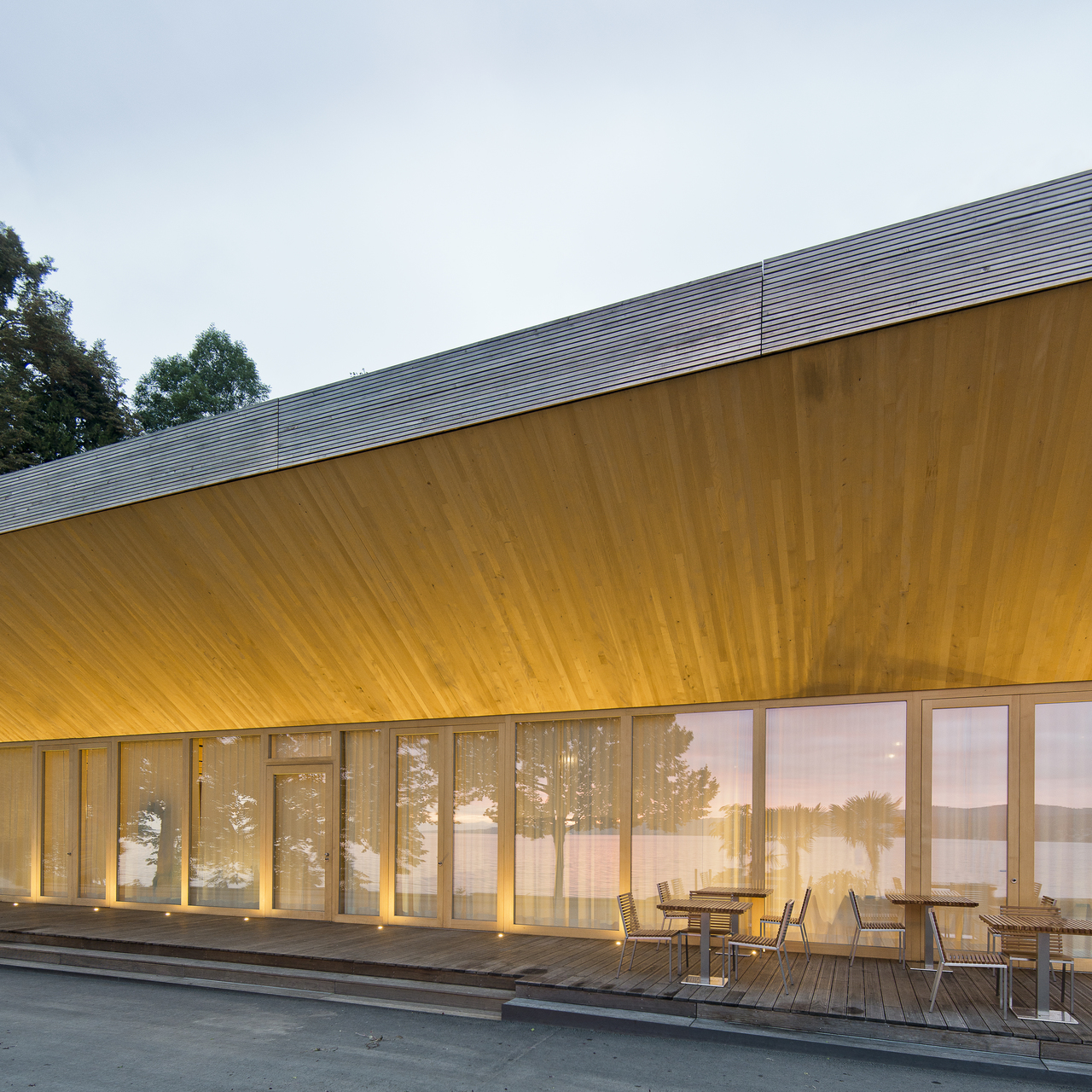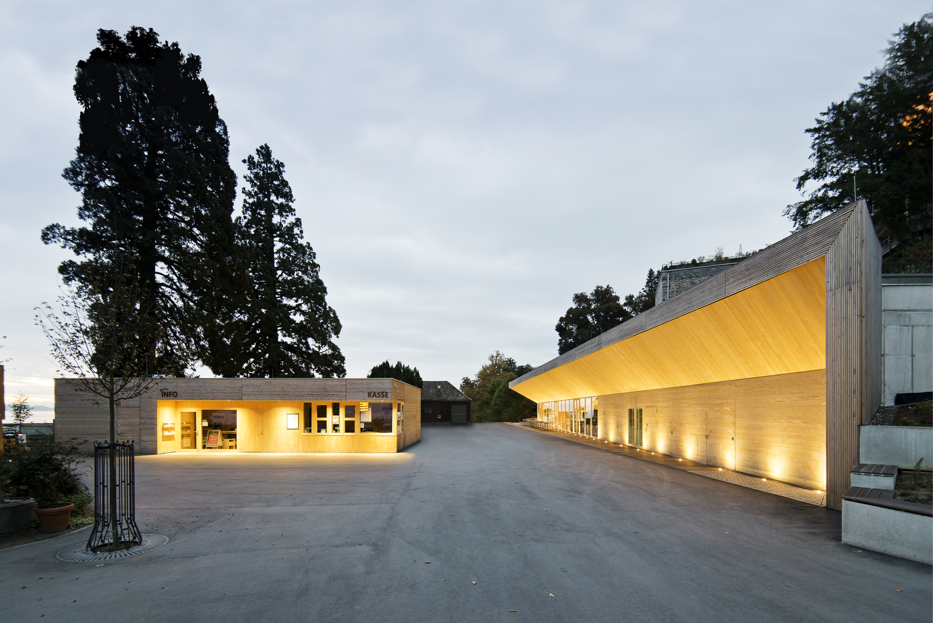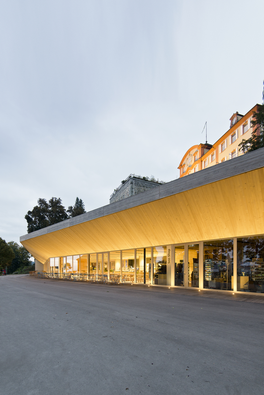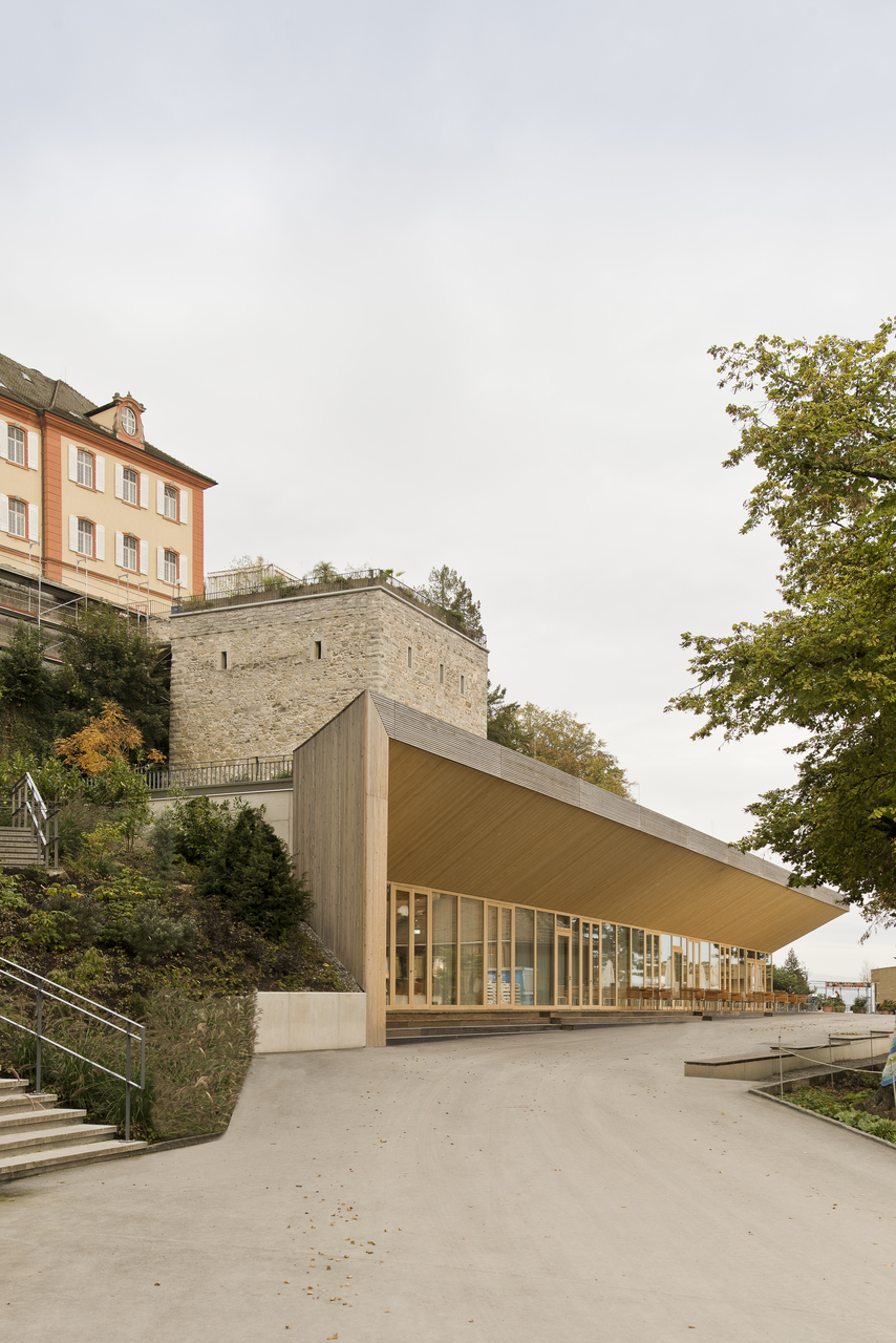 Mit maximaler Zurückhaltung wird der Hauptbaukörper in den Hang unterhalb des Schlosses integriert. Die sichtbare Bebauung am Hafen nimmt jetzt weniger Platz ein, es entsteht jedoch ein neuer Dachgarten mit Weitsicht über den Bodensee. Das 104 Meter lange, verglaste Fassadenband mit seinem mittig geknickten Vordach determiniert die Außenwirkung des Gebäudes. Das signifikante Dach verjüngt sich zum Innenraum wie ein Trichter. Es kragt zwischen 1,6 und 4,5 Metern aus, die Neigung verändert sich daher über die gesamte Länge in sanfter Verwindung. Die Holzkonstruktion ist an der Unterseite in Tanne und oben (Witterungsseite) in Lärche verkleidet.