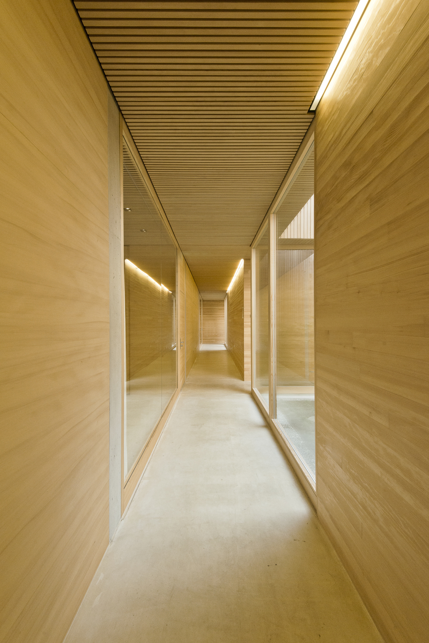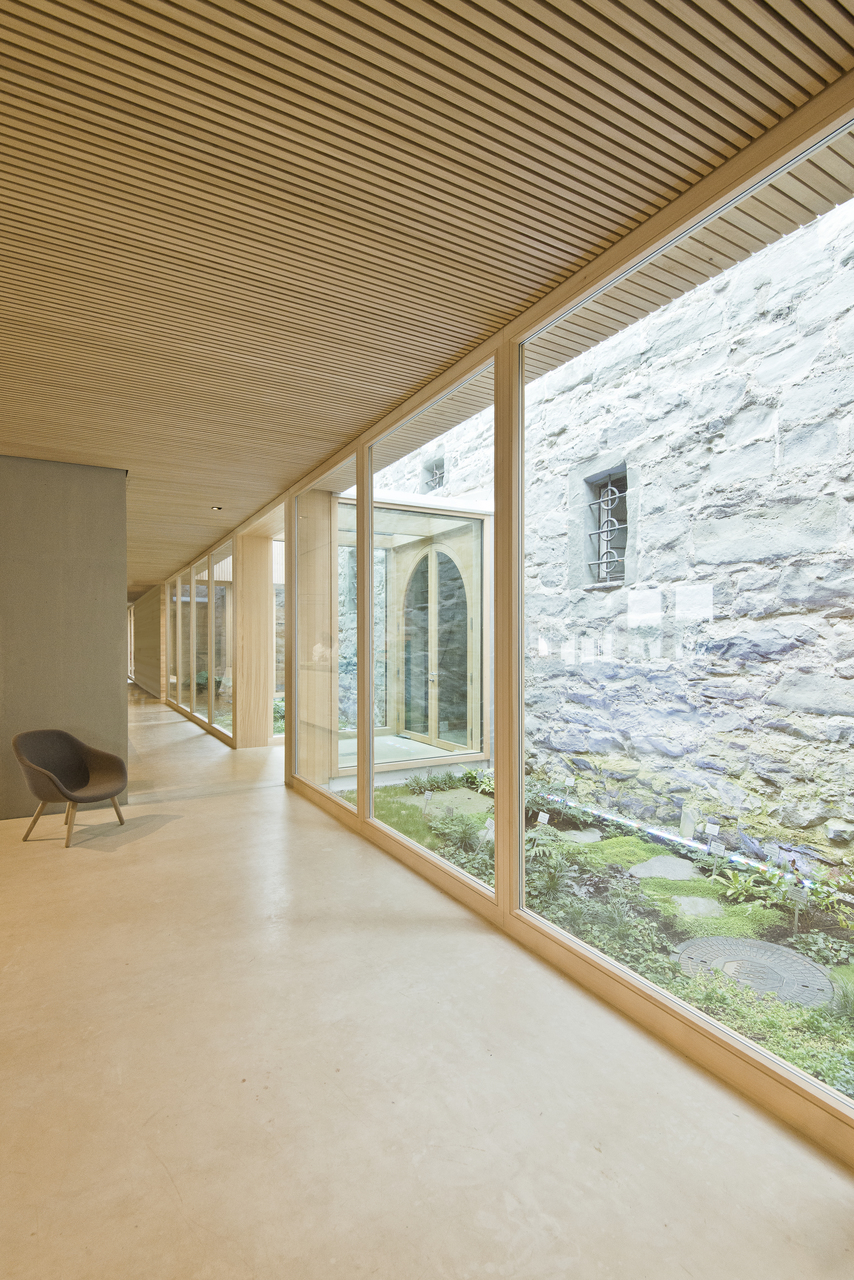 Der Besucherbereich des Hauses ist als ein großer Raum erlebbar, der durch flexible Teilungen zoniert wird. Vier in den Hang eingeschnittene Höfe bringen zusätzliches Licht in das Innere und spielen den Comturey Turm frei, sein Sockelbereich ist damit im Inneren erlebbar. An Materialien finden sich: am Boden ockerfarbener Magnesit-Estrich; Wände, Decken und Einrichtung in Weißtanne; raumhohe Fenster mit Fichtenprofilen.