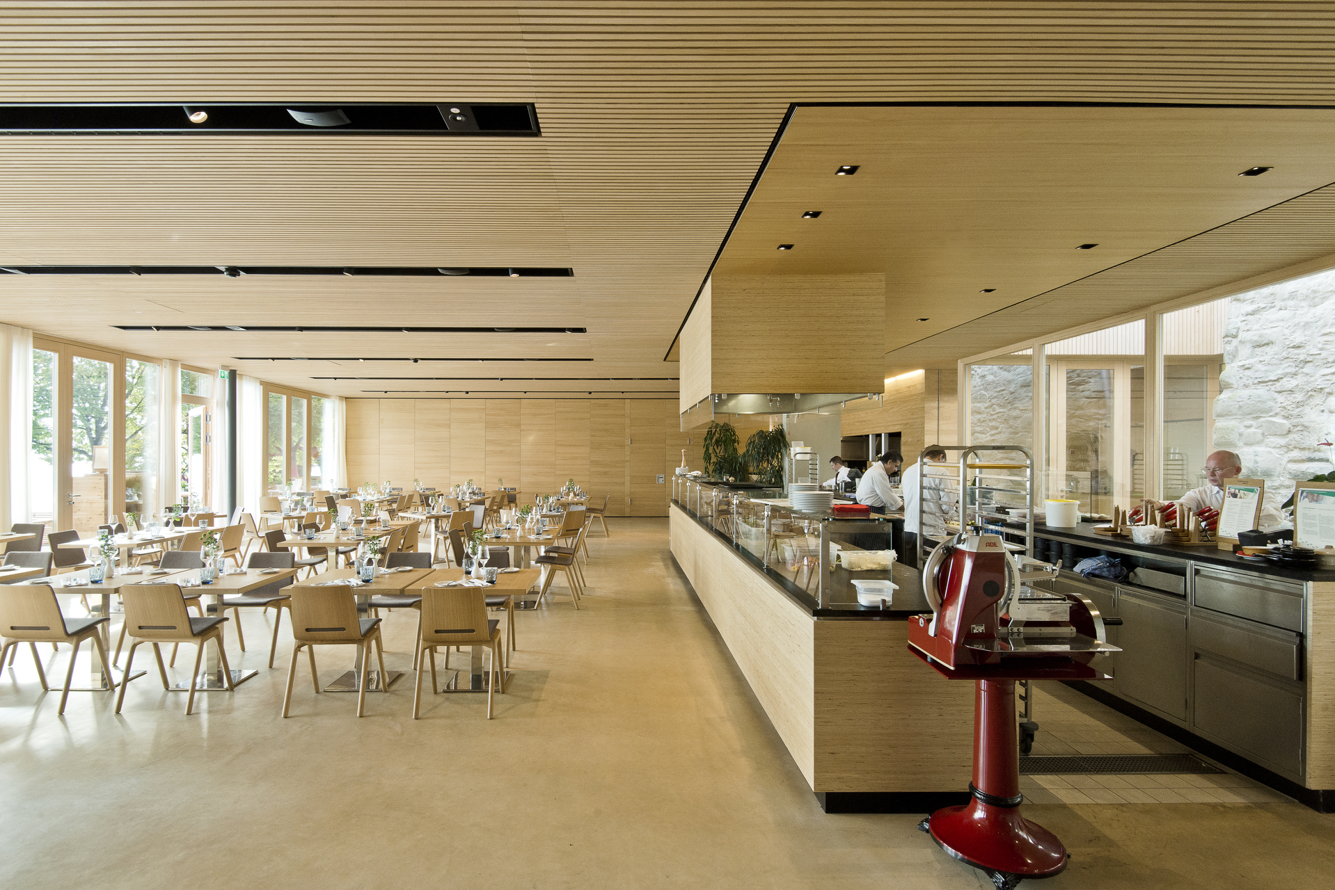 Ohne Kreuzung mit den Gastbereichen erfolgt die interne Versorgung von der Hangseite aus. Unter dem Schloss eingebettet, sind die erdberührenden Seiten des eingeschoßigen Hauptgebäudes in Beton konstruiert, das Erdreich ist gleichzeitig natürliche Wärmedämmung. Auch der historische Torkelkeller schließt - nach Fertigstellung der Sanierungsarbeiten im zweiten Bauabschnitt - beim Neubau an.