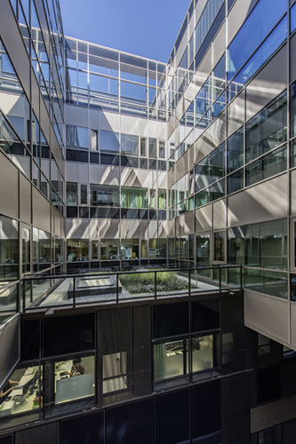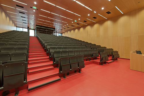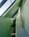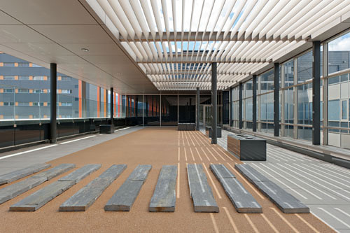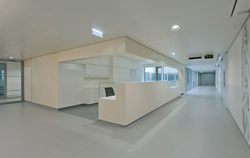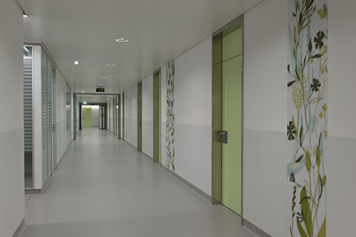 Um eine höchstmögliche Flächeneffizienz zu erreichen, ist das Gebäude zweihüftig erschlossen. Im Kernbereich befinden sich die Stiegenhäuser und Aufzüge sowie Nebenräume ohne Tageslichtbedarf. Zwei großzügige Lichthöfe versorgen den Erschließungskern bzw. angegliederte Arbeitsräume mit Tageslicht. Helle Räume mit farblich abgestimmter Möblierung und Einrichtung schaffen ein angenehmes Umfeld, das entsprechend zur Gesundung der Patienten beitragen soll. Zudem gibt es für Patienten und Mitarbeiter einen großzügigen, geschützten Dachgarten. (Text: Claudia Wedekind)