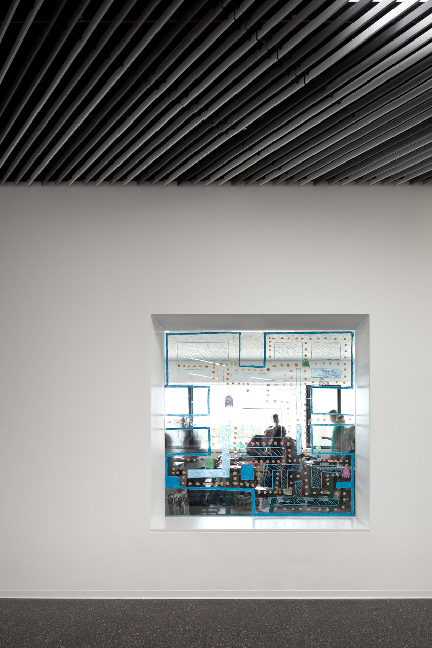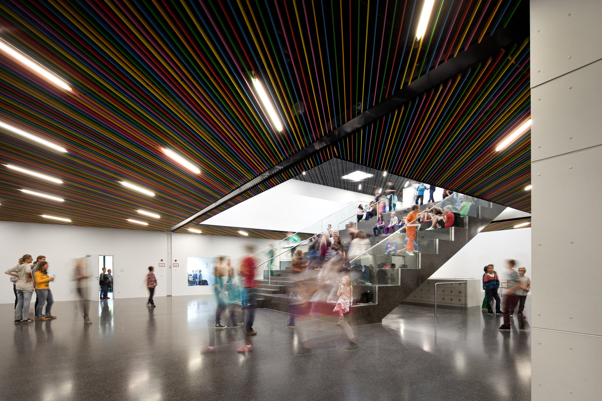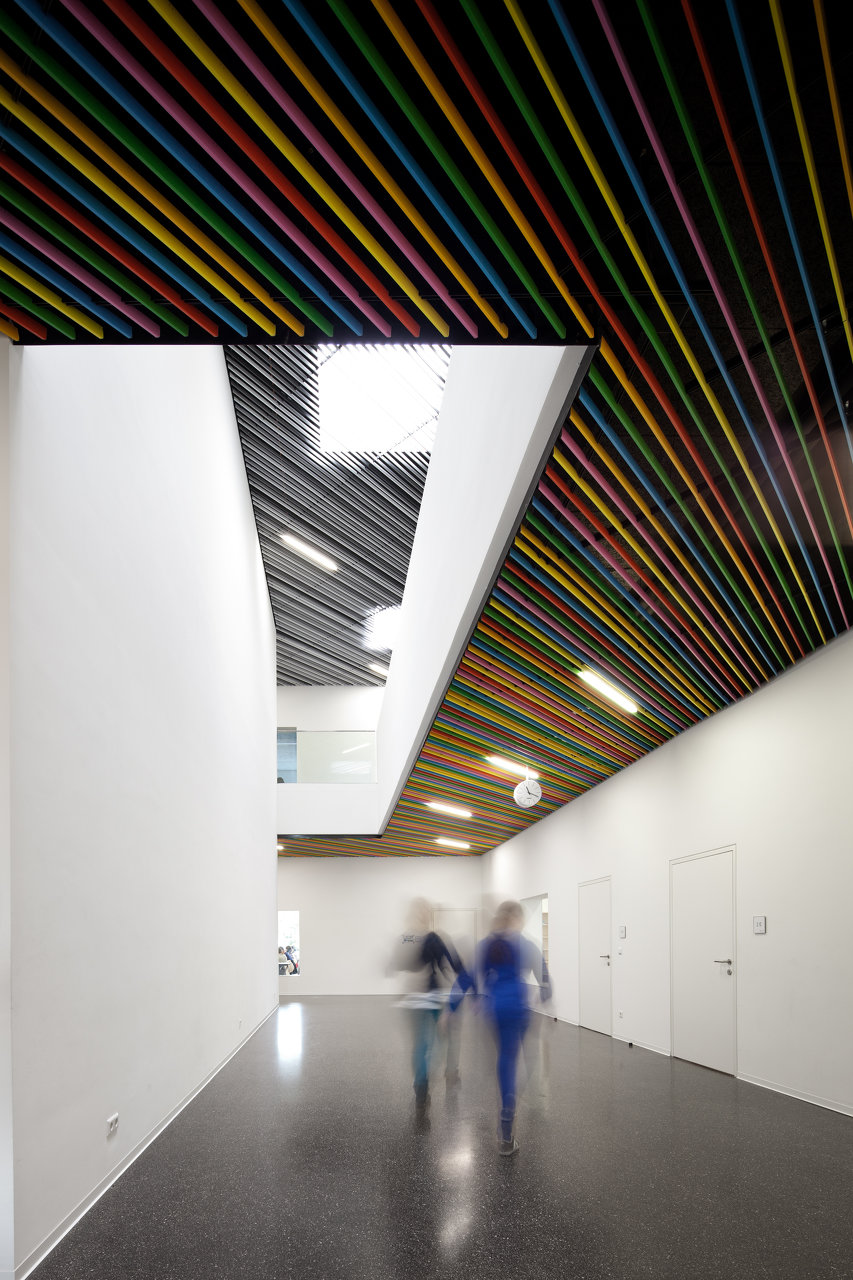 Die bunte „Jollystift Decke“, diagonal verlaufende Aluminiumlamellen vor schwarz gestrichenen Herakustikpanelen, ist nicht nur im wahrsten Sinne schräg, sie ist das Gegenteil von Grau und schluckt den Lärm, den viele Kinder nun einmal produzieren. Sie taucht immer wieder in den Gebäudeteilen als verbindendes Gestaltungselement auf, sogar bis unters Vordach hinaus. Manche sagen, sie ist zum Wahrzeichen der Schule geworden.