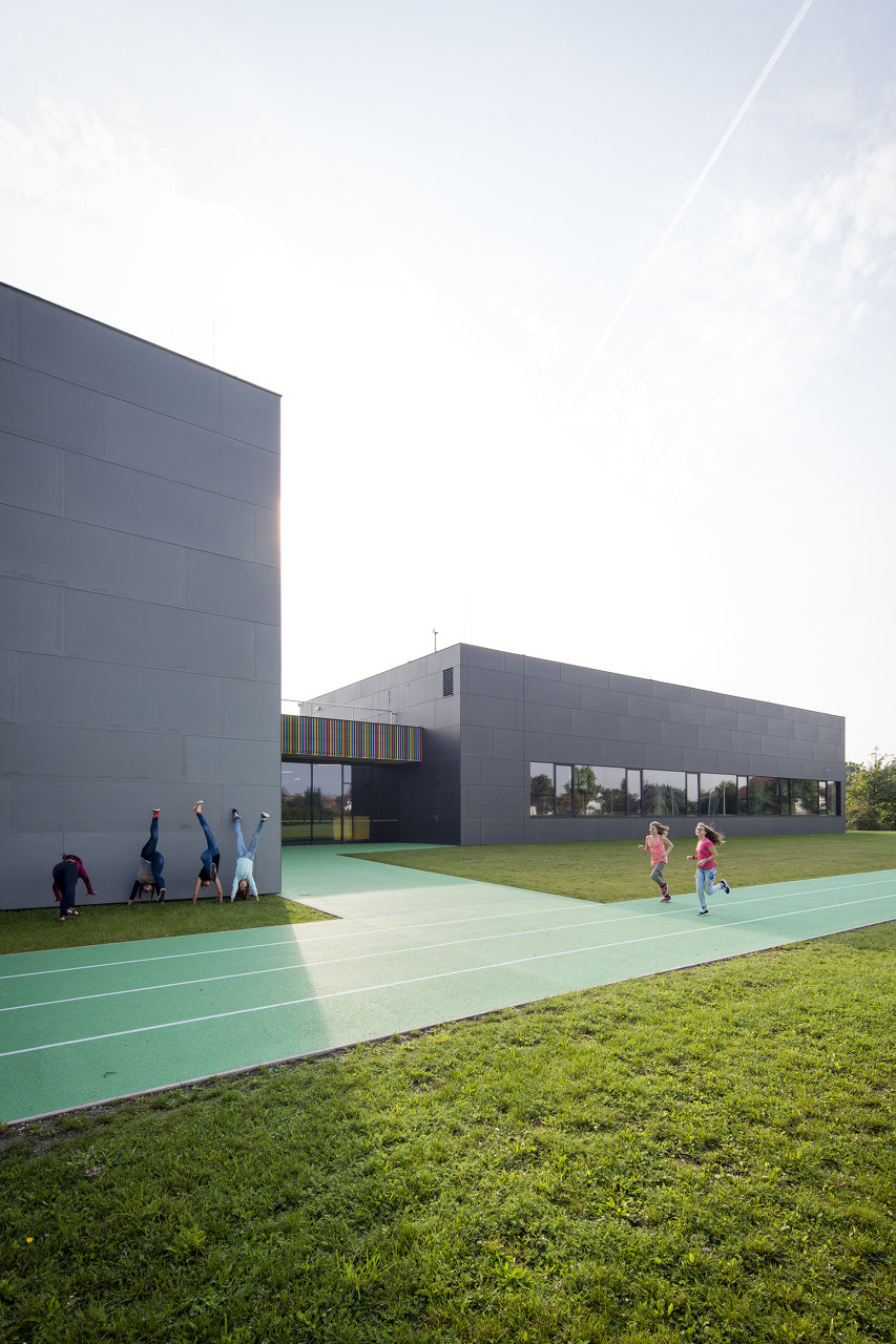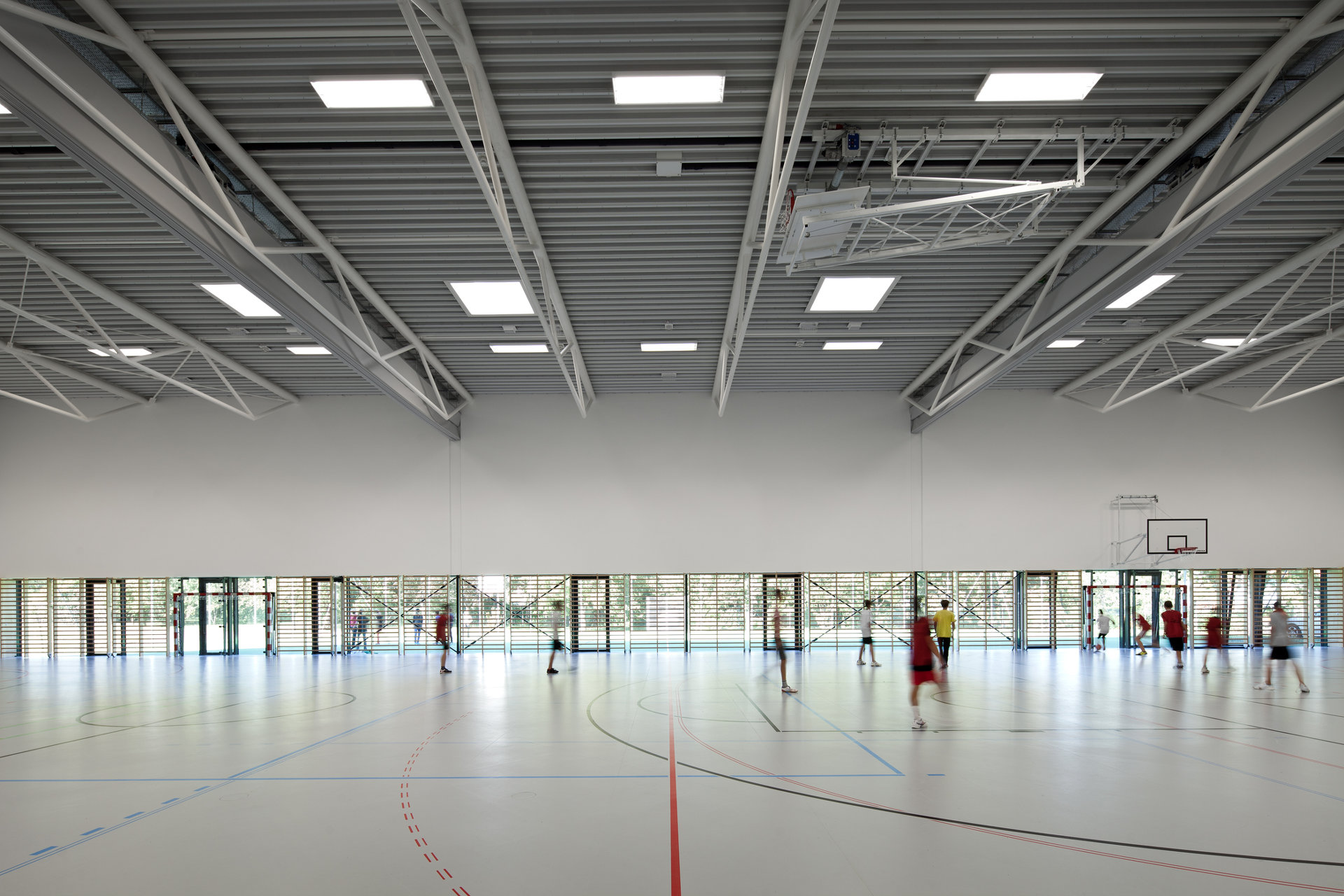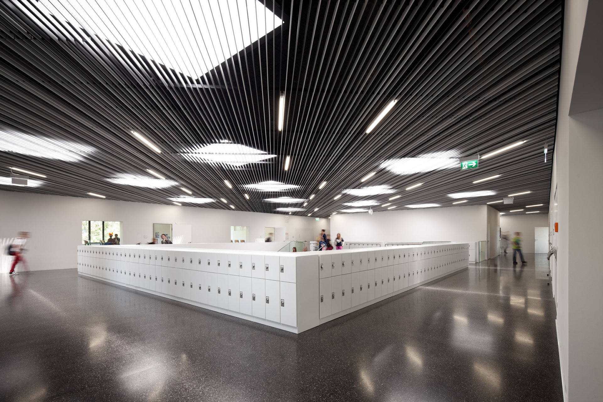 In den Umkleideräumen, Duschen und Toiletten im hinteren Teil ziehen sich die Schüler:innen für den Sportunterricht um und laufen auf direktem Wege, auf gleicher Ebene, zu einem der zwei angrenzenden Turnhallen oder den Sportplätzen ins Freie. Durch die so zueinander gesetzten Gebäudeteile entstanden vielfältige Außenräume, Nischen und Freiflächen.