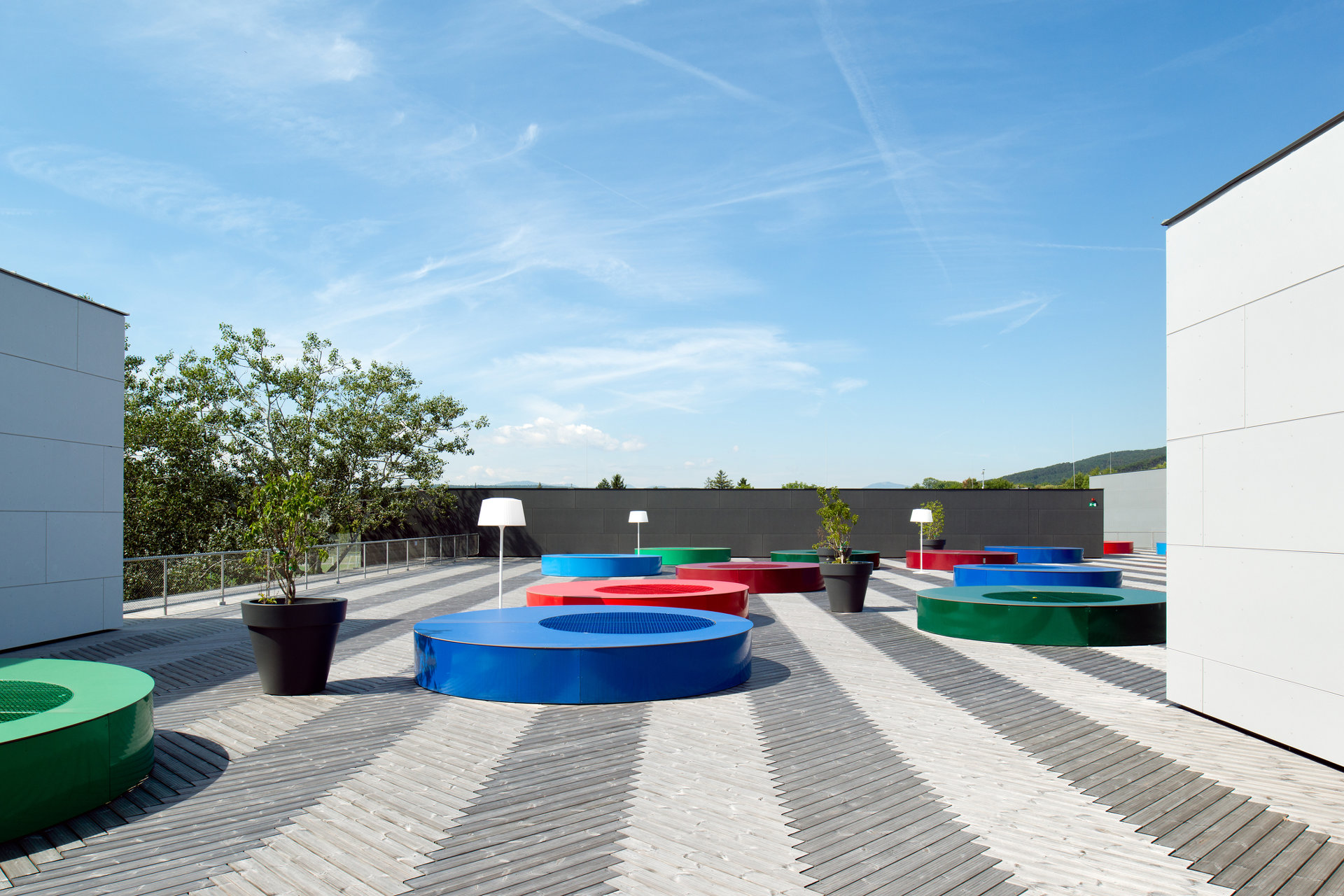 Ein Element, das franz im Bildungsbau immer gerne einsetzen, ist die Dachterrasse. Diese wurde auf dem Flachdach der Aula platziert. Auf den runden bunten Sitzinseln, die zwischen Pflanzentrögen stehen, können Schüler:innen entspannen, für den nächsten Test lernen, dem Unterricht unter freiem Himmel lauschen oder den Mitschüler:innen beim Sportunterricht auf den Plätzen darunter zuschauen. (Text: Architekten, red. bearbeitet)