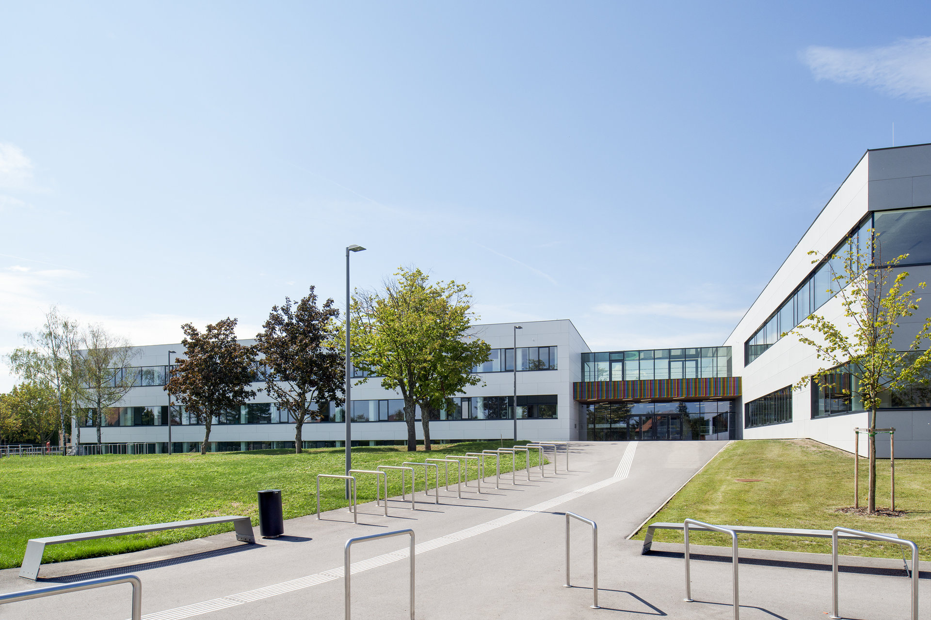 Nach dem Teilabriss der nicht mehr brauchbaren Bereiche und der Sanierung des restlichen Gebäudes aus den siebziger Jahren, wurden ergänzende Trakte wie ein Windrad um die neue, zentrale Aula (fünfzig Meter lang, sechzig Meter breit) angeordnet. In sie wurde ein amorph geformtes Gebilde gestellt, denn Eckiges gab es ohnehin schon genug. Hier residieren die Bibliothek neben dem Mehrzweckraum.