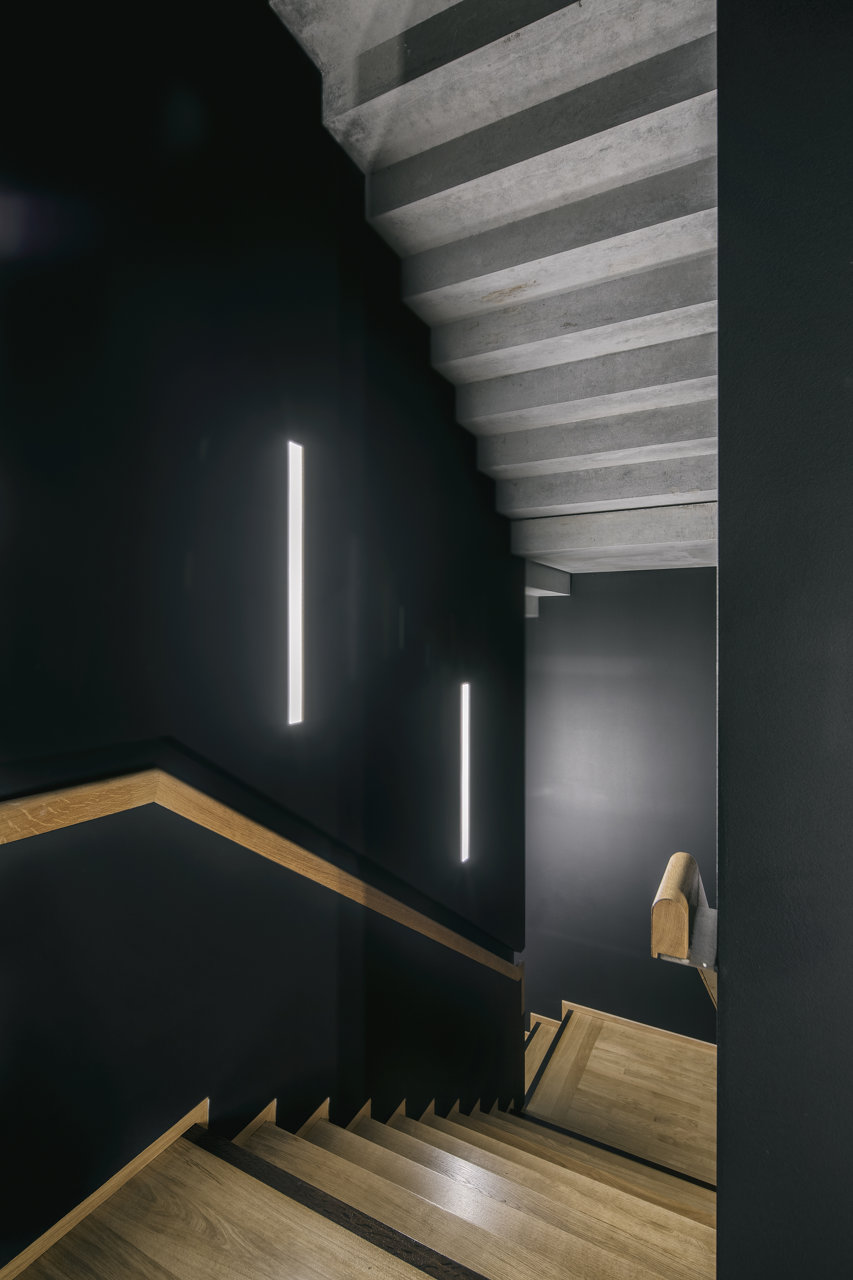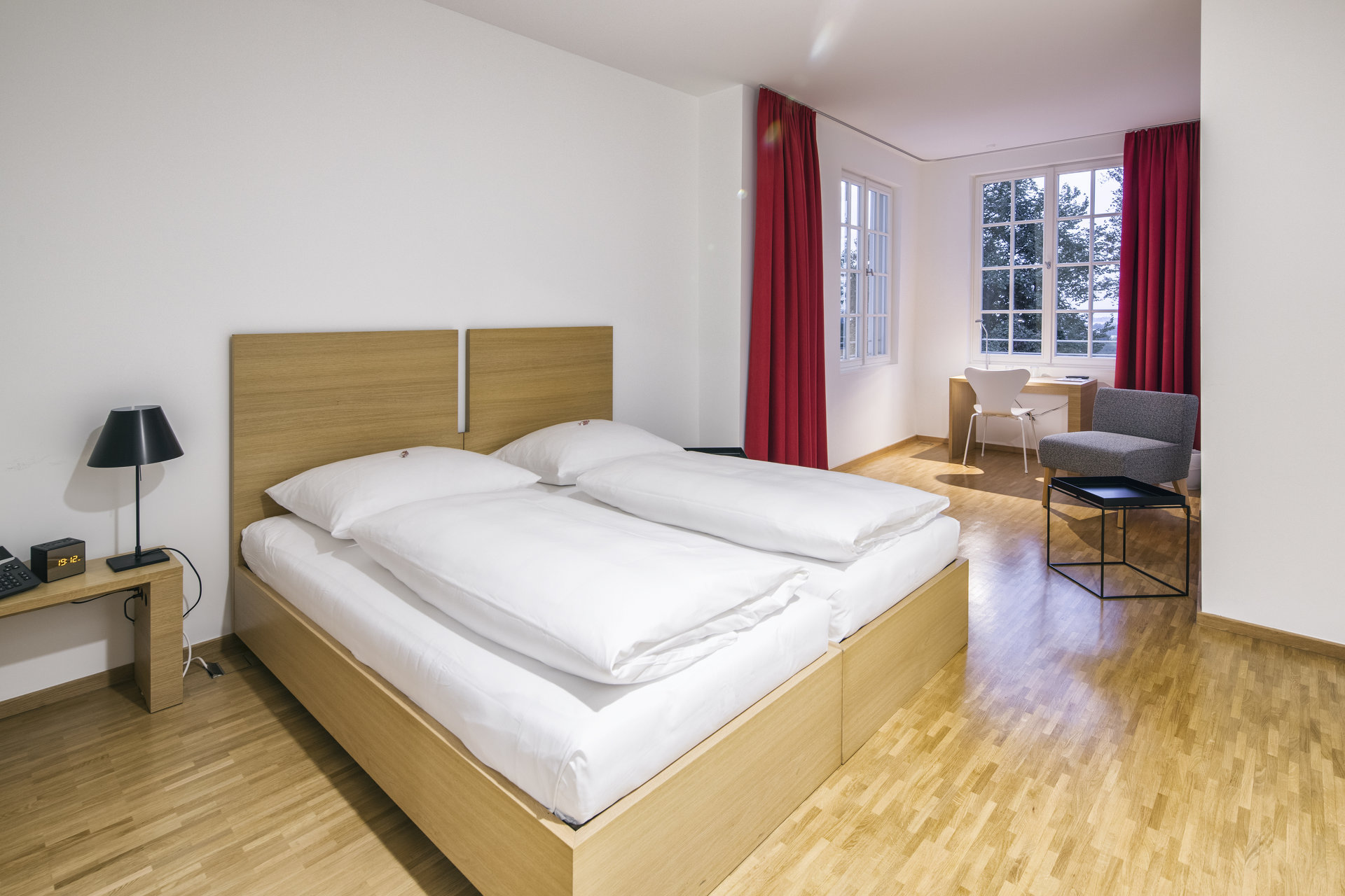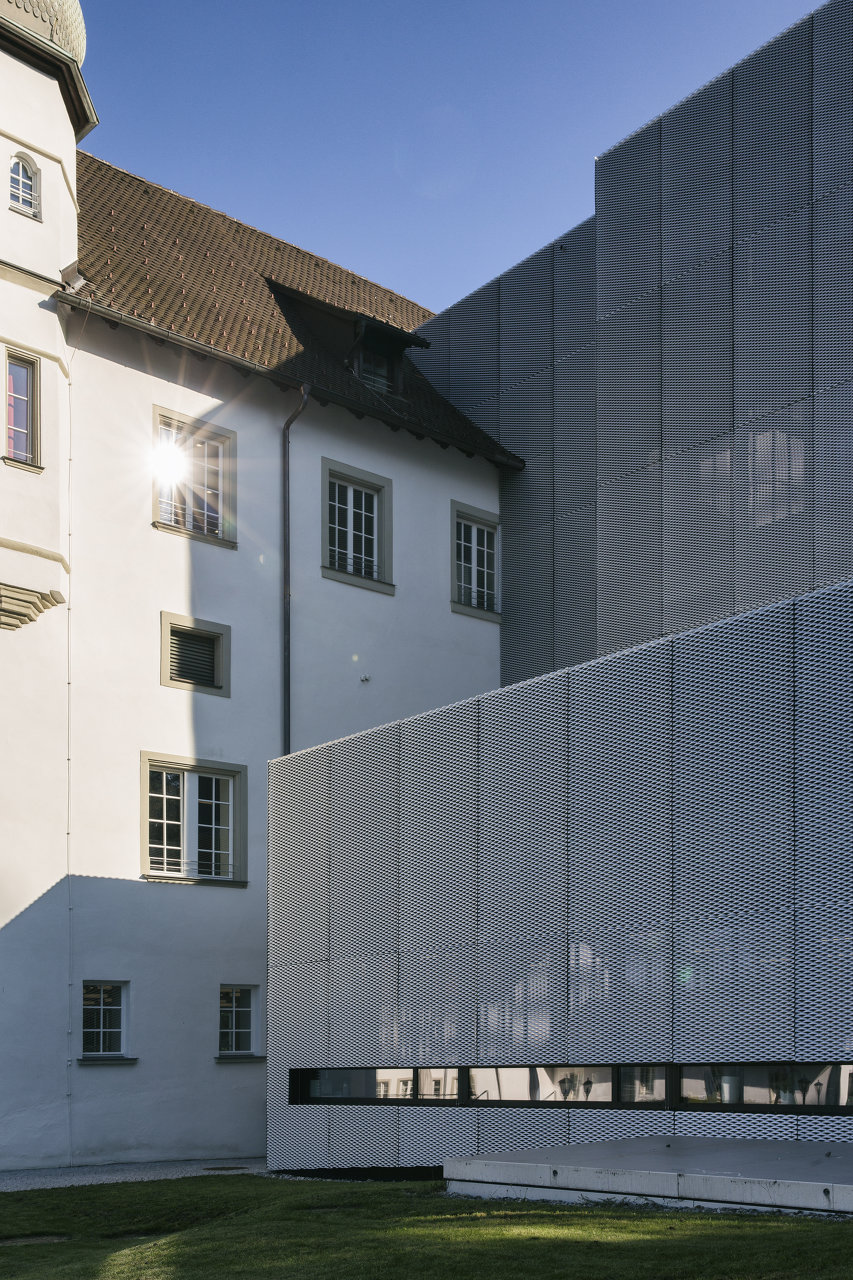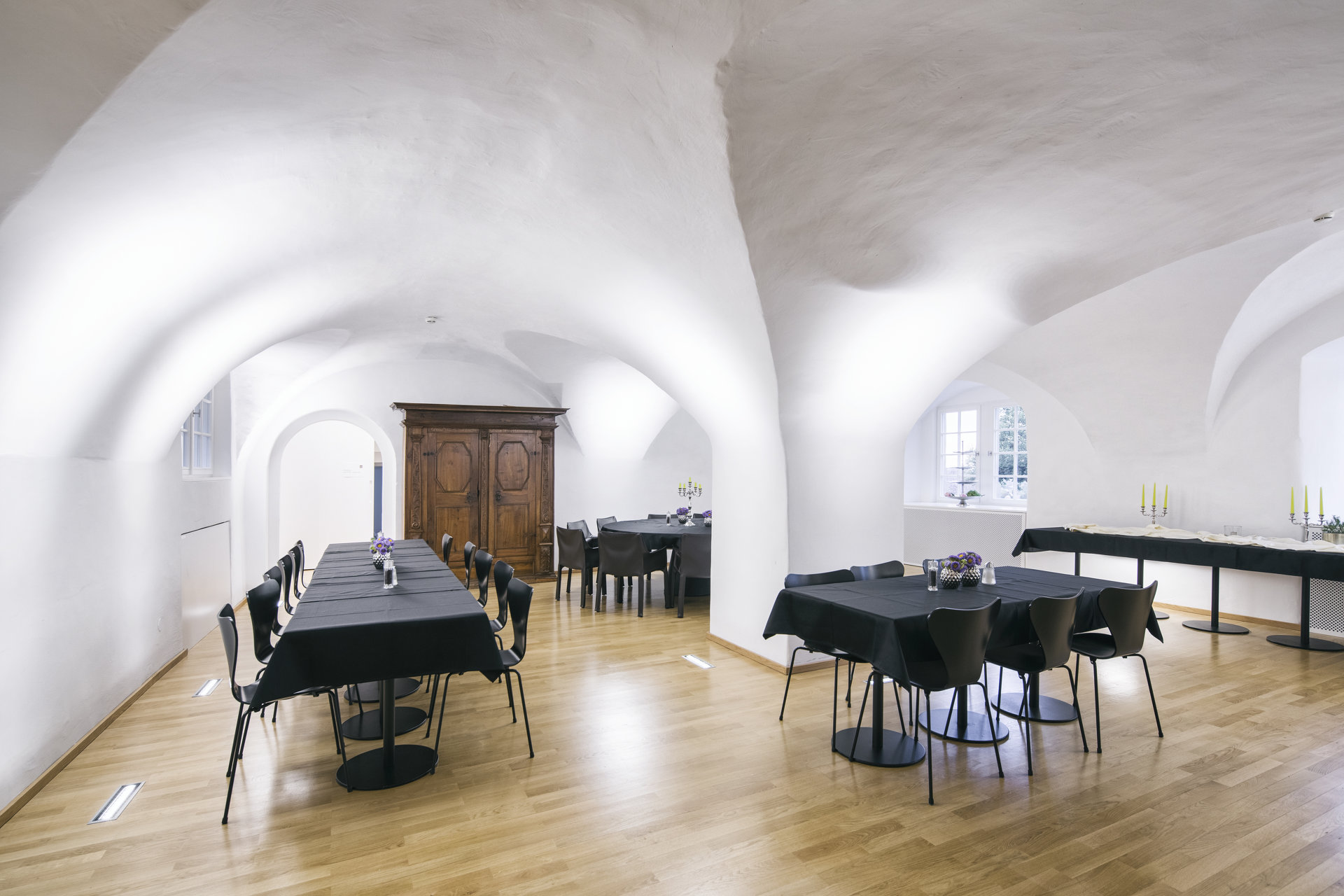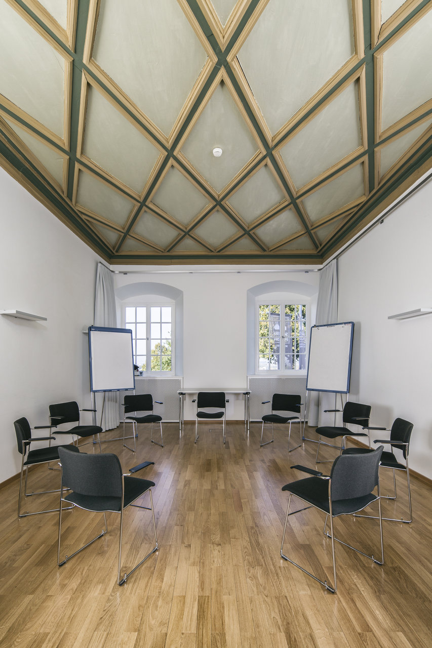 Im Erdgeschoß, unter alten Deckengewölben, befinden sich nun Rezeption, Café und Restaurant mit Bar. Darüber sind die 13 unterschiedlich großen und individuell ausgestatteten Seminarräume angeordnet. Im zweiten Stock und unter dem Dach wurde Platz für 31 schlichte Gästezimmer geschaffen. Küche, Technik, Lagerräume und die vertikale Erschließung über Treppe und Lift wurden hingegen in zwei neue Ergänzungsbauten mit insgesamt 500 m² Fläche ausgelagert. Teilweise im Hang versteckt, wurden sie mit lichtdurchlässigen Alu-Streckmetallgittern umhüllt. Als hermetische Kuben treten die seitlich und rückwärtig angedockten Neubauten selbstbewusst und in formaler Kompromisslosigkeit auf, ohne das historische Haupthaus mit den markanten Zwiebeltürmchen zu bedrängen. (Text: Tobias Hagleitner)