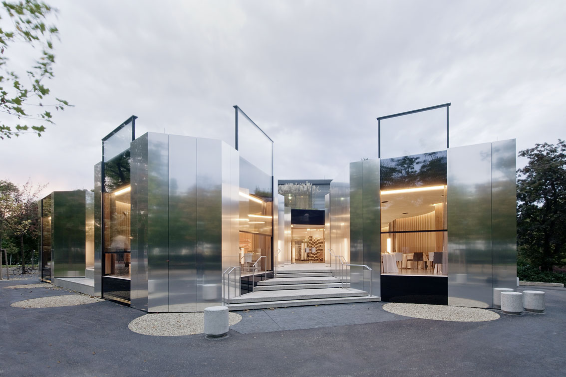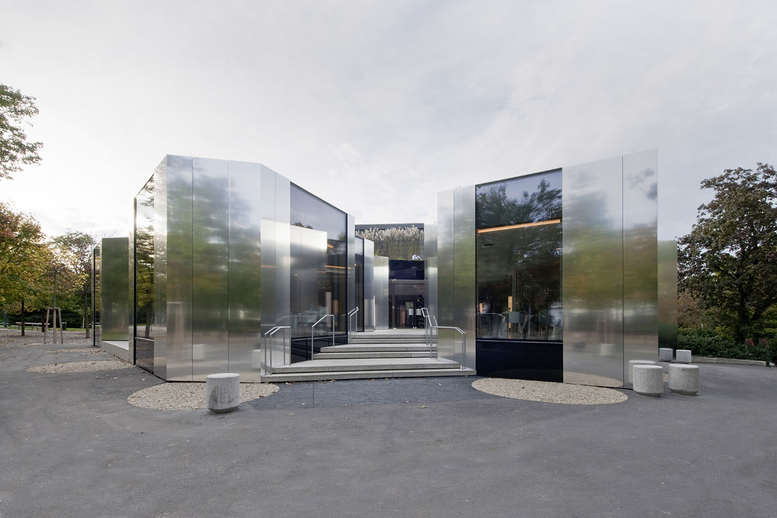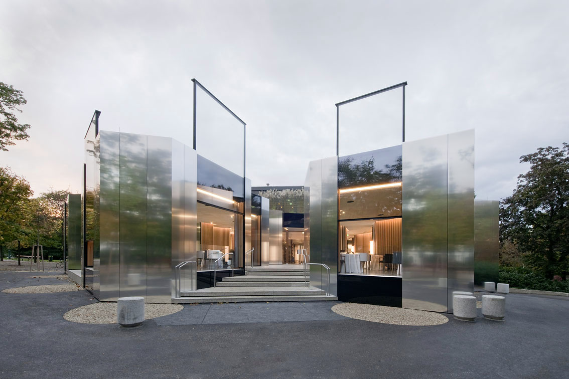 Ein wichtiges Kriterium für die Familie Reitbauer war die Nähe zum Park: Durch die ausladenden Pavillons, deren elektrisch betriebenen großen Hebefenster und durch die wie mit Tau beschlagene, leicht reflektierende Metallfassade konnte diese Nähe atmosphärisch erzeugt werden.